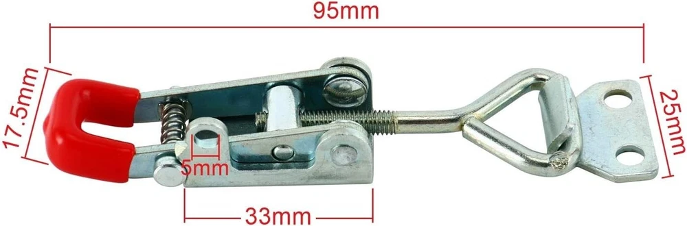 Product Description Specifications: Model: 4012 Size:2.7''*0.8'' Locking Load: 1KN; Ultimate Load:3KN ; Material : Metal, Plastic ; Finish:Zinc-plated/Polish ; Color: red, Silver Tone ,Weight : 500g Use: Convenient to operate,adjustable latch ,locking force is adjustable Unique Self-lock Adjustable Hand Tool ,prevent the latch accidental opening Plastic cover handle for easy, safe and comfortable operation. Widely used in different fields,vehicle,packing case,mechanical equipment,oscillatory machine. Package included:20 PCS 4012 Cabinet Box Lever Handle Toggle Catch Latch Lock Clamp Hasp