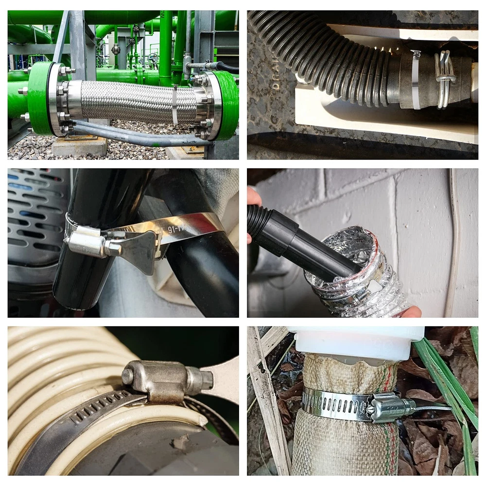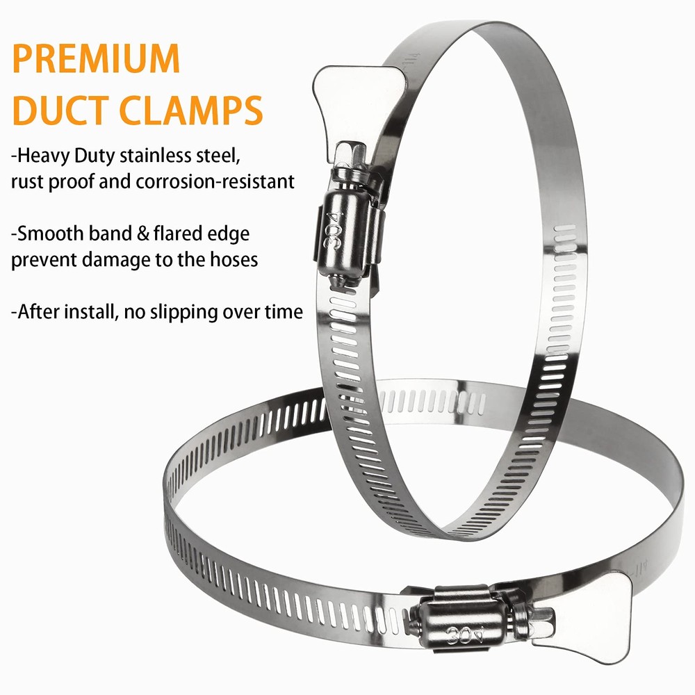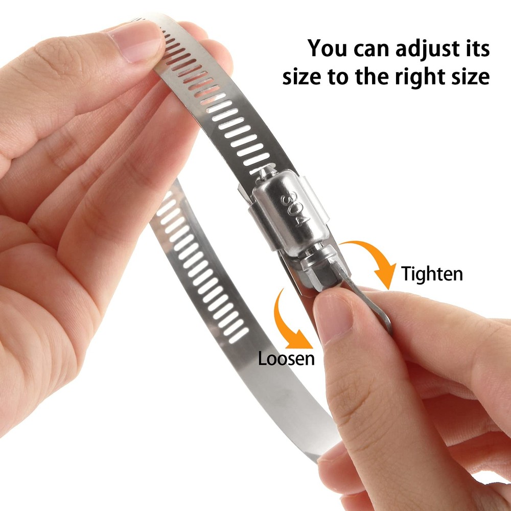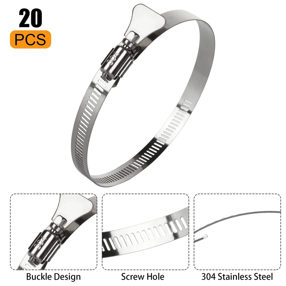 20 PCS Hose Clamps, 304 Stainless Steel Hose Clamps, 4 Inch Duct Clamps Worm Gear Adjustable 91-114mm Hose Clamp, Fuel Line Clamp for Plumbing, Automotive and Mechanical Applications Why Choose Us? * High Quality Material: These fuel clamps are made of high quality 304 stainless steel, rust-proof, water-proof, corrosion-resistant for long lasting use * Easy to Use: Easy to tighten or loosen without any other tools for easy installation * Multi-Uses: The hose clamps stainless steel can be applied to secure hoses, pipe, cable, tube, automotive, industrial, boat, etc; * Perfect Seal: The duct clamps are locking secure and tight, which provides an excellent seal for variety of hose materials, effectively solves the problem of liquid and gas leakage of the hose * Great Value: You will receive 20 pcs 4 in fuel line clamps, large quantity set products achieve great favorable price Specification of Hose Clamps: Material: 304 Stainless Steel Diameter Range: 91-114mm/3.5 - 4.5 in Band Width: 12mm/0.5 in Color: silver Package included 20 x Stainless Steel Hose Clamps 304 STAINLESS STEEL DUCT CLAMP- The whole duct clamp (including the band, housing and screw) are all made of premium 304 stainless steel; Salt resistant, anti-rust, anti-corrosion, waterproof, oil-proof; These adjustable hose clamps are sturdy, strong and reliable FLEXIBLE ADJUSTABLE SIZE RANGE- The 4-inch stainless steel hose clamps can be adjusted from 91-114mm / 3.5-4.5 inch; This pipe hose clamp are flexible and ductile for using; Secures ducting tightly in place WIDELY USE- The worm drive clamps are widely used in securing ducting, dryer vent, hoses, pipe, cable, tube, fuel lines etc; Perfect to apply in automotive, industrial, mechanical, agriculture, boat/marine, shield, household etc; Both indoor or outdoor use PACKAGE INCLUDES- The stainless duct clamp kit comes with totally valued 20 pieces hose clamps with adjustable size range from 91 mm to 114 mm, perfect for hose outside diameter 91-114mm / 3.5-4.5 inch; Enough quantity for your restoration projects ADJUSTABLE STYLE- These stainless worm gear hose clamps with a worm-drive lock, easy to use, don’t need any tools to tighten or loosen; You can adjust the size according to the diameter of the pipe, and you can install and remove DIY pipe hose clamps at any time