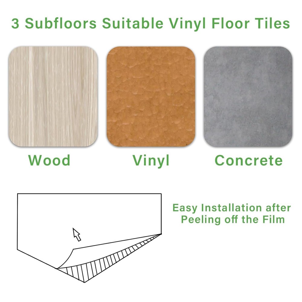 20-Pack Peel and Stick Floor Tiles Vinyl Floor 12 x 12 inch [Ultra-realistic Surface Texture Restoration]: Realistic texture and a durable surface with excellent wear resistance; the surface won't scratch easily, doesn't retain stains, and is easy to clean. [Thickened PVC Layer for Good Support]: Waterproof floor tiles design with a 0.05 inch thickened PVC layer, which can effectively cover slightly uneven surfaces. They offer strong support, preventing easy curling, while also providing excellent waterproof and stain-resistant capabilities. [Strong Adhesion Layer]: Our floor tiles have very strong adhesion, which will not easily lose stickiness when exposed to water, and are not prone to curling due to friction. [Bright Your Home Using Floor Tiles]: Equipped with different floor tiles color options to meet different decoration styles. They are perfect for various spaces including kitchen, bathroom, laundry rooms, living rooms, RVs, entryways, and bedrooms. [Size and Coverage Area]: Each peel and stick floor tiles measures 12 x 12 inches, with a thickness of 0.05inch. A set of 20 pcs covers an area of 20 Sq.Ft.