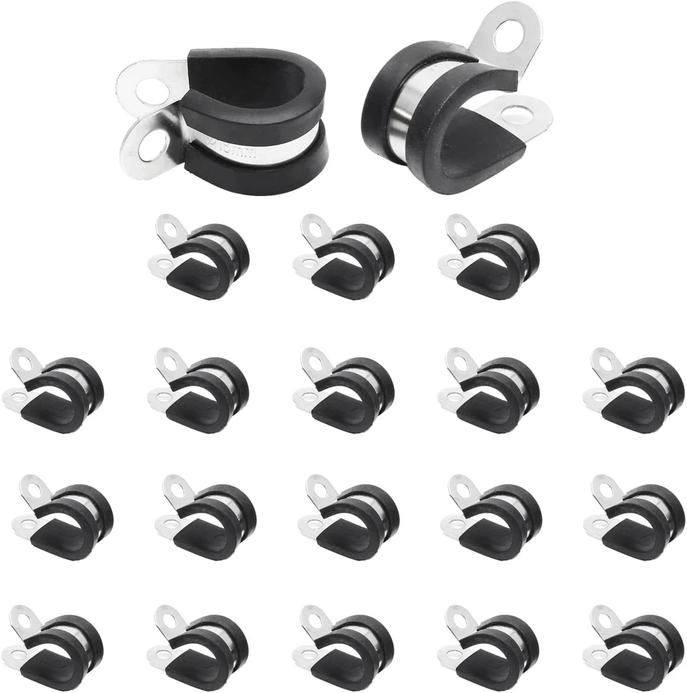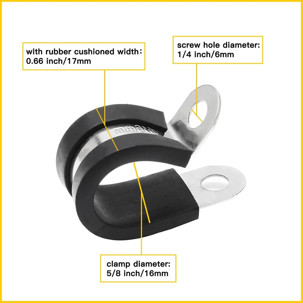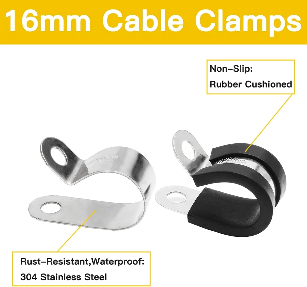 Package Included: 20PCS 16mm 5/8” Stainless Steel Cable Clamps. NOTE: Please refer to the reminder of the size chart before buying. (Refer the Size Picture). Product Size: Inside Diameter of cable clamp is 5/8 inch, 16mm. Fits for cables, pipes, wires, hoses and tubes in 5/8 inch outside diameter. Screw mounting hole diameter is 1/4 inch. Durable&Reliable: Made of high quality 304 Stainless Steel, the tube holder clamp is anti-rust, waterproof and wear-resistant. Featured with premium non-slip insulating rubber cushion, the pipe clamps can stay in place. Wide Application: Designed with P-type, the tubing clamps are flexible and easy to install and remove for cables, hoses, tubing, pipes, fuel lines and electric wire cord installation. Widely used in household, industrial, machinery and etc. 20 pack 5/8 inch insulated clamps with 304 SS and insulating rubber cushioned protects the cable from corrosion and slip. Fits for most cables, tubes, hose, wiring, pipes and lines in (16mm) 5/8 inch outter diameter, this electrical conduit clamp is widely used in household and industrial, windshield and hose clamp bracket. Note: Due to manual measurement, please allow a deviation of 1 - 2mm. Please check our product size carefully and read the product size descriptions before purchasing to avoid possible unpleasant shopping experience.