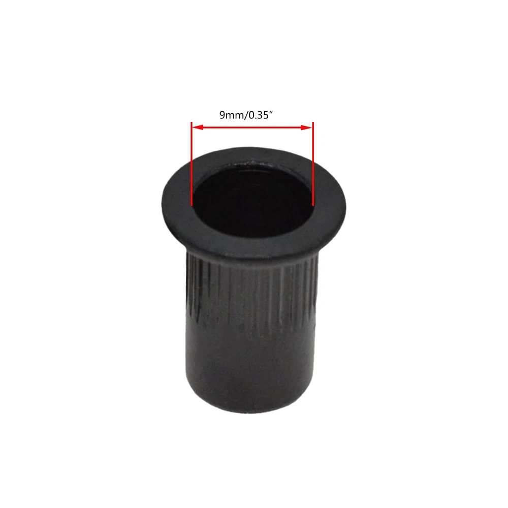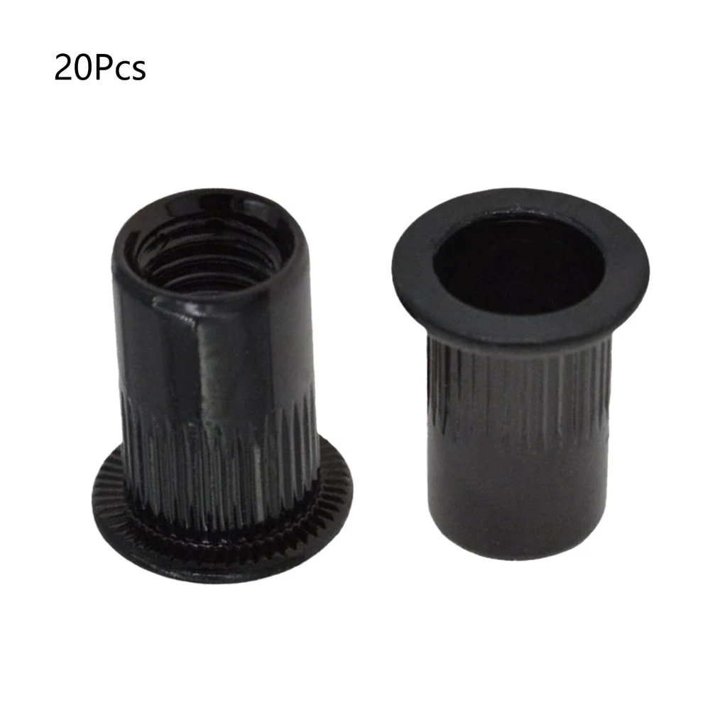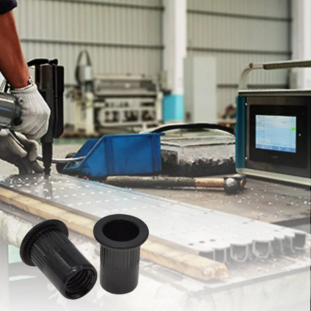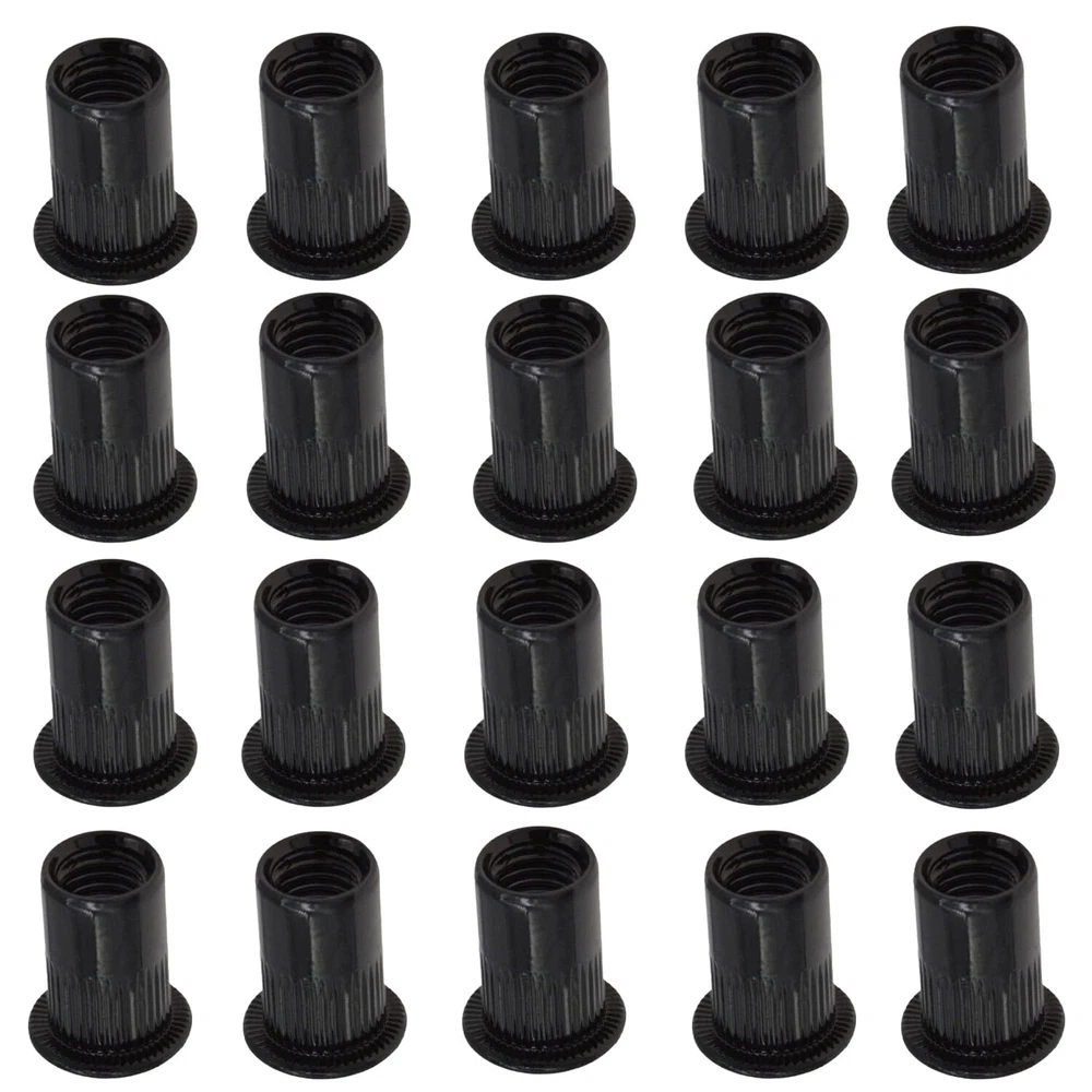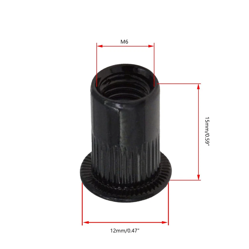 Introducing our Rivet Nuts, Carbon Steel Zinc-Plated Knurled Flat Head Threaded Insert Nuts in Black, Pack of 20. Each rivet nut measures precisely and offers exceptional strength and durability. The knurled body provides a secure grip, while the flat head ensures a flush fit. Ideal for automotive, furniture, and metalworking applications, these threaded insert nuts are easy to install and perfect for creating strong, reliable threads in thin materials. Upgrade your projects with these versatile, high-quality rivet nuts. Constructed from Carbon Steel, these M6 Rivet Nuts feature a Thread Size of M6 x1.25mm and a Drill Hole Size of 9mm / 0.35". Total length is 15mm/0.59". With a Fastener Type: Hollow, they ensure uniform wall thickness, high strength, and corrosion resistance, making them ideal for various applications. The zinc-plated surface treatment of these Rivet Nuts enhances their corrosion resistance and durability. Drill a hole according to the size of the rivet nut installation hole, insert the rivet nut, and tighten the locking nut with the rivet tool. Designed for high strength and uniform wall thickness, these Rivet Nuts are perfect for use in automobile sheet metal, household thin iron cabinets, roofs, equipment casings, and more, ensuring a secure and lasting hold. Widely used in metal sheets, non-metal plastic, wood, and other materials, these Carbon Steel M4 Rivet Nuts provide a tight thread locking force. Their hollow design and superior surface treatment make them a reliable choice for various projects. Achieve professional results with these Rivet Nuts. They are essential for ensuring high strength and corrosion resistance in automotive, household, and industrial applications.
