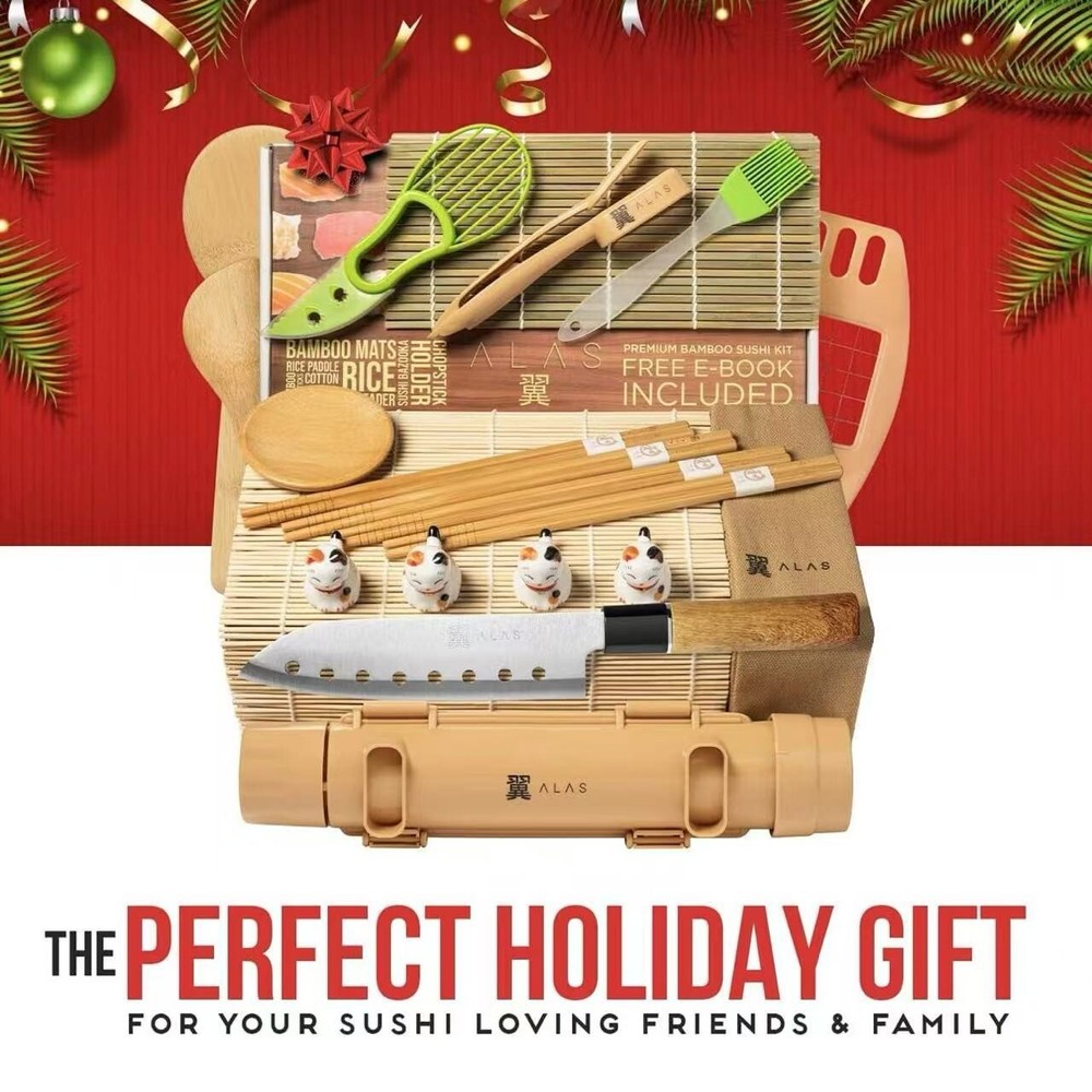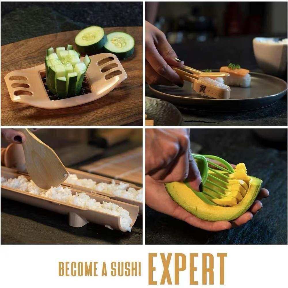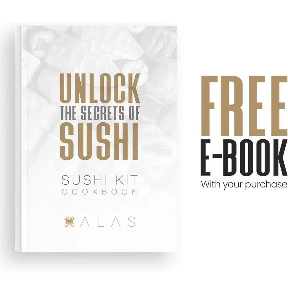 About this item EASY SUSHI MAKING KIT: Lessen your obstacles and lack of accessories in your kitchen with our Alas sushi kit. It has everything you'll need to make sushi rolls like a pro. With our complete set of sushi-making accessories, making your own California sushi, maki, and nigiri rolls can be easier than ever before. Now you can prepare delicious sushi in the comfort of your home with our sushi maker kit. COMPLETE KITCHEN KIT: Show off the sushi expert inside you and prep sushi they don't expect you'll make. Our sushi-making kit includes all the accessories for the perfect sushi for you and your guests. This kit includes a sushi knife, bamboo sushi mats, rice bazooka, chopsticks, holder, dipping plate, avocado slicer, nigiri maker, cucumber slicer, rice paddles, and a sushi brush. We have included all the accessories in one set. PERFECT FOR BEGINNERS: Are you a beginner? No problem, we'll make your sushi-making journey easier. You'll get a sushi kit cookbook and a free e-book to unlock your sushi-making skills when you purchase our sushi maker set. No need to learn how every restaurant makes it because we'll help you cook, mold, and chop like a pro. GIFT FOR A CHEF: Give something special to a chef or a friend who loves making sushi like a chef. You never want to miss our sushi-making kitchen kit that will satisfy you and your guests. You can also save more by not buying sushi, maki, and nigiri rolls because ours is a sushi kit for home.