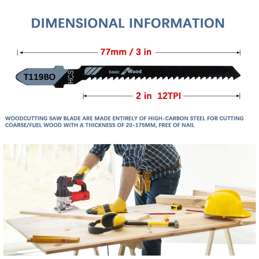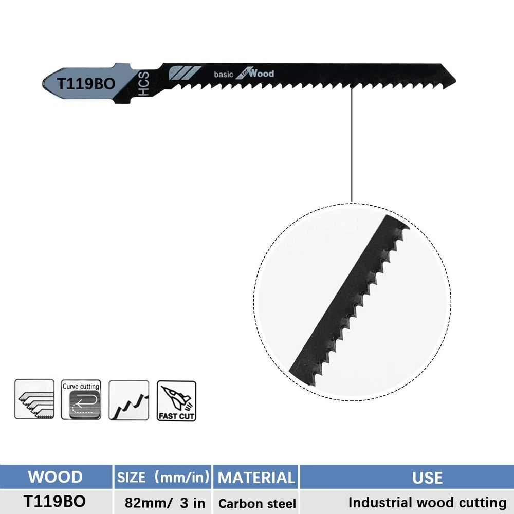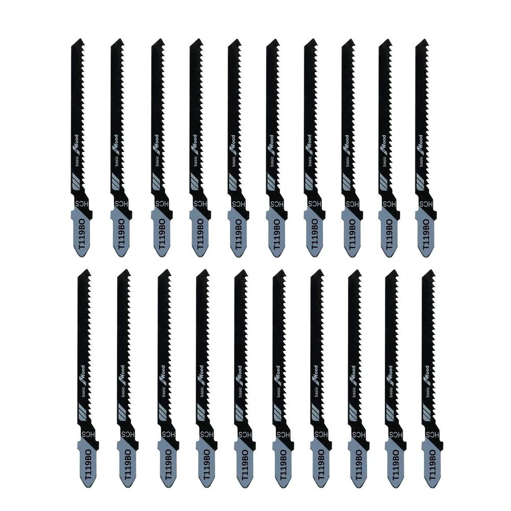 20 Pieces T119BO Jig Saw Blades Set includes: 20*T119BO. It's an ideal set for precision cutting wood. Premium blades deliver high performance with precise, clean cuts. Plastic case included for convenient blade storage. T-shank design for maximum grip and stability which fits over 90 percent of current jigsaw makes and models. T-shank design compatible with over 90% of current jigsaws including Bosch, DEWALT, Hitachi, Makita, Milwaukee, Metabo, Porter-Cable, and Craftsman jig saws Made with thick gauge high-carbon steel for maximum life in wood material for precision cuts. High-Quality manufacturing to provide superior wear tolerance and life 3 inch overall length, 2 inch length of knife edge, 12 teeth per inch. Precision for wood, scroll blade for curved cut Includes plastic case for convenient storage 20 piece set