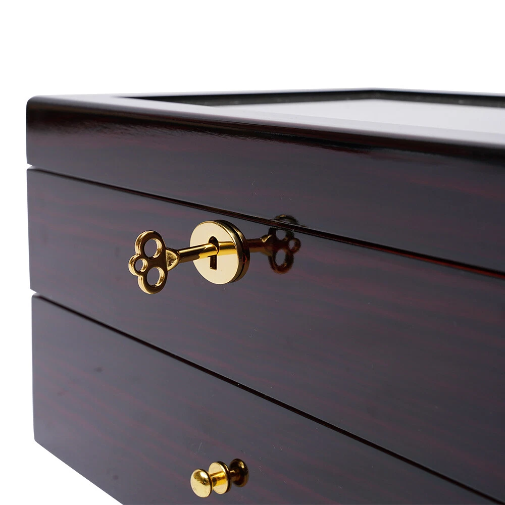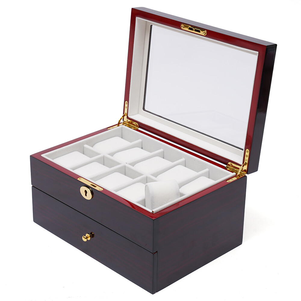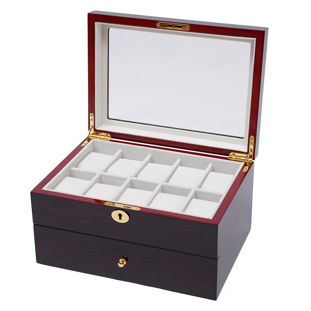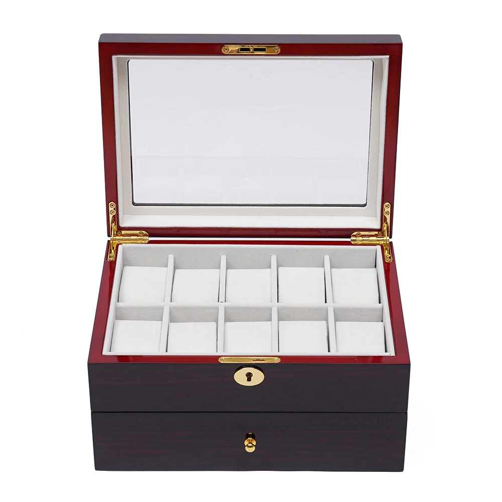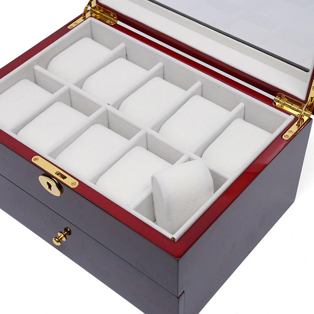 This watch box is absolutely stunning! The sandalwood grain and glass top give it a luxurious look while the soft velvet lining keeps my watches safe and scratch-free. The double-layer drawers are super convenient, fitting 20 watches neatly. I love the removable pillows—perfect for different watch sizes. The lock adds extra security, making it great for both display and storage. The build quality feels solid, and the bright spray paint finish looks elegant. Definitely worth it for any watch collector!