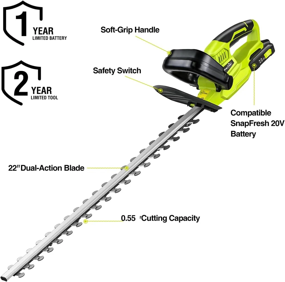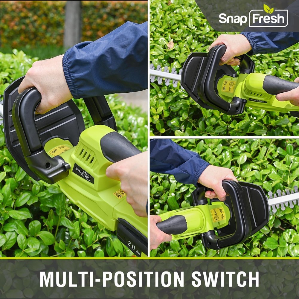 SnapFresh 20V Cordless Hedge Trimmer - 22" Dual-Action Green trimmer Description Features: 【Corded to Cordless】 - This cordless hedge trimmer offers greater flexibility and ease for trimming branches, shrubs, bushes,grass... 【Dual-Action Blade】 - Double cutting efficiency with durable Mn65 metal, reduced vibration, and a 22" steel blade that easily cuts through 0.55" thick branches. 【Up to 3000 Sq Ft】 - The powerful 1400 RPM motor delivers exceptional cutting strength, covering 3,000 square feet with double cutting efficiency. 【30% Lighter】 - Weighs just 4.74 lbs, easy to maneuver, and reduces muscle fatigue. The ergonomic rubber handle provides a secure, slip-free grip, making garden and yard care a breeze. 【Double Lock Protection】 - This electric trimmer features a double-lock design, requiring both locks to be pressed for operation. The blade guard prevents branch splashes, enhancing safety during use. 【2.0Ah Battery & Fast Charger】 - The 2.0Ah battery offers up to 30 minutes of continuous use for your trimming jobs. The battery is compatible with all SnapFresh 20V products and recharges in just one hour. Product Details: Brand: SnapFresh Power Source: Battery Powered Color: Green Hedge trimmer Product Dimensions: 36.02"L x 8.35"W x 3.27"H Item Weight: 4.7 Pounds Blade Length: 22 Inches Material: Rubber Blade Material: Alloy Steel Cutting Width: 1.4 Centimeters Item Weight: 4.74 pounds Manufacturer: NINGBO BABYTEC MATERNAL AND INFANT TECHNOLOGY CO.,LTD. Item model number: BBT-YOD01-C Batteries: 1 Lithium Metal batteries required. (included) Handling We will ship all orders within 1 business day of payment. Delivery We Do Not Ship Outside of the Continental US. Return Policy All items qualify for returns within 30 days of receipt. Buyer is responsible for return shipping on any item that is not damaged. Feedback We take our reputation seriously, we buy and sell online, so we understand the value of trust. If you are unsatisfied with your order, please contact us and we will work with you to resolve it to your satisfaction.