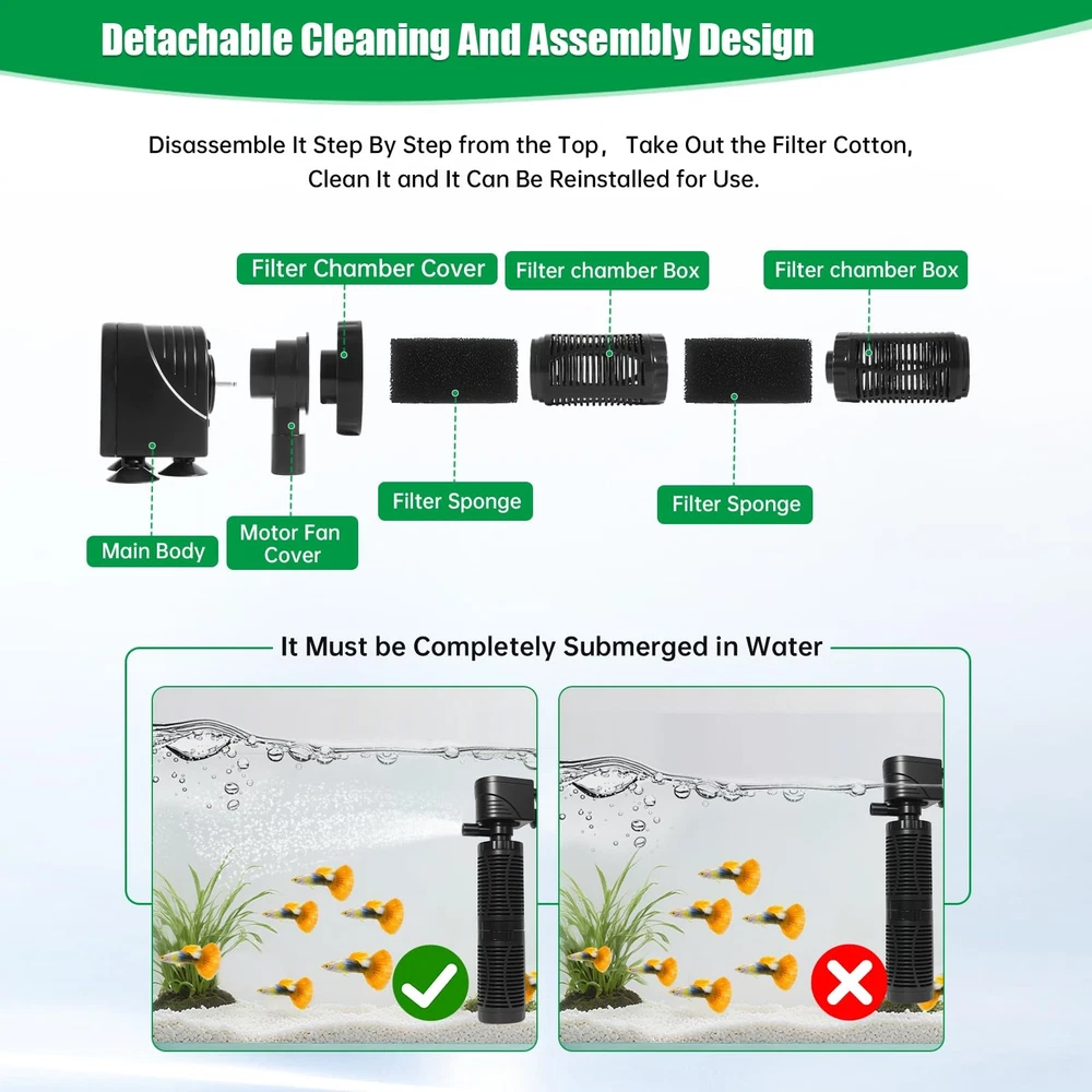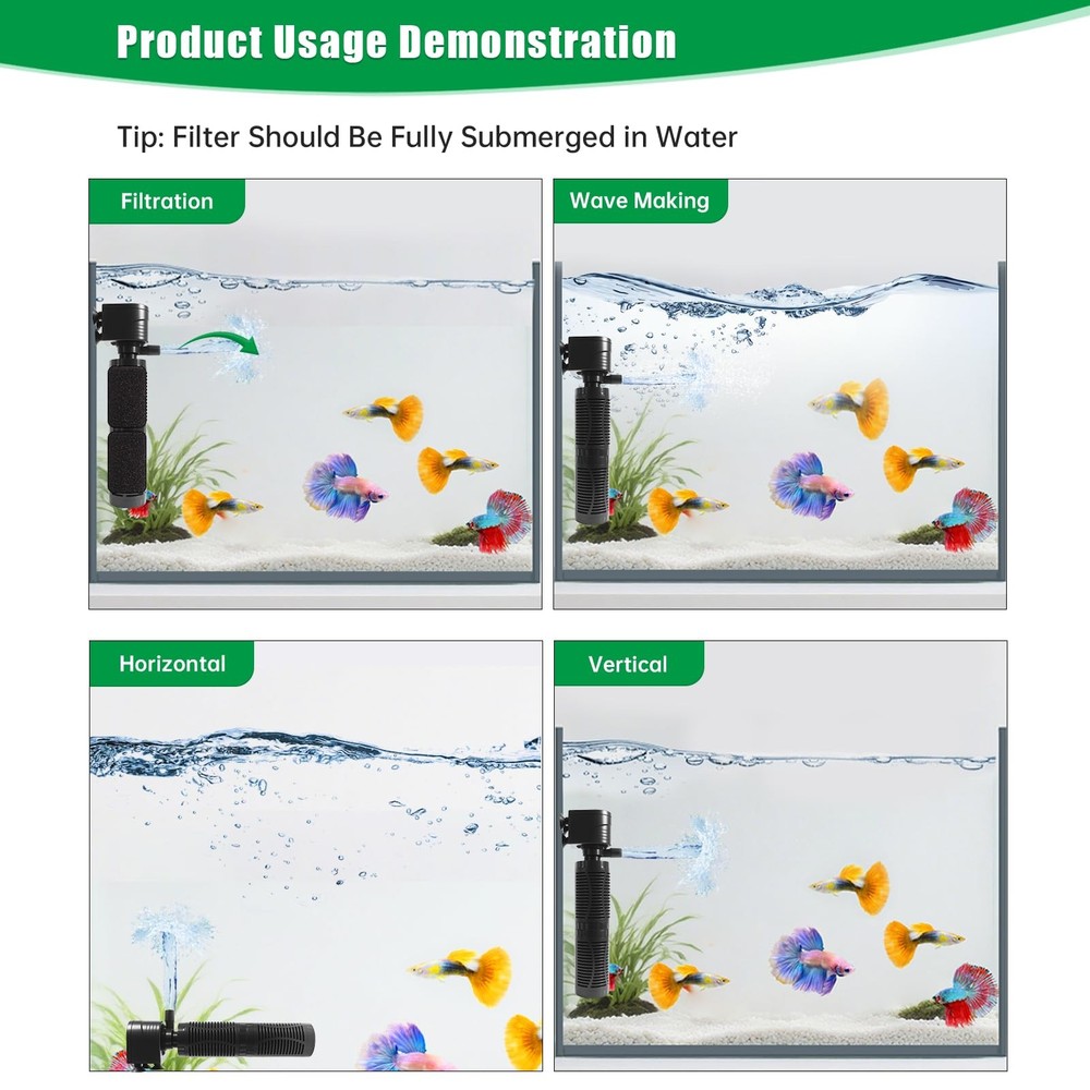 4-in-1 AquaPower Filter System All-in-one solution for filtration, aeration, circulation & wave action|20W energy-efficient motor|370 GPH high flow rate|Ideal for 50–120 gallon freshwater or saltwater tanks → 3-stage transparent canister with dual-layer dense foam captures waste, algae & odors — washable & reusable → OxygenBoost Vortex Technology increases oxygen exchange by up to 30% via dual-bubble and surface agitation → Fully submersible design, ultra-quiet (<35dB) with anti-vibration suction cups | Safe for low water levels Effortless Maintenance Quick-release snap design|Open-access canister|Media changes in under 1 minute Top Advantages ✓ 2X more filter media contact area → extended filter life ✓ Cost-effective — eliminates the need for a separate air pump ✓ Transparent housing lets you check filtration at a glance Important: Not recommended for turtle or reptile tanks. 4-in-1 High-Performance Aquarium Filter for Clean, Healthy Water: Measuring 11.9" × 2.3", this 20W internal filter integrates water circulation, oxygenation, surface agitation, and filtration in one compact design. With a powerful 370 GPH flow rate, it supports 50–120 gallon freshwater or saltwater aquariums. Not suitable for turtle or reptile habitats. Quiet Operation, Fully Submersible Design (<35dB): Built with a low-noise motor and anti-vibration suction cups, this sponge filter delivers quiet performance — ideal for bedrooms, offices, or other peaceful environments. Fully submersible and designed for flexibility, it also supports lower water levels for creative tank setups. Cost-Effective & Reusable Filtration: Includes 2 additional sponge layers and a built-in waste container to capture debris, algae, and odors. The washable sponges are reusable, and the filter media can be easily swapped to match your setup — reducing the need to replace the entire filter unit frequently. Tool-Free Cleaning & Maintenance: The transparent, 3-stage housing makes it easy to inspect and clean. Just twist off the top cap, remove the sponge, rinse, and reassemble — all without tools. Dual-Layer Safety Design for All Tank Layouts: Fine mesh intake prevents small fish and shrimp from being sucked in, ensuring safe operation. The double-layer filter system allows you to mix and match filter media for better performance. Energy-efficient and low-noise, it provides crystal-clear water with minimal maintenance effort.