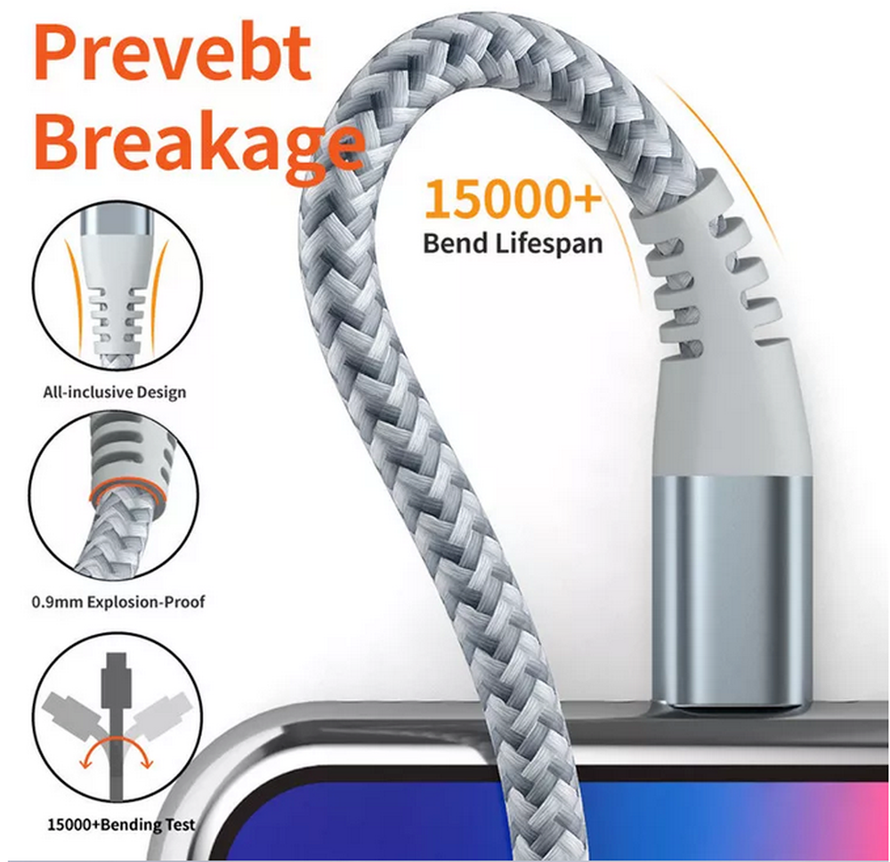 Description: PD fast charging & Sync. Charge your for iPhone 13 up to 50% in 30 minutes when using a USB-C PD charger, almost 3x faster than the regular charger; Safe, reliable, fast charging and syncing. Built to last. The durable braided nylon casing ensures fewer tangles and more tensile strength, proven to withstand over 15,000 bends in strict laboratory tests. Quality aluminum connector ensures your cable won’t get damaged when plugging in and out frequently. Compatibility. This cable supports fast charging for iPhone 13 series, iPhone 12 series, iPhone SE 2020, iPhone 11 series, iPhone X series, iPhone 8 series, iPad Pro 12.9 1st and 2nd gen, iPad 8th gen, iPad Pro 10.5; supports standard charging for iPhone 7/6, etc; 18W or above USB-C PD wall adapter is required for fast charging. Specifications: Jacket: Nylon braided Function: Charging + Sync Bend Lifespan: 15,000+ Color: Grey Length: 6FT/10FT Compatibility: PD Fast Charging: Compatible with iPhone 13, 13 Pro, 13 Pro Max, 13 Mini, iPhone 12, 12 Mini, 12 Pro, 12 Pro Max, 11, 11 Pro, 11 Pro Max, XS Max, XS, XR, X, 8 Plus, 8 and iPad 8th iPad 2020, iPad Pro 12.9" Gen1, iPad Pro 12.9" Gen2, iPad Pro 10.5", iPad Air 3 10.5", iPad Mini 5, AirPods and AirPods Pro, etc. Non-PD Charge (only normal charge): Compatible with iPhone 7/7plus/6s/6s Plus/6/6Plus/5s/5c/5/SE (2016) Compatible with iPad Pro 9.7 inch/iPad 9.7 inch/iPad Air 9.7 inch/iPad mini 7.9 inch/ipod touch Attentions: Please allow tiny size deviations due to human measurement. Due to the effect of light and monitor's brightness, there may be slight differences between the color tone of the photo and the actual item USB-C PD charger not included. You need a USB-C Power Delivery wall charger to achieve fast charging. Package Included: 1/2/3 x PD Cable