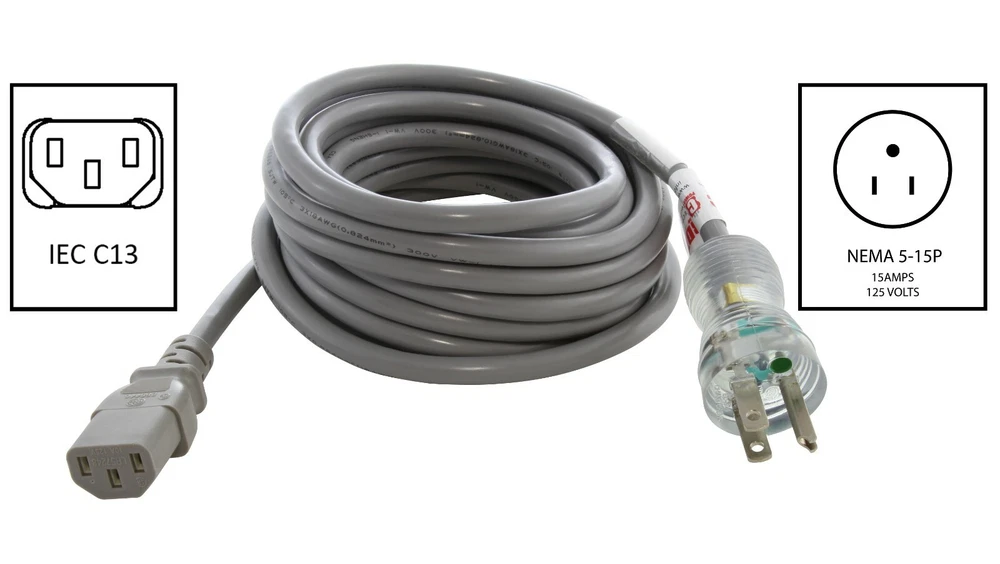 Introducing the AC WORKS® brand 15 Amp medical grade power cord, available in a length of 20ft. Featuring a NEMA 5-15P green dot plug to an IEC C13 female connector, this cord is versatile and can be used for a variety of applications including computers, servers, medical carts, hospital beds, and other hospital equipment. You can trust this product for its durability and performance. Plus, your purchase comes with a 5-year limited warranty, so you can be confident in your investment. NEMA Configuration Sketch Common Name Amperage Rating Voltage Rating Male Plug NEMA 5-15P Regular Household Plug 15 Amps 125 Volts Female Connector IEC C13 IT/Computer/Server Connector 15 Amps 125 Volts Works With This Outlet Works With This Plug