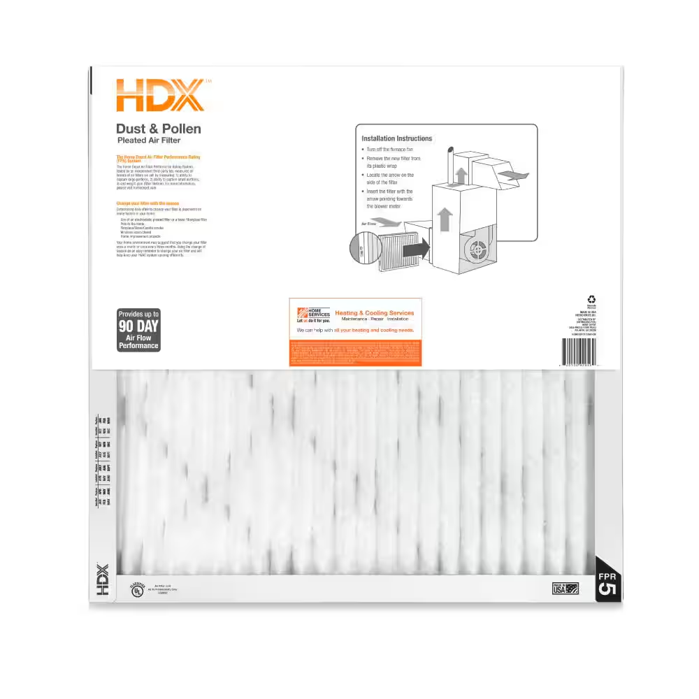 20x20x1 Air Filter Standard Pleated Furnace AC Filtro de aire 1-filter HDX HDX filters are constructed of a durable, moisture-resistant frame with wire supported media for strength and rigidity. The wire-backed Pleated media offers a large surface area which increases the filter's dust-holding capacity and improves its efficiency. The air filter media can be charged electrostatically which means it attracts, captures and traps particles that would otherwise bypass the filter. The air filter's media is rated between a MERV 8 and 13, which is one component of the FPR Rating. FPR or the Filter Performance Rating, is composed of 4-measurements for classifying air filters. Every rating includes 4-elements: MERV rating, E1 efficiency, pressure drop and dust holding capacity. MERV stands for the Minimum Efficiency Reporting Value and measures how well a filter traps particles. The higher the rating, the few particles getting through. E1 efficiency explains how well it traps the smallest particles. Pressure drop measures how much energy the HVAC unit will use to force air through the filter. Dust holding capacity describes how much dust a filter will hold in its lifespan. HDX filters are easy to replace making change-outs quick and keeping indoor air quality at its optimal level while protecting your HVAC unit and allowing it to perform efficiently. HDX air filters capture and trap allergens, airborne contaminants and other particles Created to provide higher efficiency and better overall performance than standard pleated filters Works in furnaces, HVACs, wall vents and ceiling vents Item represents 1-filter that will last up to 3-months, per filter, in a typical household environment and can be reordered through our subscription service