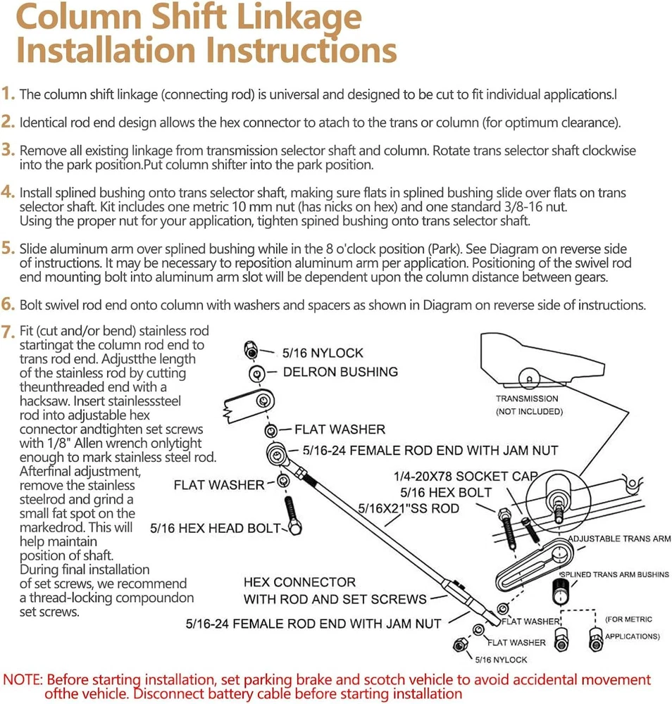 21" Adjustable Column Shift Linkage Kit ACA1800 For GM TH-200, 200-4R, TH-350 TH-400 4L60 4L60E 4L80E & 700-R4 Features: Product Part Number: The adjustable transmission column shift linkage kit replacement number is ACA-1800, CB5010. Before ordering, Please confirm compatibility and whether are suitable for your vehicle. Professional installation is highly recommended Compatible Models: Compatible with Chevy GM TH-200 200-4R TH-350 TH-400 4L60 4L60E 4L80E 700-R4,Replacement for GM Transmission; Not for GM 6L80E Transmission Made of high-quality materials: Transmission Column Shift Linkage are Constructed Of Premium Aluminum Material,The Materials Wear Resistant,Not Easy To Corrode,Durable,Stable For Long Life Service Functions and Installation: Simplify connecting your column shift to your transmission with an adjustable column shift linkage kit to improve the smoothness of the shift so that you can correctly align the desired gears when shifting Easy To Install: Shift Linkage Including Rod Ends And 21" Long Rod,Fits Many Aftermarket Column Shift Steering Columns.It includes all necessary hardware and has been designed to take the hex connector at either end to accommodate any clearance needs, Make your installation easier Specifications: Type:Shifters, Cables & Linkages Part Number:ACA-1800 CB5010 Surface Finish:Yes Fitment Type:Direct Replacement Transmission Type: Manual Items Included: Adjustable Rod, Knob, Long Shifter Link Rod Replacement for: Replacement For GM Turbo-Hydramatic 400 - TH400 Replacement For GM Turbo-Hydramatic 350 - TH350 Replacement For GM Turbo-Hydramatic 200 - TH200 Replacement For GM Turbo-Hydramatic 200-4R - TH200-4R Replacement For GM Turbo-Hydramatic 700-R4 - TH700R4 Replacement For GM 4L60 Replacement For GM 4L60E Replacement For GM 4L80E Note:Not Replacement For 6L80E/ 6L90E Package Includes:(As picture shown) 1 X Billet Aluminum Rod 5 X Metal Gasket 2 X Black Plastic Gasket 4 X Nut 2 X Screw 6 X Adjustable Linkage Kit Fittings Payment Delivery details Terms of sales Feedback Contact us Payment Immediate payment is required. Shipping will be arranged within 1 business day once payment is cleared. To uphold a shipping speed, your order will be processed almost immediately. If you change your mind after your payment is confirmed, we will do our best to cancel the order, however, we CANNOT guarantee the cancellation. Delivery details FREE SAME BUSINESS DAY MONDAY- FRIDAY SHIPPING FROM USA. No shipping on Weekends or US Public Holidays. No responsibility for any custom duty. We will ship your order to your Ebay Verified address provided. Please verify your address and make sure that it is your current address before making your payment. Any address change requests after your payment CANNOT be guaranteed. Shipping information will be updated when available. All of our products can be shipped internationally. To confirm the shipping rates to your country please refer to eBay's Shipping Tab above. Any brokerage, customs, and duty fees associated with international shipments are the customer's responsibility and are not included in our shipping fee. A phone number is required for the customs documents. Failure to provide one will result in delays. We do not include an invoice or any advertising materials with our shipments. Terms of sales We stand behind our items and offer 60 days warranty. All items are in new and working condition unless specified otherwise elsewhere in the description. All Returns - defective or otherwise - MUST BE PREAUTHORIZED to guarantee refund or exchange. Please contact us to get an authorization and return address. Buyer agrees to pay for the cost of re-shipment for undeliverable or wrong addresses. Buyer is responsible for Return Postage if return/replacement is not a result of our mistake such as wrong item. Replacement or Refund will be made upon receipt of the returned item. Please include tracking number so we can process ASAP. If you do not wish to wait for a replacement, please repurchase the item. Feedback We strive to provide the best products and services. Your positive feedback 5 stars DSR help us do better. If anything about your transaction did not meet expectations, please CONTACT US and give us the opportunity to make things right. We are always here to help. Contact us Please do not hesitate to CONTACT US . You can message 24/7 on eBay for all questions and inquiries. We will get back to you within one business days at the latest from Monday- Friday.