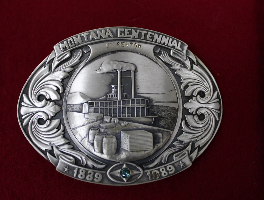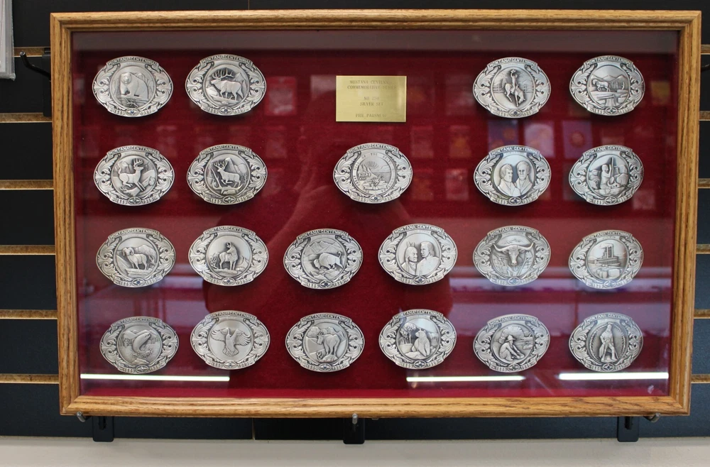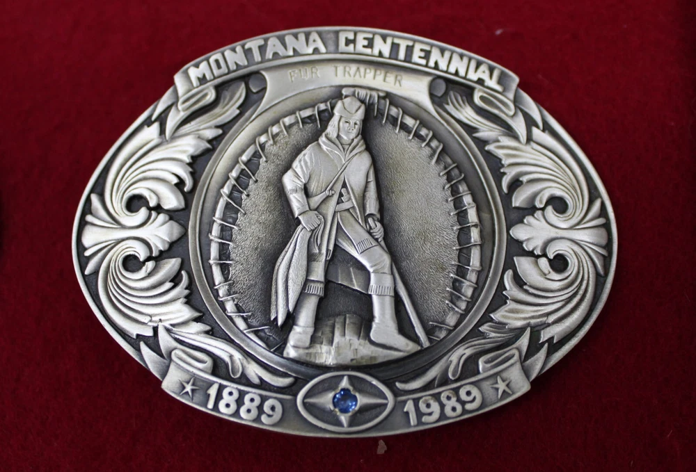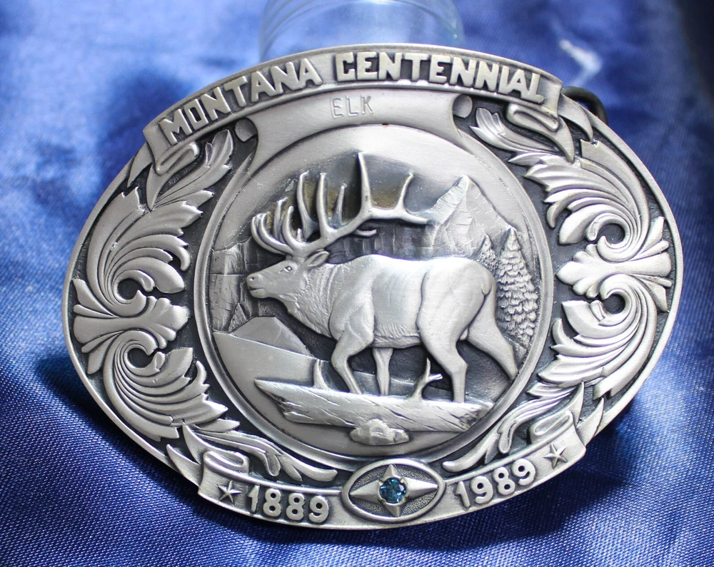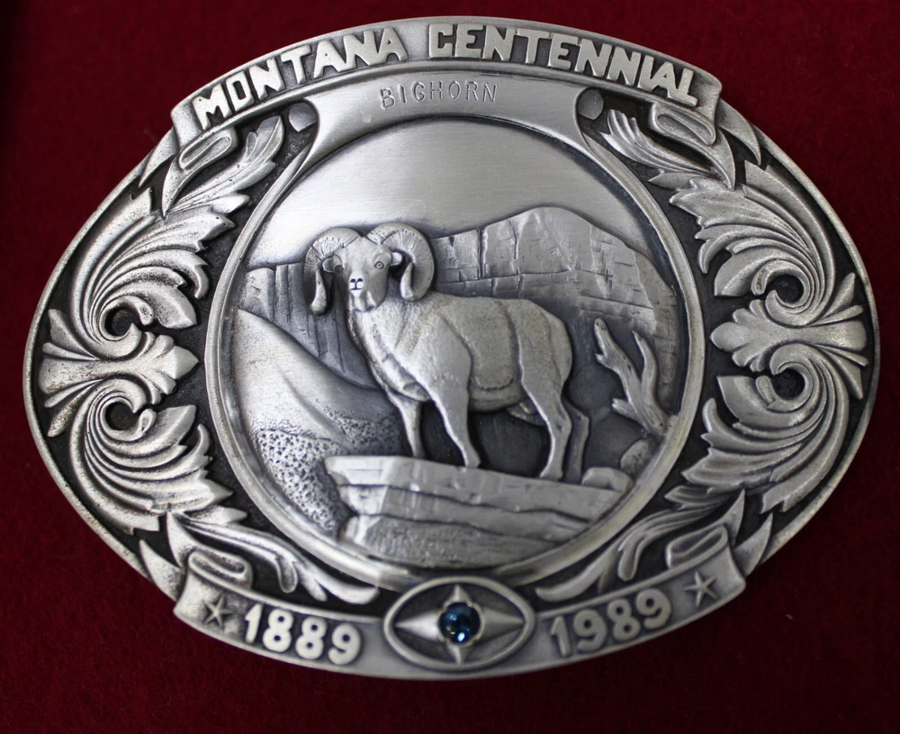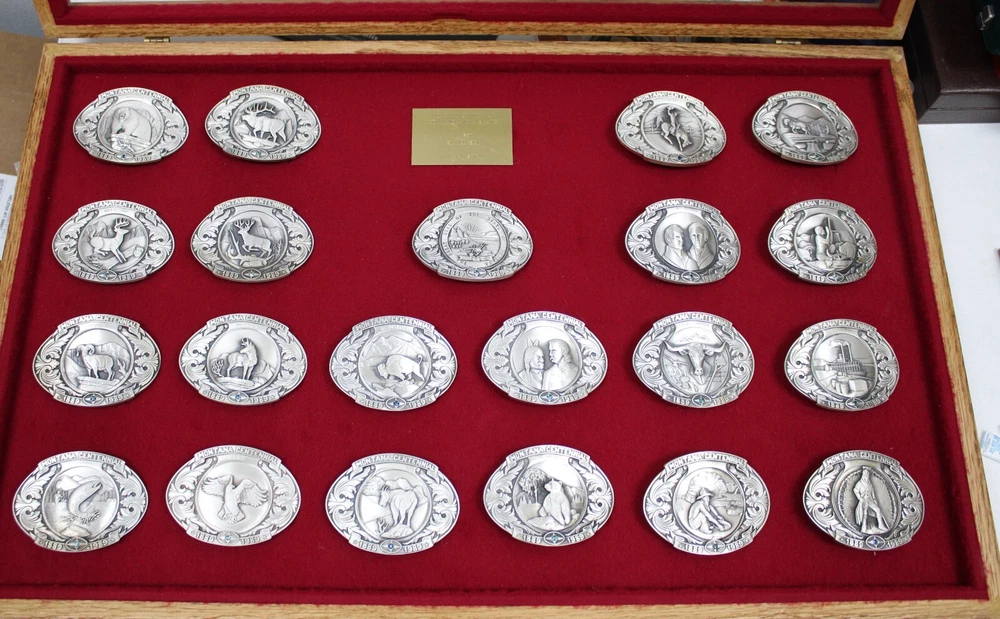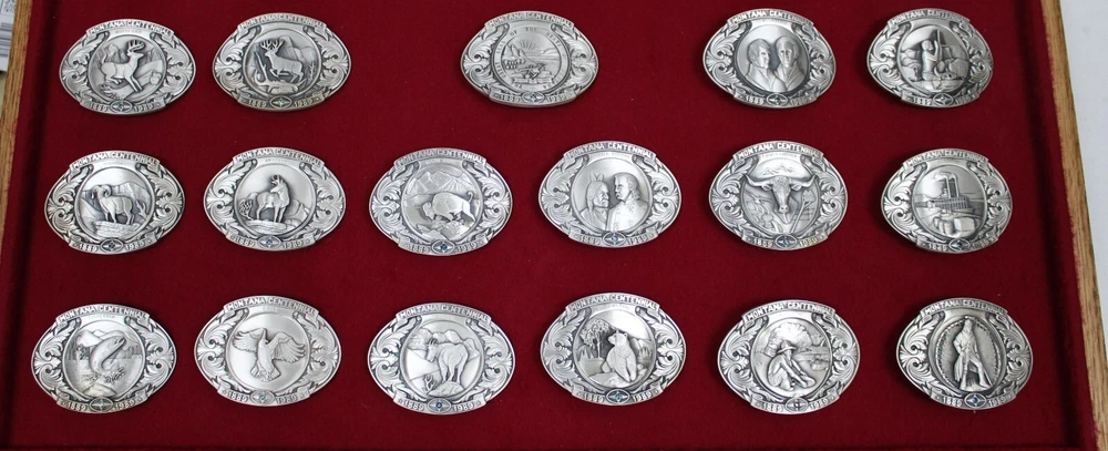 A complete set of (21) Montana Centennial sterling silver belt buckles commemorating the hundred year anniversary of Montana's statehood. While they made 5000 bronze buckles (which trade between $50-100) they only made 250 sterling examples. This is #250 of 250. Were told its one of only two complete sets with the other located at the Charlie Russell museum in Great Falls MT. Each buckle is over 5ozt of sterling silver with a quality MT sapphire. The sapphires were supplied by Adair's Jewelry in Missoula, MT who provided a hand written appraisal of $11k in 2001! Worth note the appraisal states that if a buckle were removed and it wasn't a complete set the value drops to $1500-2k. (2001 money) So it is a big deal to have full set and we are not interested in breaking it up. We are asking $5500 which puts each buckle at only $262 a piece. Shipping would be fedex at around $50. These came over the counter at our brick and mortar store in Helena, MT. You can call us with questions. Our phone # is on card in pics. (didn't want to write here in case of spam) Awesome set don't expect it to last long. Thanks for looking.