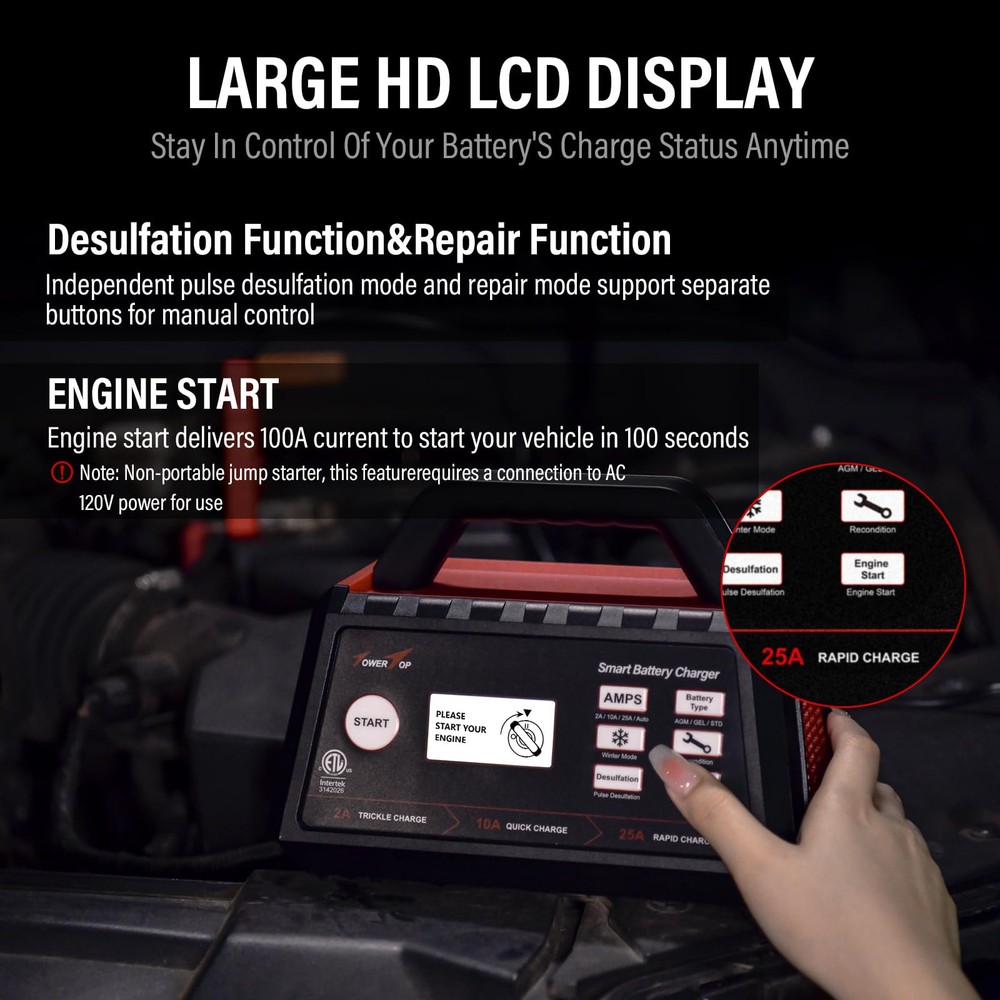 Quick charger: Up to 25A quick charger, 4-Level adjustable current 2A/10A/25A/AUTO can meet your different needs. This 12V smart car battery charger, with 84% high efficiency (industry average: 75%), ideal for STD, AGM, Gel, Wet, MF, EFB, Deep Cycle batteries Fully-automatic charging: Auto-identify and charging, auto-stop at 100% charging, auto-start in 30 seconds while you forget to press start, auto-restart to trickle maintain when the battery voltage drops. This battery charger can remember your previous settings, with no worry about AC power failure when connecting for a long time 8-Stage charging program: Intelligent 8-stage charging include: desulfation, soft start, bulk charge, absorption, analysis, recondition, float, and pulse maintenance. MCU controller monitor the whole charging progress, add charging precision, optimize battery power, and extend battery life Engine start & winter mode: Engine start delivers 100A current helps activating your car battery to start your vehicle in 100 seconds. Winter Mode, +0.2v on the basis of the original charging voltage, better boosts your battery activity and charges more thoroughly in low-temperature situations Battery repair: Advanced recondition mode uses slow pulse reconditioner technology to detect battery sulfation and acid stratification to restore lost battery performance, help to repair old/idle batteries and extend battery life. If your battery cannot be charged, you can try "Recondition" mode to repair your battery. Pls note: It can not repair a totally dead battery Multi safety protection & ETL certification: This battery charger offer multi protection against spark, reverse polarity, over charge/discharge, over voltage, over current, overload, overheat, current backflow, short circuit. Reliable cooling systems improve working performance. ETL certification makes it safe to use
