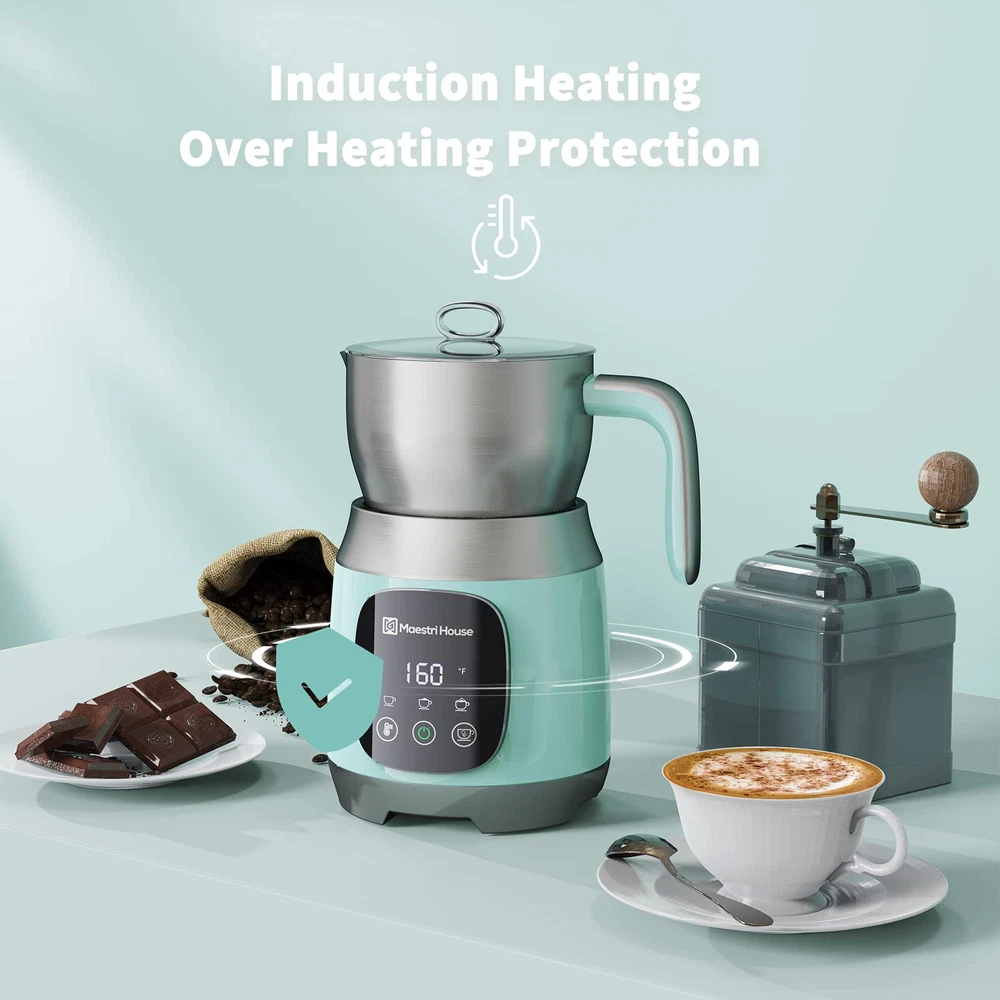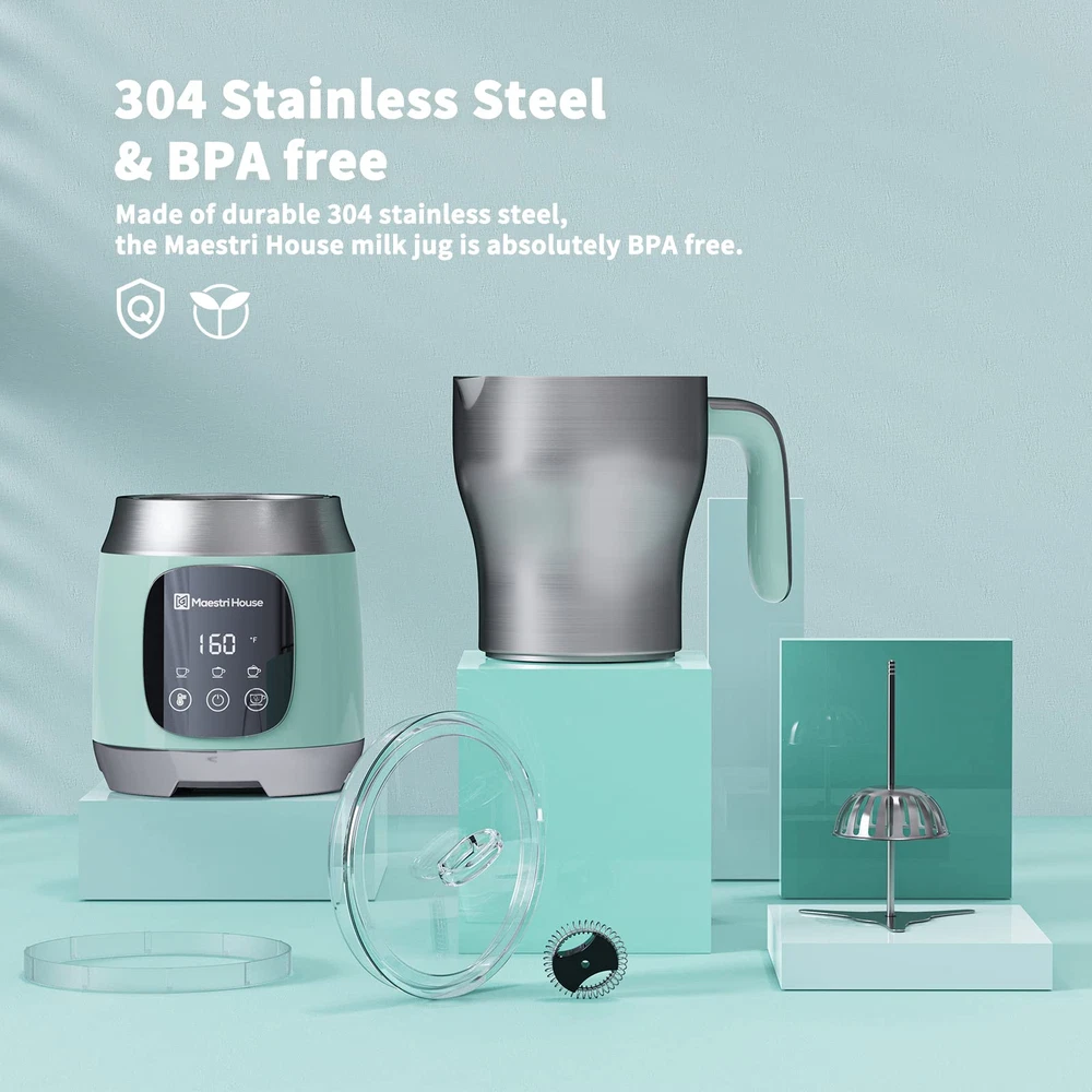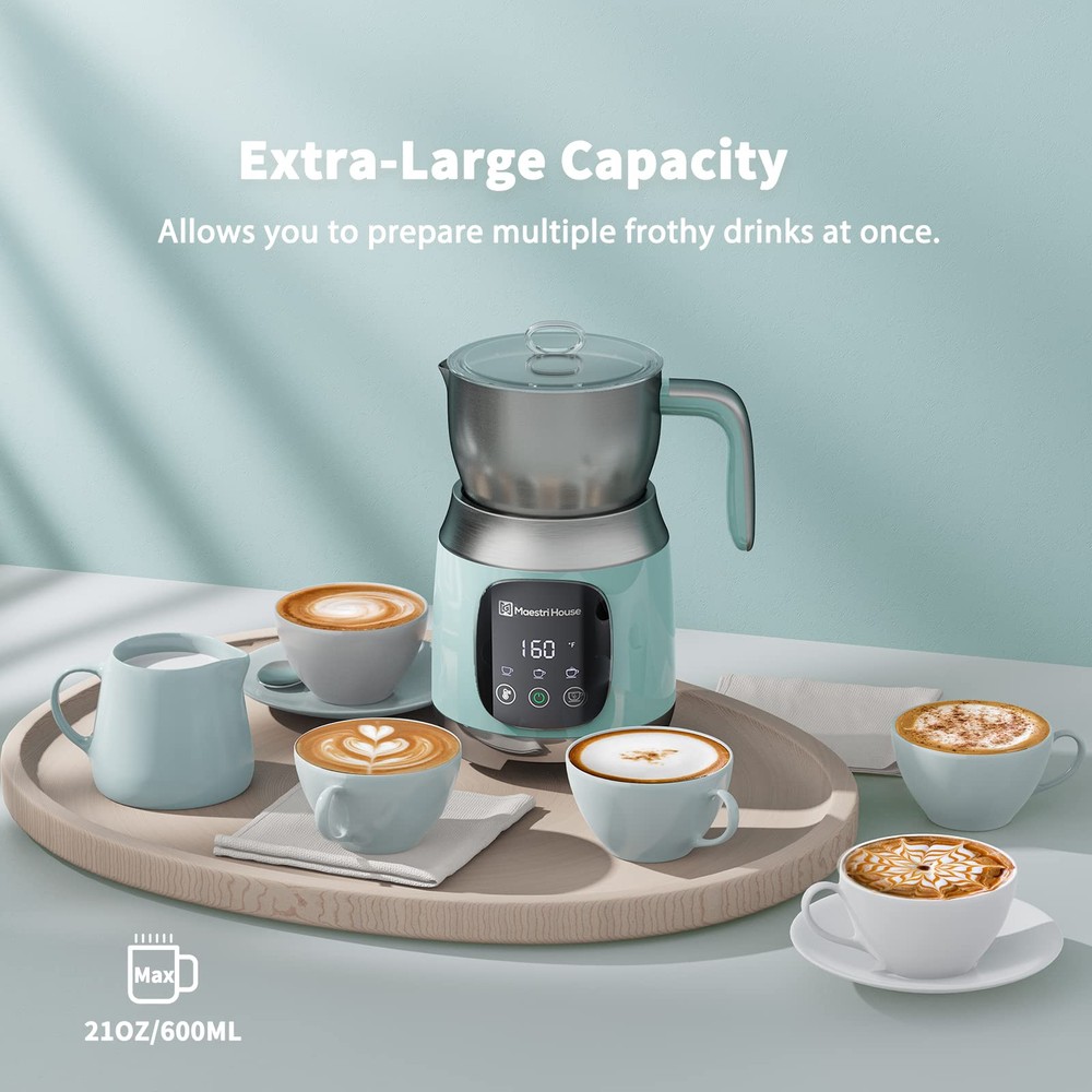 【Variable Temp & Froth Thickness 】The first milk frother features with variable temperature setting and different froth thickness selection in the world.'s milk frother offers 4 temperature settings: Normal, 120℉, 140℉, 160℉, and 3 froth thickness choices: low, medium, and high. Elevate your coffee experience with precise control over your brew. 【Generous 21oz/600ml Capacity】With its 21oz (600mL) jug capacity, this electric frother and steamer sets itself apart from the rest, allowing you to whip up multiple frothy drinks at once. Versatile milk capacity options include 10.1oz (300mL) for frothing, 17oz (500mL) for hot chocolate, and 21oz (600mL) for heating. 【Exceptional Touch Button Control】This sleek, professional milk frother boasts a touch control panel for easy selection of functions. Illuminated controls featuring six settings: cold froth, cold airy froth, hot froth, hot airy froth, hot milk or hot chocolate. Prepare creamy, barista-quality froth for your latte or cappuccino at the touch of the button 【Ingenious and High-end Design】Top off any coffee or chocolate beverage with a high-quality milk frother. This well-designed milk frother will quickly stir and heat milk to optimal consistency! With its appealing stainless look and easy-to-use nature, this is a must-have for any serious coffee drinker 【Effortless Cleanup】Crafted from durable 304 stainless steel, the scratch-resistant pitcher is dishwasher safe for quick and easy cleaning. Enjoy spill-free pouring with the proper jug spout design. This frother also includes a fine sponge brush for effortless maintenance of the milk jug.