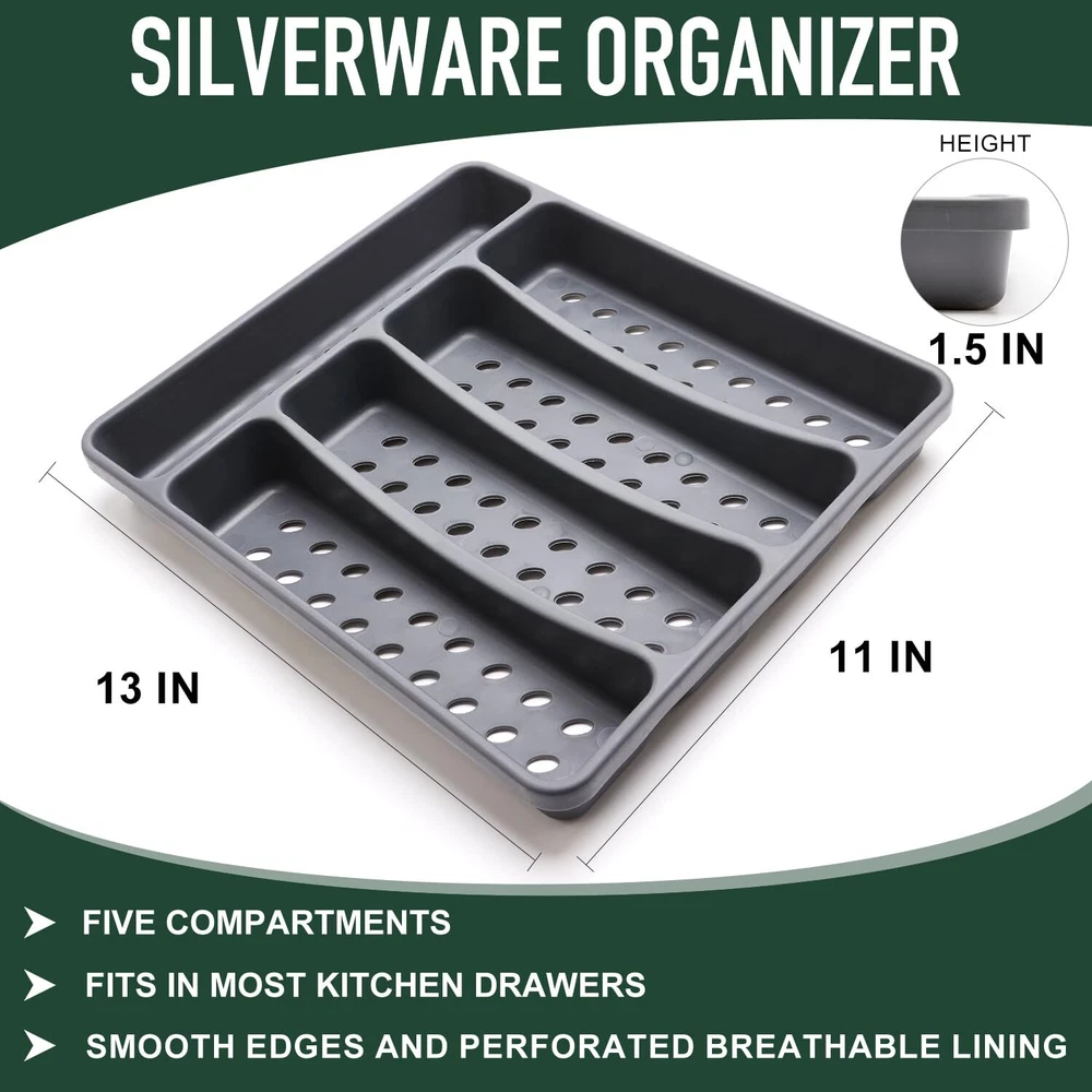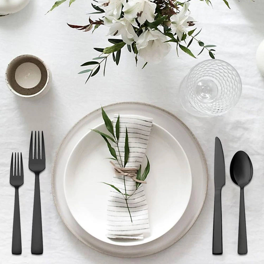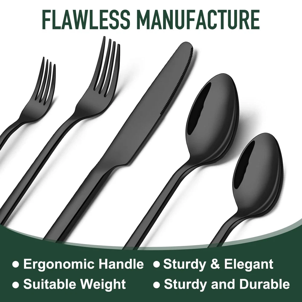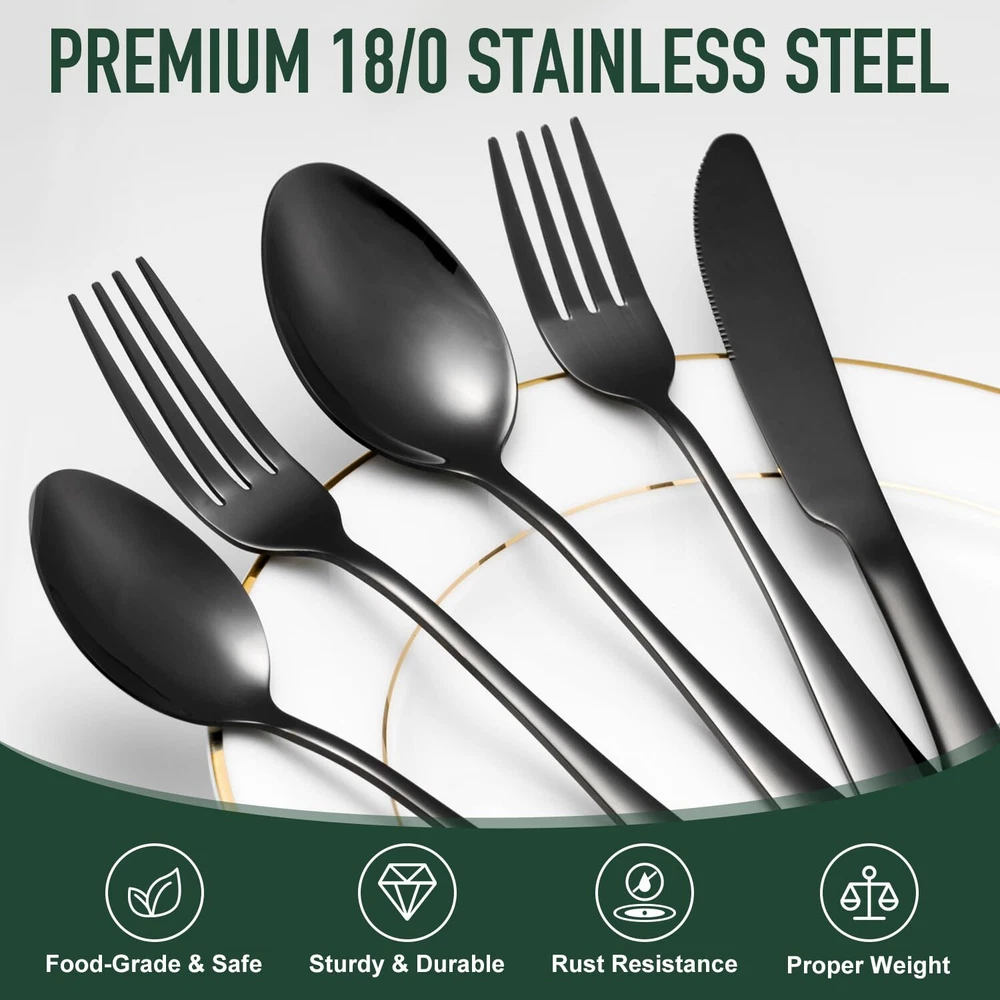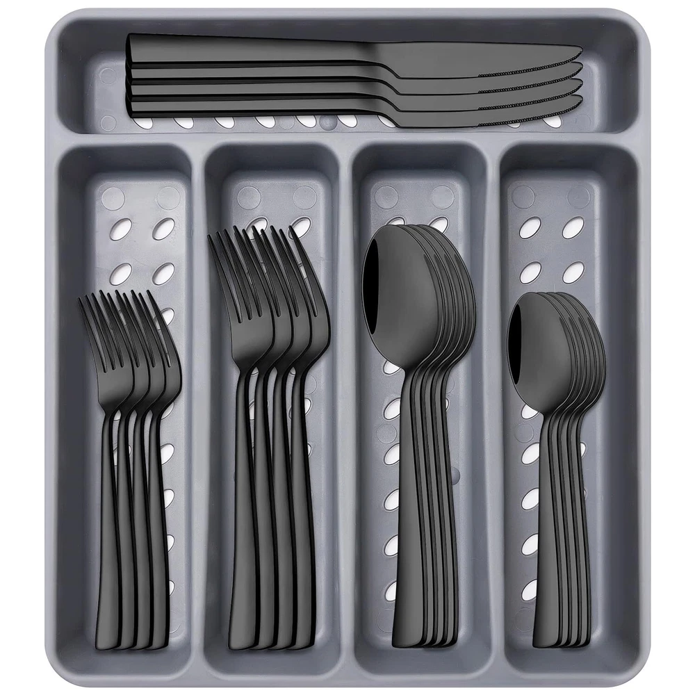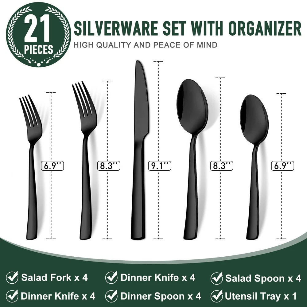 20 Pieces Silver Silverware Set For 4: This cutlery set contains 4 dinner forks, 4 salad forks, 4 dinner spoons, 4 dessert spoons and 4 dinner knives. Plus 1 long-lasting plastic non-slip organizer to store the black flatware set conveniently. Whether you use it in the comfort of your home or in a professional restaurant, this set is sure to impress your guests. High Quality Stainless Steel Flatware: This flatware set made of premium food-grade 18/0 stainless steel and great workmanship, nicely polished. This forks spoons and knives set wont bend, break, or rust resistant, preservative, anti-oxidation, strong and sturdy. If you are looking for an extra set of silverware for a dinner party or event, this is an excellent choice. Ergonomic Handle, Proper Weight: Each piece of the spoons and forks set ergonomic handle has a proper thickness without sharp edges. Its premium quality, ergonomic design, and stylish black finish make it a standout addition to any dining setting. Silverware Set With Organizer: The 12.8" x 11.3" cutlery tray still helps keep it all together and helps keep it organized so you can grab what you need when you need it. The silverware organizer is fairly thick plastic and the bottom of each silverware tray slot is a rubbery pad that's textured to help keep the silverware from slipping around too much. Perfect Gift: Ideal for catering, picnics, weddings, BBQ, holiday dinners, party serving, family reunions and everyday use. This tableware drawer set is a wonderful gift for Easter, housewarming, thanksgiving, christmas, birthday and more.