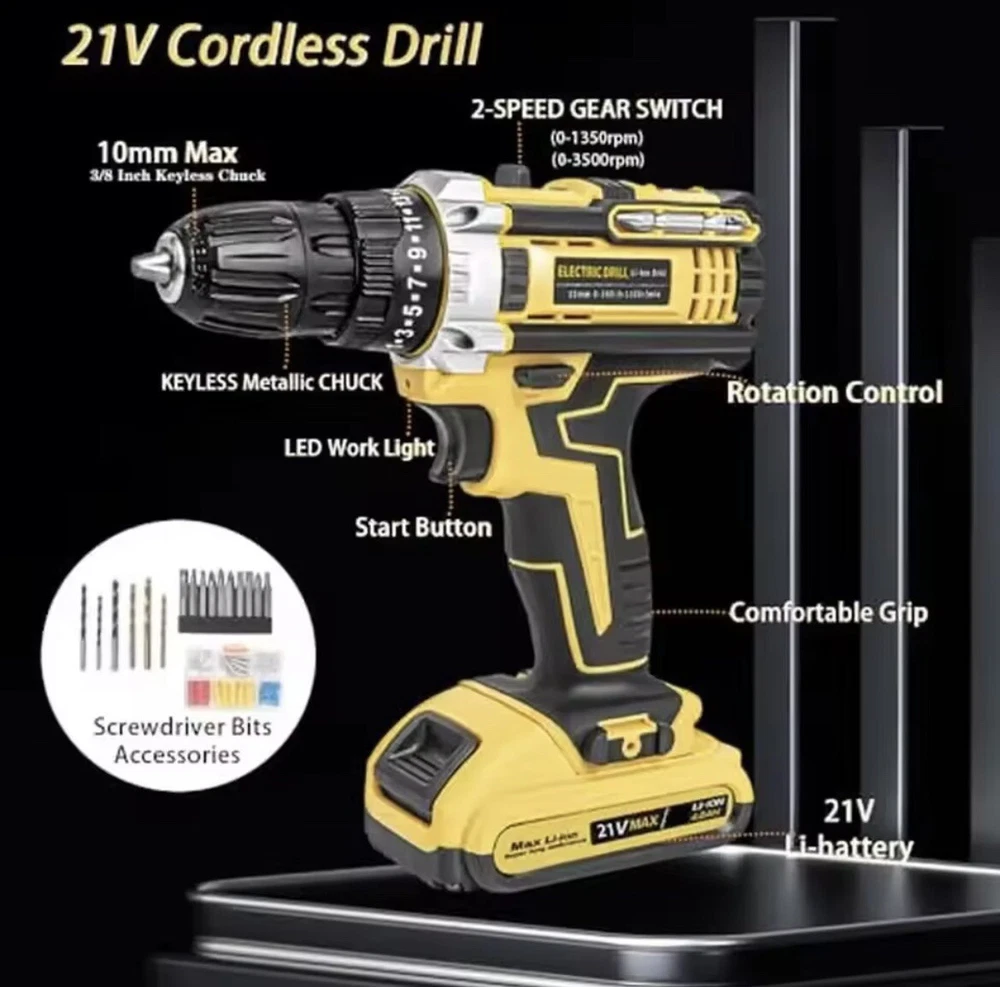 Power Source:BatteryNumber of Items in Set:119Battery Capacity:2 AhBrand:Does Not ApplyChuck Size:3/8 inChuck Type:KeylessVoltage:21 VNumber of Batteries:1Set Includes:Battery, Battery ChargerType:Drill SetBattery Technology:Lithium-Ion (Li-Ion)Battery Included:Yes