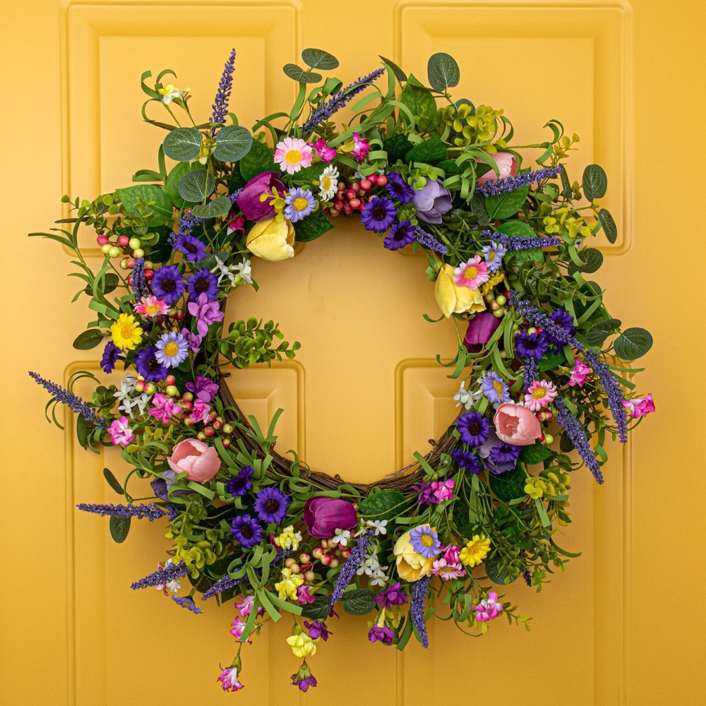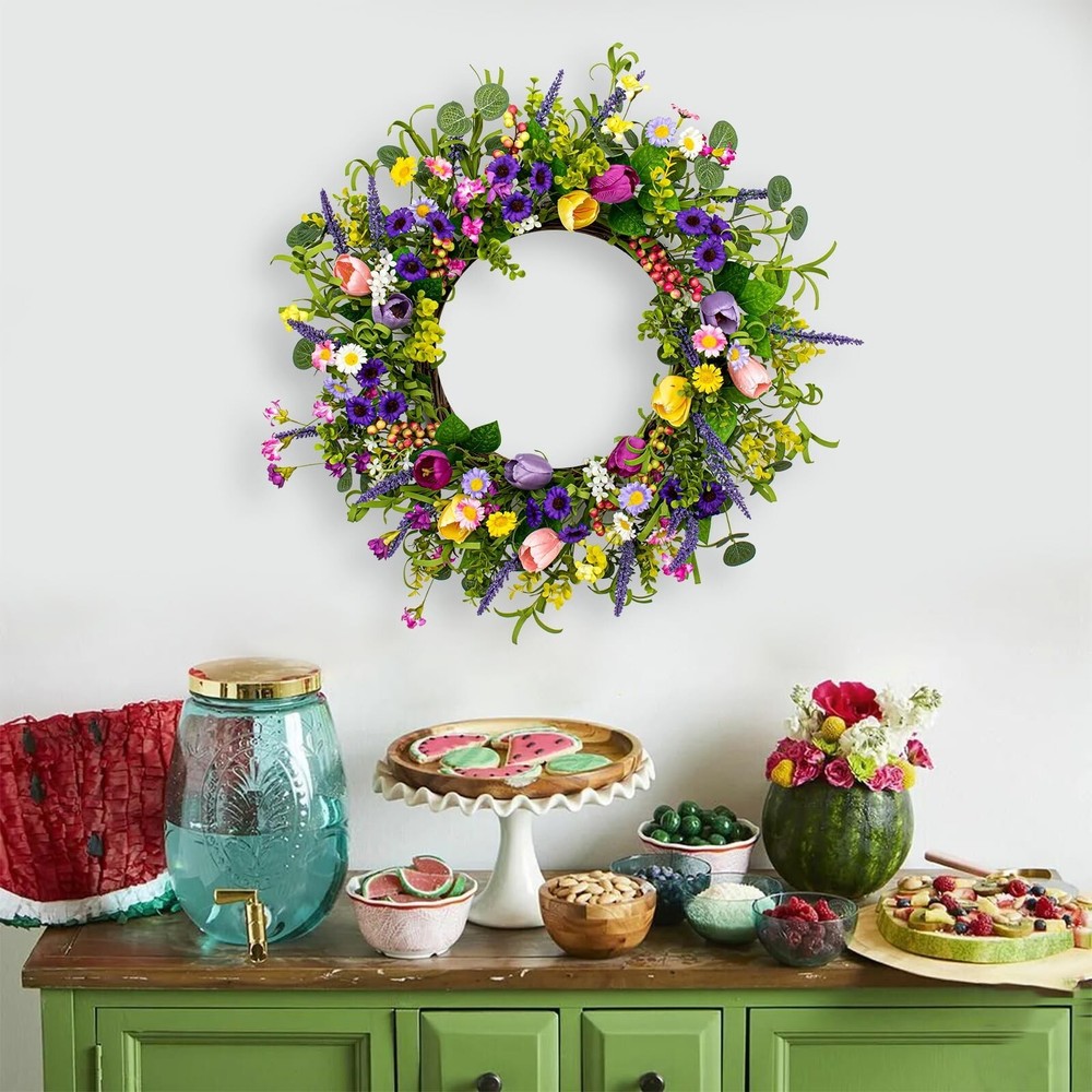 Artificial Spring Wreath 22 Inch Spring Wreaths for Front Door Tulip Wreath with Green Eucalyptus Leaves Daisy Lavender Berry for Sringtime Summer Holiday Indoor Outdoor Decor Product Details Color: Multicolor Brand: JINGHONG Material: Fabric,Plastic,Grapevine Mounting Type: Door Mount Shape: Round Product Dimensions: 4"D x 22"W x 22"H Seasons: Spring Occasion: Easter, Spring Summer Manufacturer: JINGHONG Indoor/Outdoor Usage: Indoor Color: Multicolor Brand: JINGHONG Material: Fabric,Plastic,Grapevine Mounting Type: Door Mount Shape: Round Product Dimensions: 4"D x 22"W x 22"H Seasons: Spring Occasion: Easter, Spring Summer Manufacturer: JINGHONG Indoor/Outdoor Usage: Indoor Item Weight: 1.75 pounds Country of Origin: China Item model number: XM-121 Date First Available: December 24, 2024 The Perfect Choice for a Spring Wreath: This handcrafted spring wreath features vibrant yellow, pink, and purple tulips, paired with colorful daisies and lush green eucalyptus leaves, bringing the essence of spring to your space. Whether decorating your porch or indoor area, it instantly brightens up your surroundings. Exquisite Design of a Tulip Wreath: Each tulip is lifelike, beautifully complemented by clusters of berries and a natural grapevine base, creating a realistic and natural aesthetic. This tulip wreath is not only an ideal decoration for spring but also transitions seamlessly into a summer wreath. A Decoration for All Seasons: While themed as a spring wreath, its rich colors and timeless design make it equally suitable as a summer wreath. Whether capturing the freshness of spring or the vibrancy of summer, this wreath fits perfectly. Natural Materials, Handcrafted Excellence: Made with a natural grapevine base and meticulously handcrafted flowers and foliage, every detail is crafted with care. This spring wreath is not only beautiful but also durable. Versatile for Multiple Settings: Whether hung on a door, placed as a centerpiece, or used as wall decor, this tulip wreath adds a touch of nature and elegance to your home or event space. A spring wreath, a summer wreaththis versatile piece meets all your decorative needs. Ideal Size for Any Space: Measuring 22 inches in diameter, this spring wreath is the perfect size to make a statement without overwhelming your space. Its generous proportions ensure it stands out as a stunning tulip wreath on your door, wall, or table, while its lightweight design makes it easy to hang or display. Whether as a spring wreath or a summer wreath, it fits beautifully in any setting.
