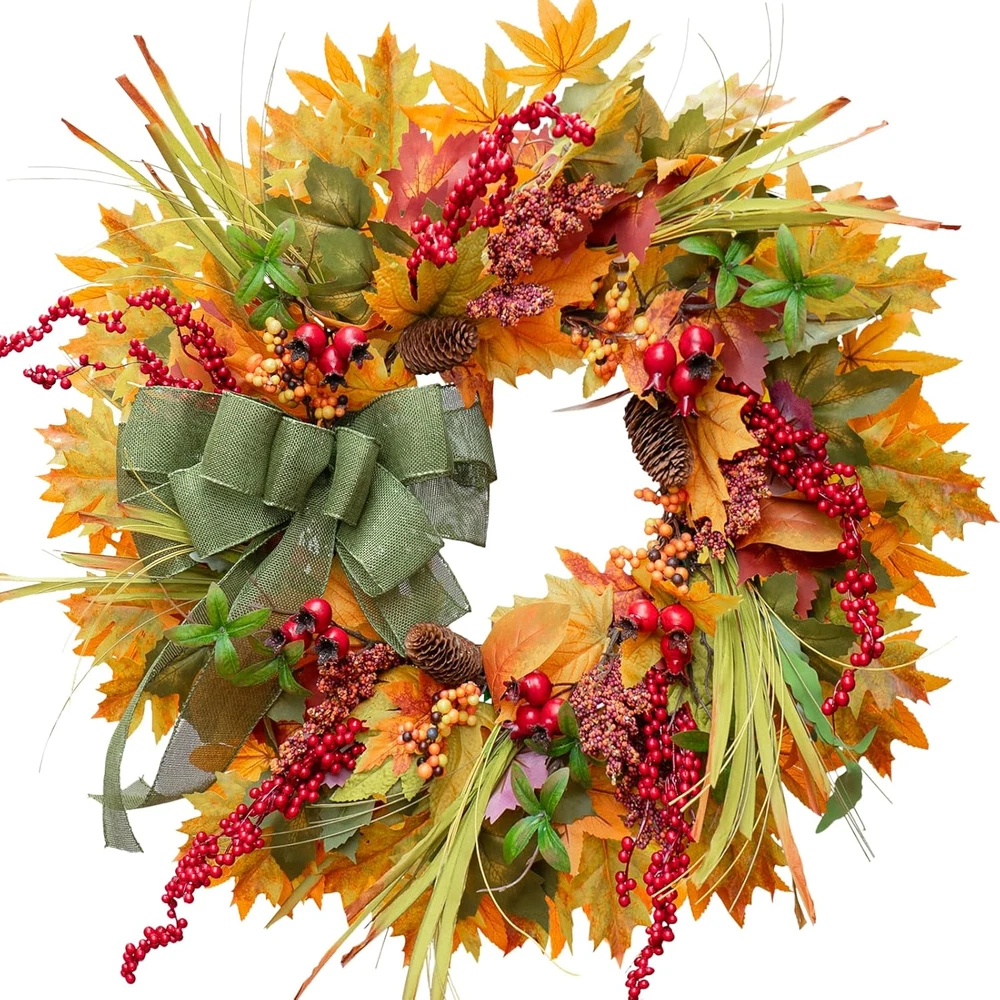 【Vibrant & Lifelike Fall Door Wreath】This 24 inch autumn wreaths for front door is filled with lifelike autumn leaves in warm tones, red berries, pine cones, and a charming green bow. It adds a stunning seasonal touch to your front door decor 【Premium Materials & Full Shape】 Outdoor fall wreath crafted with premium silk flowers, sponge berries, professional flower paper, and a sturdy natural vine base, this fall door wreath is lush, well-shaped, and long-lasting. No sparse spots—just full autumn beauty 【Handcrafted Fall Outdoor Wreath】Our fall front door wreath is professionally handcrafted by skilled florists. With detailed craftsmanship and solid construction, this wreath fall decoration will last year after year,not easy to fall off 【Perfect for Indoor & Outdoor Use】Use it as a fall wreaths for indoors, on your wall, fireplace, kitchen, or window, or as an outdoor fall wreath for your porch or front door. Ideal for Thanksgiving, Halloween, Harvest Day, and other seasonal events 【Easy Setup & Adjustable Design】Arrives in a sturdy box to protect the shape. Gently fluff the fall eucalyptus wreath upon arrival to reveal its full 24-inch diameter. Instruction card included for best display tips 【Thoughtful Seasonal Gift】This large fall wreath makes a beautiful gift for housewarming, autumn weddings, or Thanksgiving front porch decor. It's the perfect way to share festive spirit and warmth 【Worry-Free Service】Artificial silk fall wreaths for indoors don't need special cleaning, just wipe them with a dry cloth to keep them clean.Any problem in the process of use, please contact us in time, we will give you a satisfactory answer at the first time Product Description