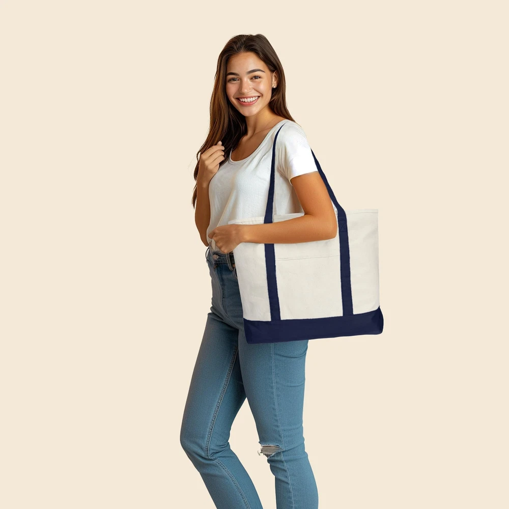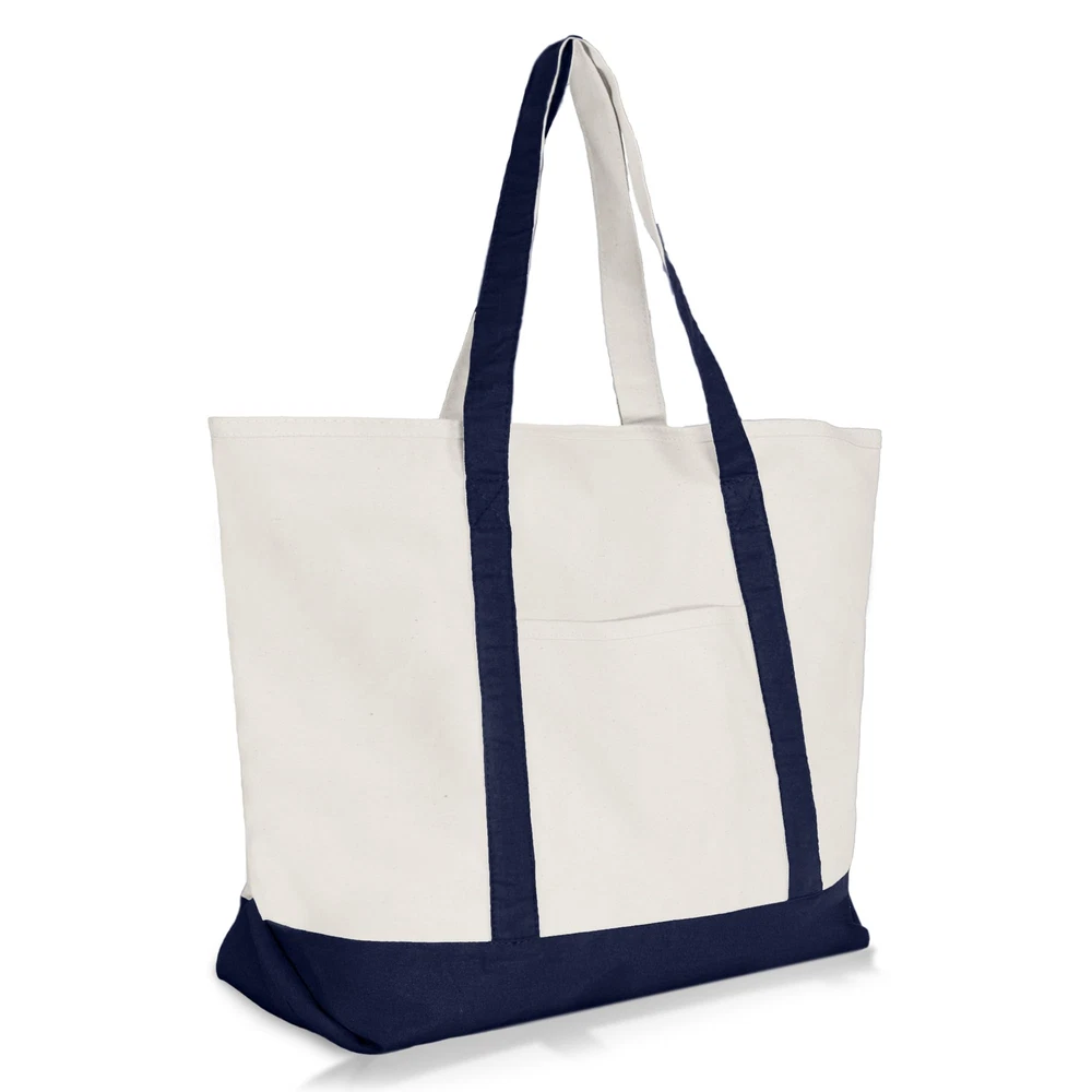 Destined to become your daytime essential, keep your daily items and documents with this characteristic 22" Cotton Canvas Shopping Tote. This tote features a heavy duty cotton canvas material with a Zipper opening to keep your goods safe. There is also a front pocket for accessories storage, and comes in 10 wonderful colors! FEATURES: Heavy Duty Shopping Tote with Large top zipper w/ front open pocket. COLORS: Black/Natural, Brown/Natural, Mint Green/Natural, Natural, Navy Blue/Natural, Orange/Natural, Pink/Natural, Purple/Natural, Red/Natural, and Royal Blue/Natural SIZE: 22" X 16" X 6". MATERIAL: 12 oz. Cotton Canvas. CLOSURE: Zipper, DROP STRAP LENGTH: 11" Features: Large zippered shoppingTote w/Front open pocket Material: 16 oz Size: 22" X 16" X 6" Colors: Navy/Natural Intended use: Shopping tote, reusable grocery bag, picnic bag, everyday carrying bag, camping and more!