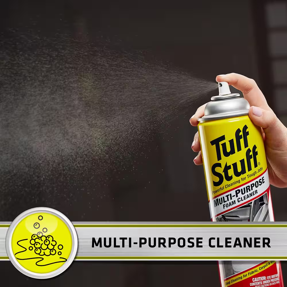 Powerful multi-purpose foam cleaner for auto, boat and home Industrial-strength stain removing power lifts dirt Deep cleaning foaming action for fabric, carpet, vinyl and more Tuff Stuff Multi Purpose Foam Cleaner offers powerful cleaning for tough jobs on a variety of surfaces. Thick foaming action helps to lift dirt off almost any surface for a versatile interior car cleaner. Use this multi purpose cleaner as a carpet cleaning foam, fabric cleaner, vinyl cleaner, or car upholstery cleaner. Simply spray the car interior cleaner on dirty or stained surfaces and let it work for 30 to 40 seconds. Scrub the area if needed, and wipe away the carpet wash and car seat cleaner with a clean cloth. It also works in your garage or home on painted walls, tile and floors. One 22 oz can of Tuff Stuff Multi Purpose Foam Cleaner Multi purpose cleaner works on a variety of surfaces for tough cleaning Car interior cleaner deep cleans fabric, carpet, vinyl and other surfaces Thick foaming action makes this car upholstery cleaner and carpet cleaning foam effective Works as a car seat cleaner, carpet wash, vinyl cleaner and fabric cleaner Cover area with interior car cleaner, let it sit, scrub and wipe the cleaner away Works on painted surfaces, tile and floors inside your home