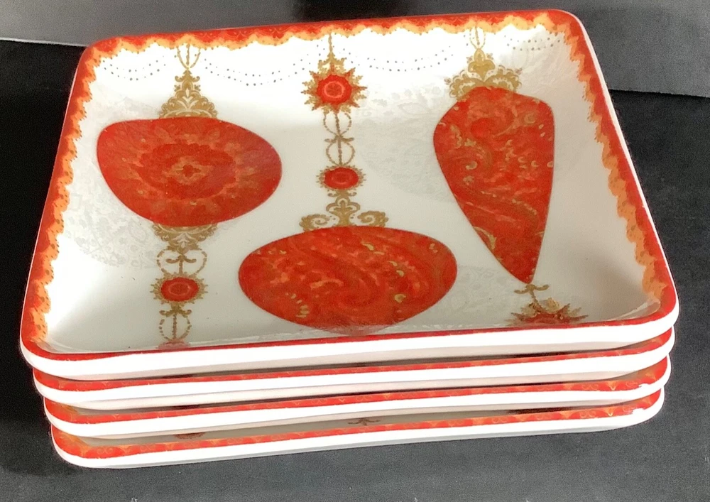 222 Fifth Constantina Red Salad Plates Set of 4 Christmas Ornaments NWOB * Product Notes: Set of 4; new without the box; 3 Red and gold ornaments on each plate; perfect for bread, salad, and/or dessertPorcelainDishwasher and microwave safeMade in Indonesia Size - 6.5” L x 6.5 “ W * Returns Accepted: If you are not satisfied with your purchase, contact me before leaving negative feedback. I am dedicated to buyer satisfaction and am happy to work with you to resolve any issue. Any return must be in the same condition as when purchased and buyer pays return shipping. * If you have any questions send me a message. I will get back to you as soon as possible. PLN: Rack 3