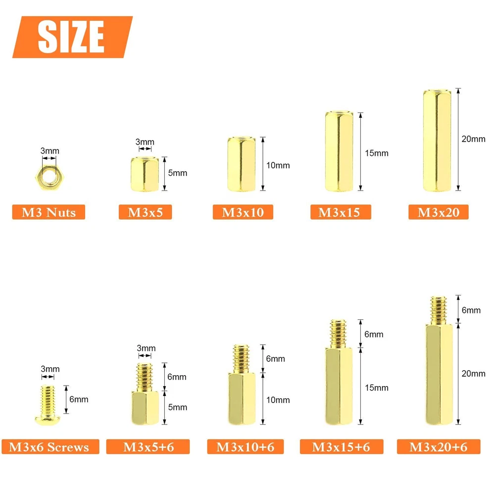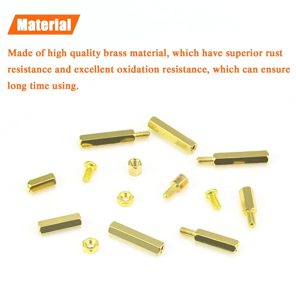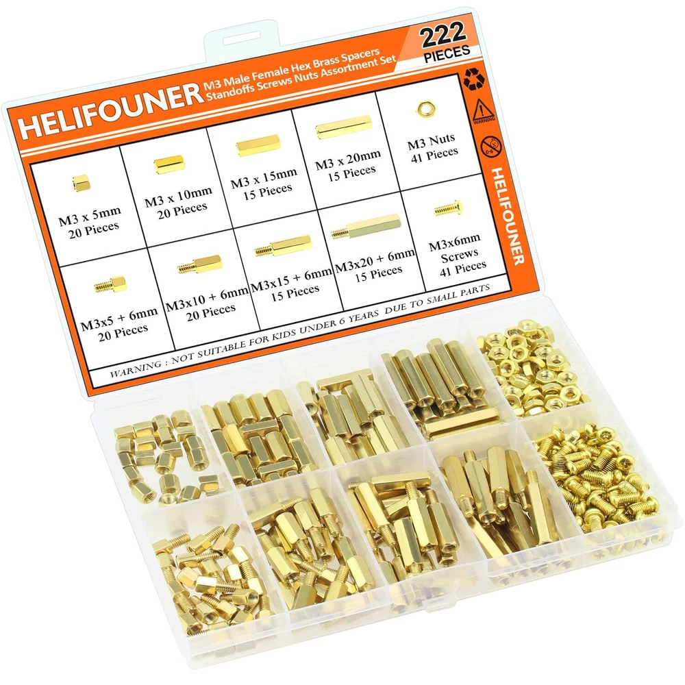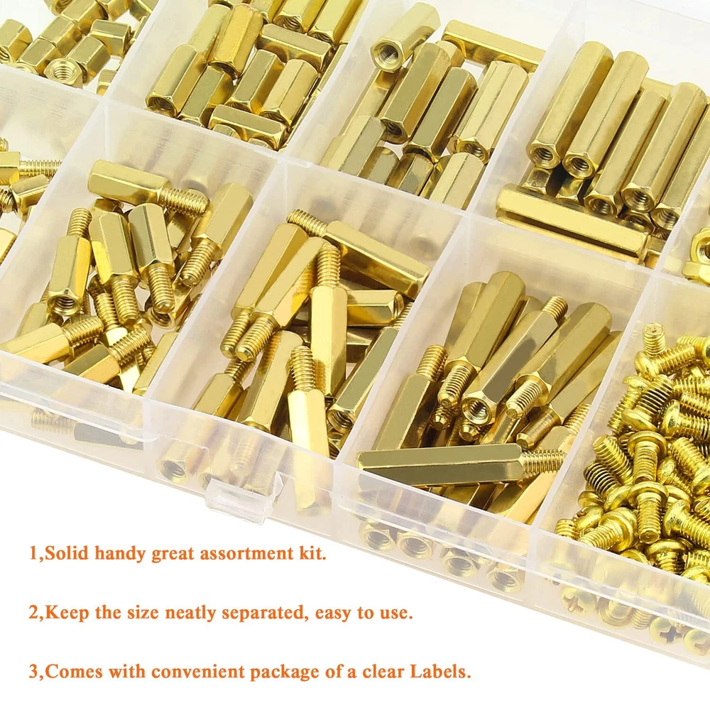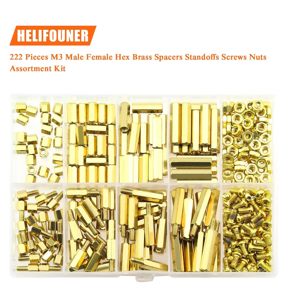 Amazing Deals Await! Welcome to my stores, The Smart of your choice and satisfaction guarantee. 222 Pieces M3 Male Female Hex Brass Spacers Standoffs Screws Nuts Assortment Kit, Threaded Pillar for Printed Circuit Board Motherboard Product Overview 【Specifications:】 - Sizes: M3 - Material: Brass - : Brass Standoffs - Package Quantity: 222 Pieces 【Features:】 - The brass spacer thread is deep and clear without burr, waterproof, rust resistant. - This set includes different sizes female-female, female-male standoffs, screws and nuts, different sizes can meet your different needs. - Applies to many area, they are very easy to install, electronic components and electronic hardware, standoffs are typically used to space circuit boards, panels, doors or gears. 【Package Included:】 <1> M3 Brass male-female standoff (5 mm + 6 mm) ------------------- 20Pieces <2> M3 Brass male-female standoff (10 mm + 6 mm) ------------------ 20Pieces <3> M3 Brass male-female standoff (15 mm + 6 mm) ----------------- 15Pieces <4> M3 Brass male-female standoff (20 mm + 6 mm) ----------------- 15Pieces <5> M3 Brass female to female 5 mm ------------------- 20Pieces <6> M3 Brass female to female 10 mm ----------------- 20Pieces <7> M3 Brass female to female 15 mm ----------------- 15Pieces <8> M3 Brass female to female 20 mm ----------------- 15Pieces <9> M3 Brass screws (M3 * 6 mm) ------------------------ 41Pieces . <10> M3 Brass nuts---------------------------------------- 41Pieces 【Package Quantity: 222 Pieces】 222 Pieces M3 Male Female Hex Brass Spacer Standoff Screw Nut. CHOKING HAZARD -- Small parts. Not for children under 3 years. Note: 1, Warning: small parts, keep away from children and kids. 2, If you have any questions, please feel free to contact us at any time. Key Features 【Sizes】M3 brass female to female length is 5 mm, 10 mm, 15 mm, 20 mm; The screw size is m3x6 mm, the thread pitch is 0.5 mm, total 222 pieces/10 sizes of the most commonly used spacer in a plastic case, different size can satisfy your different needs. 【Material】Made of durable brass material which have good corrosion resistance in bad environment high temperature, cold weather, and high humidity areas. They have superior rust resistance and excellent oxidation resistance, which can ensure long time using. 【Design】Brass standoffs is a fastener used to create space between two objects, often to properly position them. In the world of electronic components and electronic hardware, standoffs are typically used to space circuit boards, panels, doors or gears. 【Package Included】222 pieces 10 sizes in total, package in a durable transparent box with label. It is easy to distinguish the size of the product, you can choose the suitable one to meet all your needs. 【Wide Applications】The brass standoffs thread is deep and clear without burr. With the broad spectrum of length, thread, and diameter, this collection of brass standoffs should be almost universal and cover most hardware DIY projects for desktop computers and some electronics. Payment Guidelines ⦿ Payment is processed through eBay's secure system. ⦿ We accept PayPal and major credit cards. Shipping Information ⦿ We ship to the address provided at checkout. Please verify your address before placing your order. ⦿ Orders are processed within 1 business day (excluding weekends and holidays). ⦿ Delivery typically takes 3-5 business days. ⦿ We use reliable carriers such as UPS, FedEx, and USPS. ⦿ Shipping is available only within the contiguous United States. No shipping to Alaska, Hawaii, Puerto Rico, or PO Boxes. ⦿ If you experience any delays, please reach out to us for assistance. Return Policy ⦿ We offer a 30-day money-back guarantee. ⦿ If you're not satisfied with your purchase, you can return it for a full refund. ⦿ Please contact us for the return address before sending any items back.