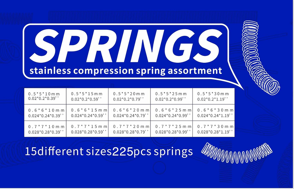 Easy to store: The springs are neatly packaged in a clean and transparent box. Each spring in the grid has corresponding size markings for easy selection and placement. Stainless steel material production: It will not rust in humid environments and has strong oxidation resistance, acid resistance, and corrosion resistance. We always pay attention to the size you truly need. We select 15 different sizes you may need from thousands of sizes. Plastic box packaging: 15 different sizes, 225 spring combination sets for easy access 225 pieces compression spring combination kit includes 15 sizes0.02*0.2*0.39'',0.02*0.2*0.59'',0.02*0.2*0.79'',0.02*0.2*0.99'',0.02*0.2*1.19'',0.024*0.24*0.39'',0.024*0.24*0.59'',0.024*0.24*0.79'',0.024*0.24*1.19'',0.024*0.24*0.99'',0.028*0.028*0.39'',0.028*0.028*0.59'',0.028*0.028*0.79'',0.028*0.028*0.99'',0.028*0.028*1.19''. stainless steel springs : It will not rust in humid environments and has strong oxidation resistance, acid resistance, and corrosion resistance.
