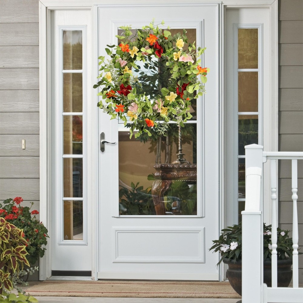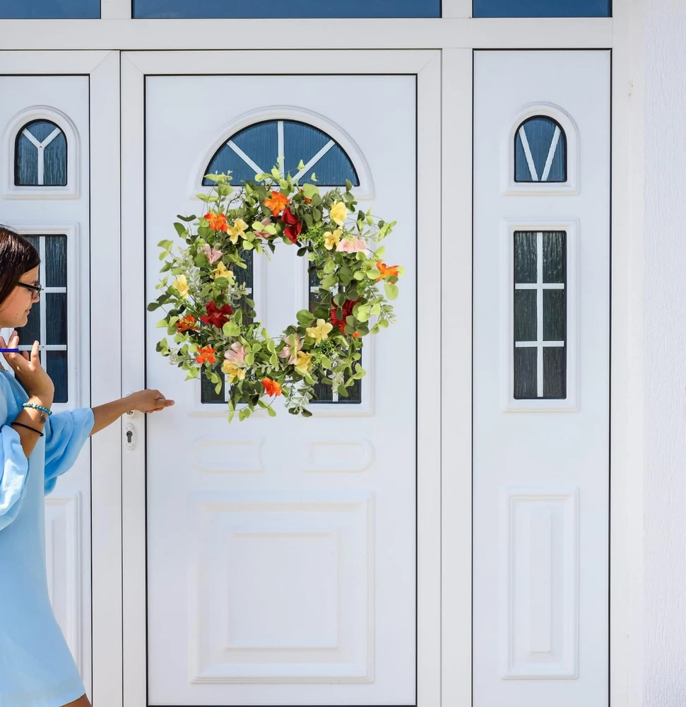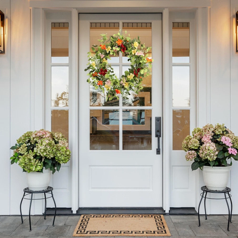 22IN Artificial Spring Summer Wreath with Wild Flowers & Silk Daisies Eucalyptus, UV Resistant, Colorful Wreath - for Spring Summer Indoor Outdoor Home Décor Product Details Color: Daisy Brand: Pudate MPN: Does not apply UPC: Does not apply EAN: Does not apply Color: Daisy Brand: Pudate Material: Silk Mounting Type: Door Mount Shape: Round Product Dimensions: 5"D x 22"W x 22"H Occasion: Casual Manufacturer: Pudate Color: Daisy Brand: Pudate Material: Silk Mounting Type: Door Mount Shape: Round Product Dimensions: 5"D x 22"W x 22"H Occasion: Casual Manufacturer: Pudate Item Weight: 1.59 pounds Country of Origin: China Date First Available: November 26, 2023 Vibrant wildflower display: Bring the charm of a blooming meadow into your space with our spring wreath. Perfect for front doors, walls, windows, mirrors, porches and living rooms. Each Daisy Flower Elegance: Precisely crafted, our daisy flowers add a touch of sophistication to your decor. Imagine your guests being greeted by the timeless beauty of daisies, making every entrance a delightful experience. The vibrant and realistic colours enhance the aesthetic appeal of the wreath. Berry accents: Add a touch of playful charm to your surroundings with our berry-infused Spring Wreath. The strategically placed berries not only enhance the visual appeal, but also evoke a sense of nature's abundance, inviting warmth and cheer. The vibrant berries contribute to the wreath's vibrant and inviting appearance. Eucalyptus leaf charm: Fill your home with the invigorating scent of lifelike eucalyptus leaves. As a customer, imagine the soothing aroma and delightful texture that will add a touch of elegance to any room, creating an atmosphere of relaxation. The base of the wreath is made from a strong and durable grapevine, providing both strength and stability. A perfect gift option: Beyond its visual appeal, our Spring Wreath makes an exceptional gift. Imagine the joy of presenting this vibrant and lifelike wreath to a loved one - a gift that not only adds beauty to their space, but also reflects your thoughtful gesture.