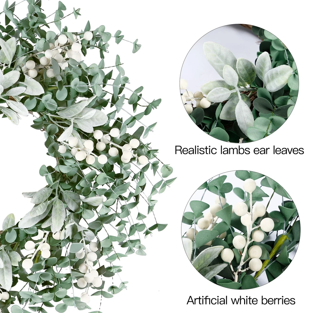 Looking for the perfect focal point to spruce up your front door or entryway? This artificial greenery leaves wreath is a perfect and welcoming front door decor. Product specification: Materials: soft foam Size: Outer diameter: 22’’ Color: Green Application: front door, window, indoors, outdoors, window, fireplace, farmhouse, living room, porch, centerpiece party, wedding, holiday and festival celebration Features: This spring wreath has a longer lifetime compared to the real one, the shape and color will stay fresh even a few years later, no need to water or sunlight. This handmade wreath can be used as a gift for holiday decoration, festival gift, wedding,anniversary and christmas day etc. Thisgreenery boxwood wreath has special design, made of soft foam leaves and flocked lambs ear with purely manual process. The appearance of the wreath is very natural, just like the real one. Package Included: 1×Artificial Greenery Leaves Wreath [HIGH QUALITY WREATH]: This artificial greenery leaves wreath is made of soft foam. The base is durable natural grapevine full of greenery leaves, flocked lambs ear and white berries. The entirely realistic wreath is vivid and vibrant. [PROPER SIZE]: 22 inches after fluffing. Since the wreath is packed in a relatively small box to satisfy transportation requirement, you need to expand the branches and adjust flowers into best shape and you'll get a 22 inch full wreath of enough size. [VERSATILE DECOR]:This greenery boxwood wreath is suitable for front door, wall, indoors,outdoors,window,fireplace,farmhouse, living room, porch, centerpiece party, wedding, holiday and festival celebration. It will provide your home a feeling of natural and vitality. [EASY CLEAN]: This flocked lambs ear wreath is convenient to clean, just wipe it with a try towel to make the wreath like brand new. The berries and branches are not easily falling apart. This wreath can be used for a long time. [NOTES]: If used outdoors, please make sure to hang it under the cover to avoid rain and snow. Please don’t hesitate to contact us if you have any questions, we will try our best to help you!