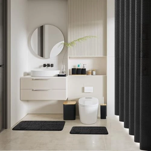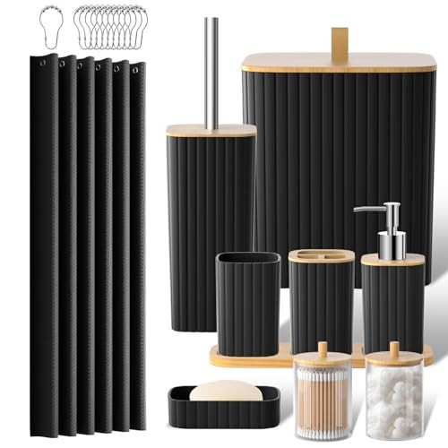 Return Policy Fast Delivery Trusted seller Bathroom Accessories Set - 22PCS Black Bathroom Set with Shower Curtain, Trash Can, Toilet Brush Holder Set & Soap Dispenser – Stylish & Functional Bath Decor for Home, Apartment Product Description 90% Pp/10% Abs COMPLETE 22-PIECE BATHROOM SET – This black bathroom set includes a jacquard shower curtain, a toilet brush and holder set, a trash can, 2 cotton swab boxes, a tumbler, a soap dish, a toothbrush holder, a soap dispenser, a tray, and 12 metal shower curtain hooks. Everything you need to transform your bathroom into a stylish, functional, and perfectly organized space. POWERFUL FUNCTIONALITY –①9L large-capacity trash can with lift-off lid.②Toilet brush with cover, keeps water off your hands.③The tray holds toothbrush holder, tumbler, and soap dispenser for easy organization.④Cotton swab box neatly stores cotton balls, swabs, and floss picks, keeping essentials tidy.⑤3-hole toothbrush holder separates toothbrushes and toothpaste for a clean and hygienic setup.⑥Soap dispenser ensures easy and mess-free access to liquid soap, enhancing convenience. SHOWER CURTAIN FOR A CLEAN BATHROOM – 71" x 71" shower curtain fits most showers or tubs, Made of high-quality polyester fabric, offering superior water resistance to prevent splashing and keep your bathroom dry. Its wrinkle-resistant and tear-proof design ensures long-lasting use, while the 12 stainless steel hooks glide smoothly for easy installation. Perfect for maintaining a clean and fresh bathroom environment. DURABLE & EASY-TO-CLEAN – Every piece in this machine washable bathroom set is designed for practicality and convenience. The smooth surfaces make cleaning a breeze—just wipe with soap and water to maintain their pristine look. The shower curtain and rugs are machine washable, ensuring they stay fresh and elegant even with regular use. The countertop bathroom set with tray can effectively organize your tabletop, so you don't have to worry about it being untidy again. MODERN BATHROOM SET – This elegant complete bathroom set combines minimalist design with contemporary bathroom decor, perfect for apartments, guest bathrooms, or small spaces. Whether you need a playful option for kids or a stylish upgrade for your own home, this versatile collection enhances any bathroom decor. A thoughtful gift for housewarmings, weddings, or birthdays. Shipping Returns Payment Shipping Shipping is FREE to all addresses other than APO/PO boxes in the lower 48 states. All our stock ships from US-based warehouses. Shipped via USPS or UPS (depending on location and package weight) Unless stated otherwise, all orders will ship within 24-72 hours of your payment being processed. Check our feedback to see the great reviews of FAST shipping we offer. Returns Seller does not accept returns Payment We currently accept payment via eBay managed payments only. Once payment is cleared, we will dispatch your shipment within 1-3 business days. Please refer to the "Shipping" tab for more information regarding shipping speed to your destination.