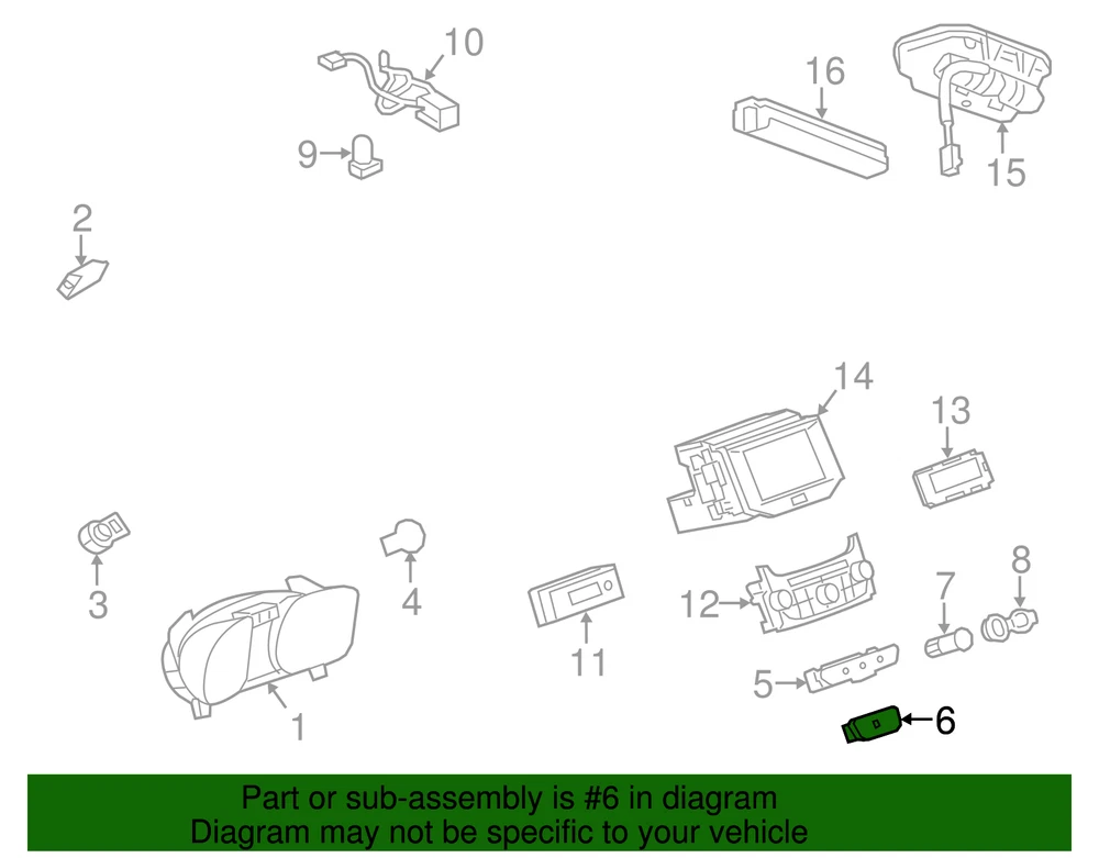 VRAY-GMC 23191938 Part can be found as # 6 in the diagram above Product Description Without park assist, with lane departure. This GM Genuine Part is designed, engineered, and tested to rigorous standards and is backed by General Motors Specifications Brand GM Manufacturer Part Number 23191938 SKU 23191938 Product 23191938 Replaces 22956751 ONLY PART REFERENCE #6 ON THE DIAGRAM IS INCLUDED WARNING : May cause cancer and reproductive harm. See www.P65Warnings.ca.gov for more info. Terms and Conditions Thank you for shopping with us. Please find our policies below. If you have any other questions, please don't hesitate to contact us. Shipping Terms In stock orders ship within 24 hours. Weekend orders will be processed the next business day. If a part is not in stock and must be ordered from the manufacturer, it usually takes 2-3 days to arrive to us and will be promptly shipped to you. Most of the orders are shipped complete within 2-3 business days. A few of the parts ordered from the manufacturer may take up to 5-6 business days to arrive and will shipped to you immediately. Depending upon location, ground shipments usually take 2-7 days. Your order may be shipped Overnight for an additional cost. Oversized shipments will be additional; you will be contacted prior to shipping for approval. We cannot guarantee transit times for ground and oversize orders. Shipping Carrier substitutions may be made at our determination in an attempt to reduce shipping cost to the customer. We do not ship internationally. In the unlikely event that a part has been placed on backorder or discontinued, we will do our best to try and find one for you as quickly as possible. We do not ship COD orders. Return Policy Contact us to arrange for any returns. A copy of the invoice will need to be included with the return. Parts must be resaleable and in the original packaging. We cannot take back used parts. We cannot take back installed or tried parts. Electrical parts are not returnable. We do reserve the right to refuse and return any parts we find have been installed, are used or do not meet the above criteria. Return request need to be within 30 days of receipt. Cancellation Policy An order or a portion of an order may be cancelled up until the time it is shipped and no longer in our possession. Home • Newsletter Signup • Contact Us Copyright © 2024 VRAY-GMC , All rights reserved. Solution by RevolutionParts, Inc. :: Design by OCDesignsOnline