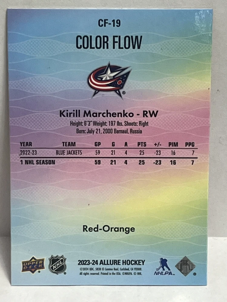 23/24-Allure Kirill Marchenko- Blue Line #27/35 & Orange Bar Down#246/399-Red Rainbow and 2 Color Flow Cards and Black Rainbow,4 Card Lot is a must-have for any Columbus Blue Jackets fan or hockey card collector. This rare set includes a limited print run of 35 cards featuring the talented player. The striking blue parallel and two-color flow cards add a unique touch to this Upper Deck Allure collection, making it a standout addition to any sports trading card collection. Selling 6 cards as is. Seller takes no responsibility for lost or damaged cards on route to buyers destination and any delays in shipping.