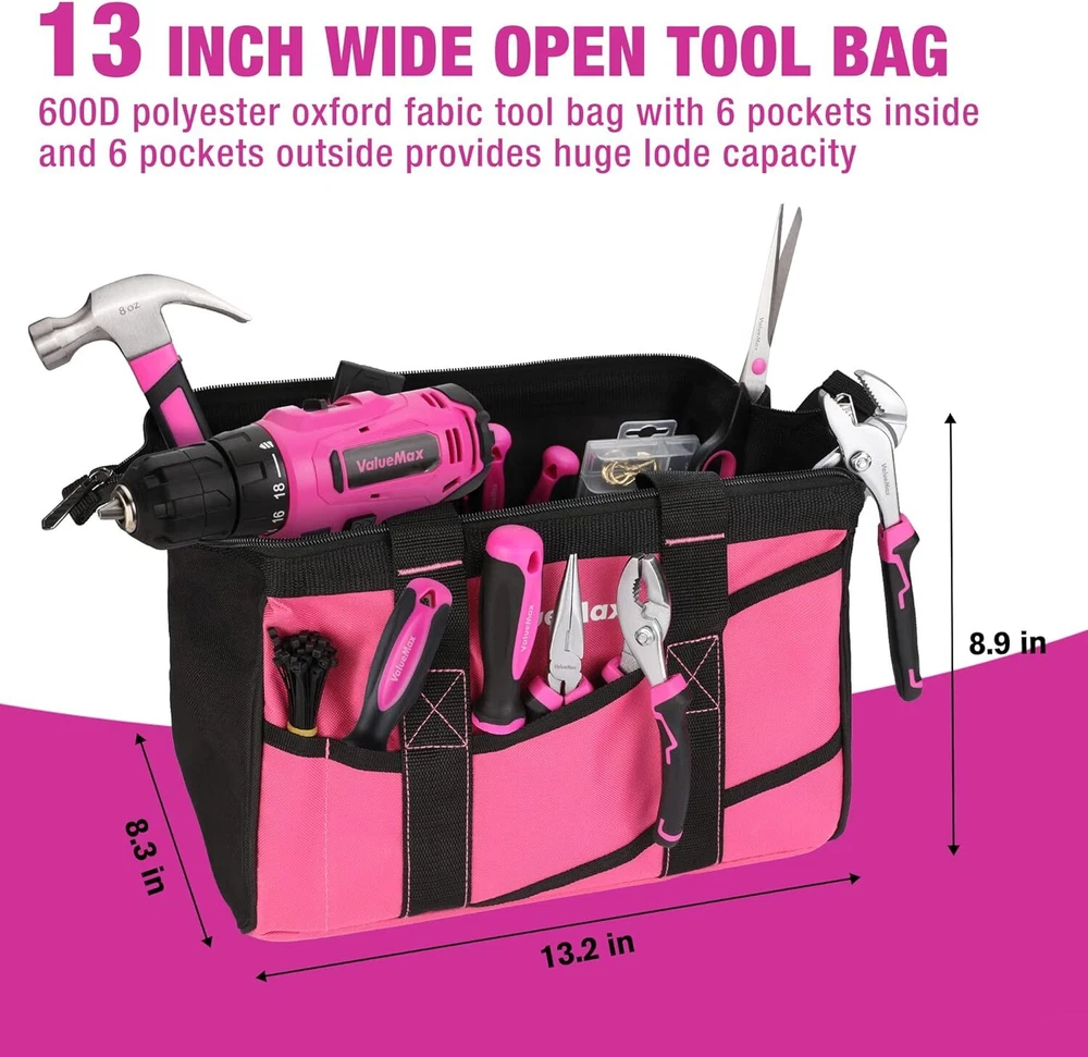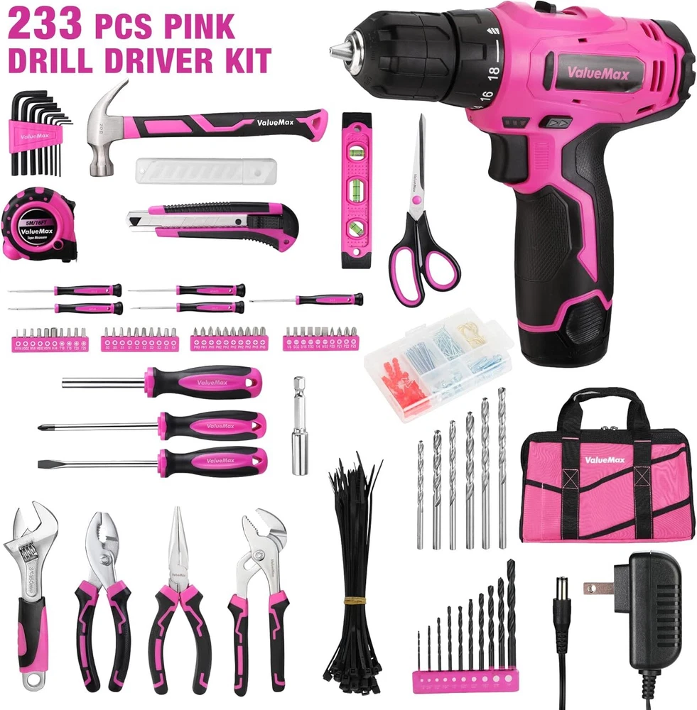 Product Description Home Tool Kit with Drill, 233-Pieces Pink Tool Set with 12V Cordless Lithium-ion Drill, Power Tool Set with Wide Mouth Open Storage Bag, Basic Drill Sets Combo Kit for DIY and Daily Repair PINK CORDLESS DRILL DRIVER: Our 12V cordless drill with 2-speed, 19 torque settings gives enough variability, a 3/8" keyless chuck gives max compatibility, built-in LED Illuminate dark working environment. Ideal drill kit for home maintenance and garage repairs. BASIC TOOL KIT FOR HOME: Contains almost every necessary tools you need for work and DIY projects around the house, garage, or office. The toolset includes drill driver set, pliers set and adjustable wrench, screwdrivers, magnetic holder and bits, utility knife, hammer, tape measure, torpedo level, hex key, cable ties, and other hardware accessories. BUILT TO LAST: Equipped with household essential tool sets that are constructed of forged steel with heat treatment for strength and durability, and chrome plated to resist corrosion. This tool set will provide long-lasting service life. The handle with ergonomic non-slip design is comfortable to hold and is convenient to apply force. PORTABLE PINK TOOL BAG: This 13-inch tool bag is made from 600D polyester fabric which provides unmatched durability and reliability. The wide-open mouth provides you instant access to your tools as well as visibility to the tool you want to use. 6 pockets outside and 6 pockets inside are perfect for organizing the pink tools. PERFECT GIFT CHOICE: This 233 pieces pink tool set includes all the most useful and necessary tools, ideal for home maintenance and daily use. The perfect Christmas, birthday, Anniversary, or Valentine's Day gift for your Lover, family, and friends. About Us We are a reputable seller with many years of experience selling on eBay. Our goal is to provide high-quality products and excellent customer service. Shipping Items will be shipped within 1-3 business days when we received payment. (Orders are not processed on weekends & holidays) Tracking information will be sent once item is shipped. Delivery time depends on destination and other factors Item is shipped to ebay address. Leaving correct address can minimize delay. For international shipping and shipping to Guam, Hawaii and Alaska, Please contact us before placing the order. International buyers please note: Import duties, taxes and charges are not included in the item price or shipping charges. These charges are buyer’s responsibility. We will try our best to reduce the risk of the custom duties. Local pick-up is unavailable at the moment. Contact Us We reply any email messages within 1 business / working days(off-duty at weekend). If you do not get a response from us, then please check your junk or spam mailbox. Our Business hours: Mon-Fri 9:00-18:00, UTC/GMT +8 hours. Please contact us either by clicking "contact seller" in the "purchase history" section or simply click "ask a question" at the bottom of this page. If you are unsatisfied with our item or service, please contact us before leaving any feedback. We are committed to resolve all issues in a friendly and satisfactory manner.
