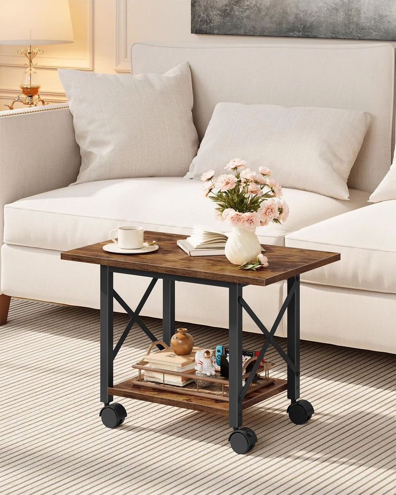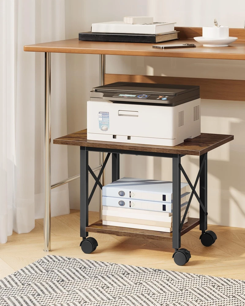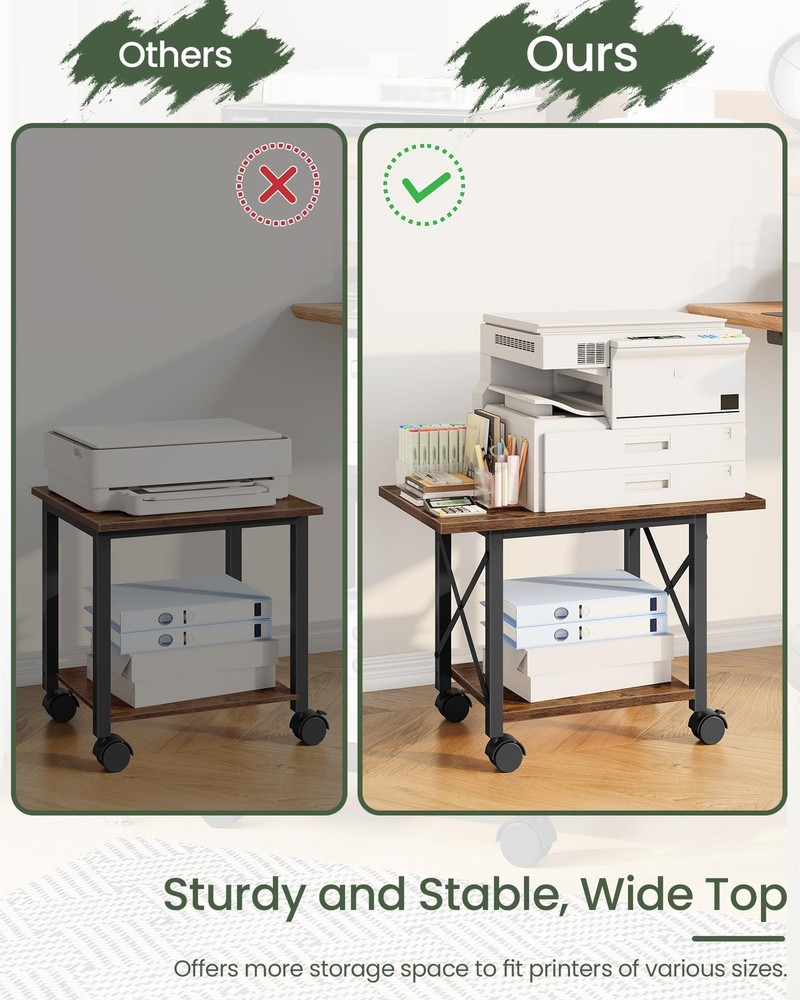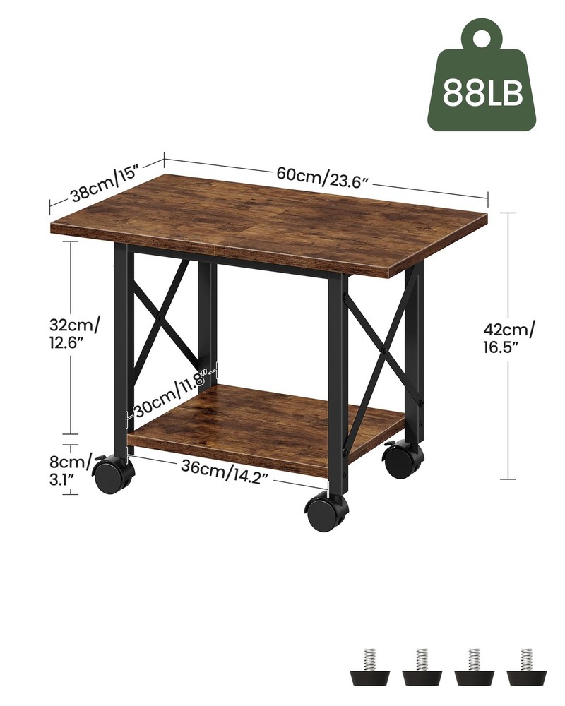 Printer Stand with Wheels/Adjustable Feet The printer stand features premium particleboard with a sturdy metal frame and X -crosses for durability. It has 4 casters and 4 adjustable feet, offering two installation options for flexibility. The larger top meets diverse placement needs, and its rustic brown or solid black finish adds elegance. It's functional and stylish, suitable for home and office use, creating an efficient and comfortable workspace. Spacious Panels for Easy Storage: The wide top, sized 23.6"L x 15"W, easily fits most home printers. The lower shelf offers space for small printers or paper storage. The tiered design maximizes space and versatility for diverse office needs 2 Options for Flexible Use: The printer stand is equipped with 4 casters and 4 adjustable feet for flexible use. The casters, two of which have brakes, allow for easy mobility, while the adjustable feet ensure stable desk placement Versatile Use: The printer table is ideal for storing office supplies like scanners, copiers, and printers. It also doubles as a storage shelf for books, plants, and more, fitting seamlessly into kitchens, living rooms, offices, and other spaces Premium Build for Durability: The printer stand features quality particleboard and a metal frame for durability. The side X-crosses offer excellent stability and support. The top shelf can bear 88 lb Effortless Assembly: With a straightforward structure, clearly numbered parts, easy-to-follow instructions and all necessary tools, you can quickly assemble the print stand and put it into use in no time