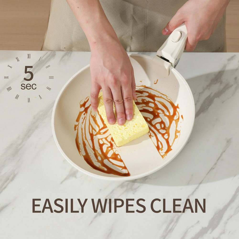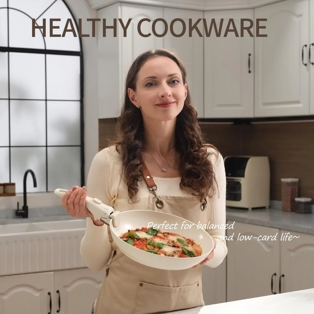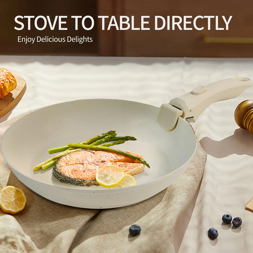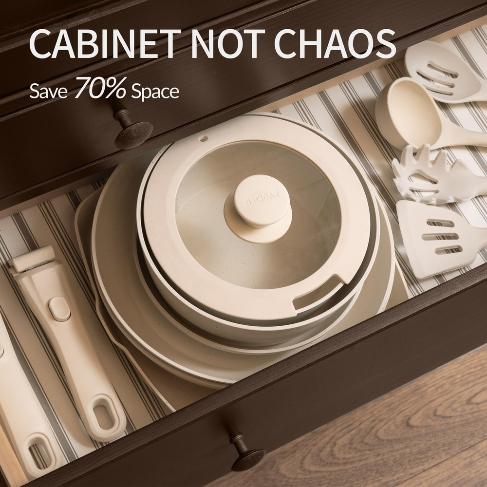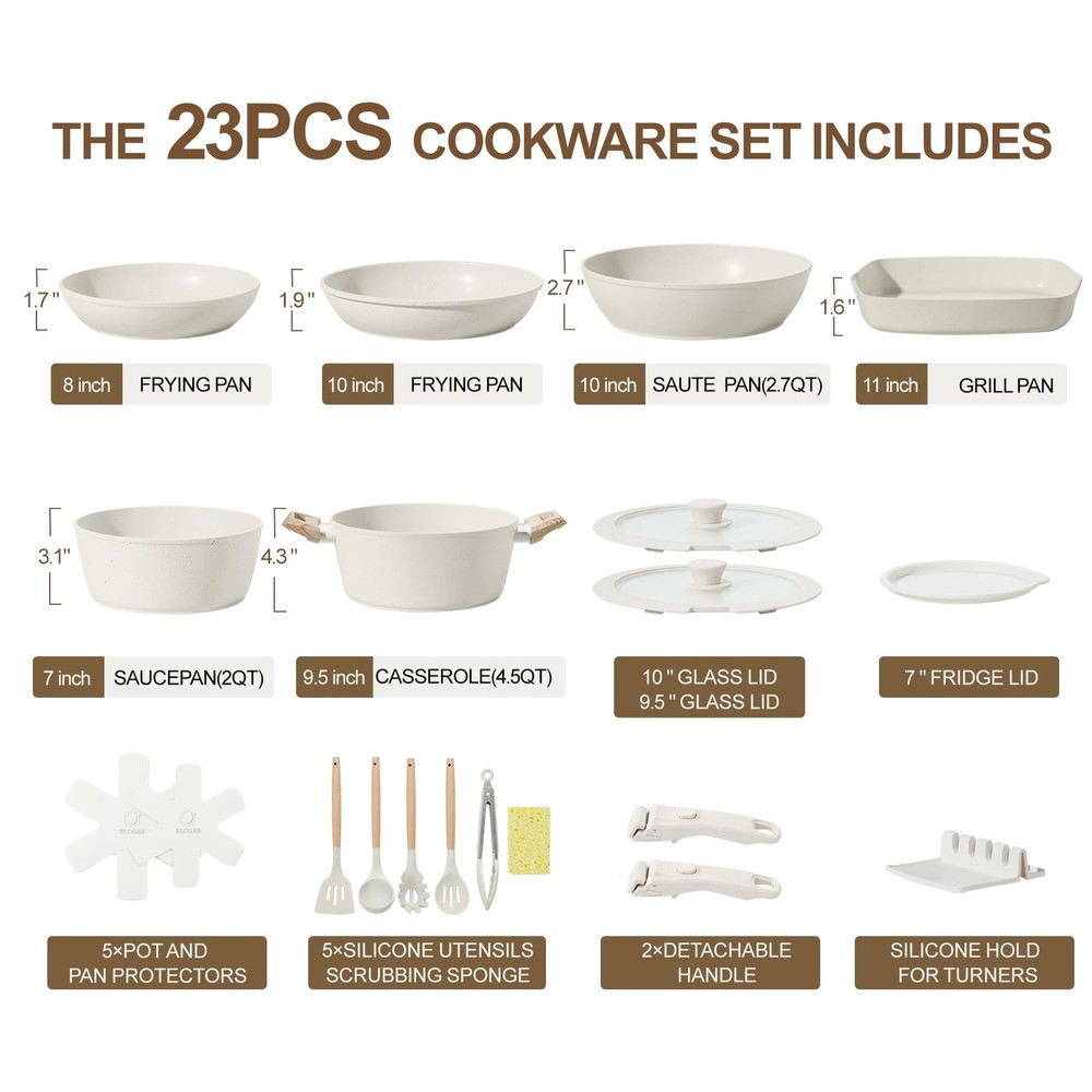 23pcs Ceramic Nonstick Cookware Set, Nonstick Detachable Handle Ceramic Cookware, Induction Kitchen Cooking Set with Removable Handle,include Frying Pans & Saucepans Oven Safe, Stackable Set 1. High-Performance Nonstick Coating: Non-stick performance, PFOS/PFOA free, our cookware ensures your daily cooking is always safer and healthier. 2. Secure Removable Handle: Support up to 22 pounds, the handle is heavy duty tested, fit for removable handle set pots and pans, no need to worry about wobbly handles. 3. Easy Cleaning & Wide Compatibility: Just a cloth and rinse it with water, less water wasted.recommend hand wash,it is really easy to clean. with extended bottom design. Our nonstick cookware can work on all cooktops, including induction. 4. Stackable and Compact: Save up to 75% more space with stackable pots and pans set and detachable handles, allowing for storage in cabinets or RVs. 5. 23PCS Complete Set: 8 Inch 10 Inch Frying Pan ,10.5 Inch Grill Pan , 1.6” Qt 7” SaucePan with Fridge Lid, 10” Saute Pan with Lid, 4.3Qt 9.5” Casserole with Lid, 2 x Detachable Handle , 5 x Pot and Pan Protectors,4 x Silicone Turner and Soup Ladle,1x Tongs, 1 x silicone holder for turners,1 x scrubbing sponge