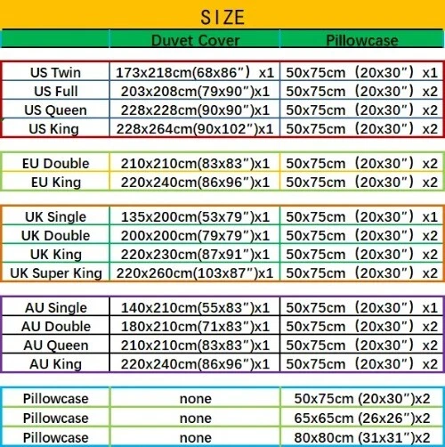 Warm tips: >> first check the size of the quilt (Duvet), and then select the appropriate size of the quilt Cover according to the size of the quilt >> The size of the pillowcase inside the duvet set is 50x70cm. If you need to order pillowcases of other sizes, you can choose to purchase them separately Reminder: Other pillowcase sizes: 65x65cm / 80x80cm ( Note:These two sizes do not include duvet covers,Only 2 pillowcases ) . Please purchase with caution Material : Polyester fiber (polyester) features 1. The fabric is smooth, breathable, comfortable and warm 2. Digital printing, healthy and environmentally friendly 3. Available in various sizes, suitable for all kinds of people in all situations Note: 1.This bedding set does not include any comforter or filling. 2.Set includes:1 duvet cover+1/2 pillowcase (no bed sheet) , 3.Due to long distance shipping,the bedding set may be a little wrinkled,it's normal. 4.The correct temperature for cleaning is below 35 ℃. You may worry about: 1. Is the color of the quilt cover different from that of the picture?Will it fade? The difference is small, and the real color saturation is also very high;Not easy to fade after being washed 2. Does the size of the quilt cover match my quilt core? Please check the size chart carefully before ordering. How big the quilt core is and how big the quilt cover is, the error is within 3cm. Payment Delivery details Returns Contact Us Feedback Payment 1.We accept PayPal only. 2.Payment must be received within 7 business days of auction closing. 3.We ship to your eBay or Paypal address. Please make sure your eBay and Paypal address is correct before you pay. Delivery details We try our best to ship out same day for payment cleared before 5.00 PM (Pacific Time) , Order placed on weekend or holiday will be shipped on Monday or next working day. Below is the approximate delivery time to different countries (just estimated, not guaranteed): 7-25 working days to buyer in USA. Returns 1.We offer 30 days return policy. Please contact us within 30 days from the date you receive your order if you have any issues with the product and want to return. 2.All items must be returned in the original packaging and you must provide us with the tracking shipping number, specific reason for the return, and your eBay ID. 3.We will refund you FULL WINNING BID AMOUNT, upon receipt of the item in its original condition and packaging with all components and accessories included, AFTER BOTH Buyer and Seller cancel the eBay transaction. Or, you can choose to get a replacement. Contact Us All communication is done through EBAY MESSAGES ONLY. If any question, please feel free to contact us via "Ask seller a question" or "Contact Seller",We try our best to reply to your emails as soon as possible, due to high volume of daily incoming emails and time zone difference, we may not be able to reply your emails immediately. Please allow 1-2 business days for us to response. Feedback Feedbacks: When you receive the item and satisfied with the product, please leave us positive feedback. If for any reason you are not satisfied with your purchase from us, please contact so we can get to work and resolve this issue for you. Please don't leave neutral or negative feedback without giving us an opportunity to try and make it right. Our goal is to ensure a happy shopping experience with us. Your Positive feedback is very much appreciated!