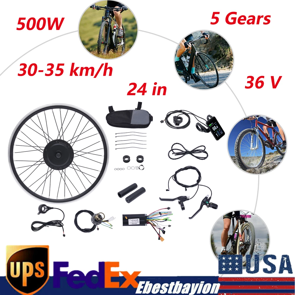 24" 36V 500W Front Wheel E-Bike Conversion Kit Hub Motor Bicycle Motor Kit LCD Electric Bicycle Motor Kit 36v 500w Front Wheel E-bike Conversion Kit E-bike Cycling Hub Conversion Dual Mode Controller. Description Do You Want to Convert Your Favorite Bicycle into an Electric Bicycle to Enjoy Its Power and Comfort? Then You Can't Miss Our Electric Bicycle Motor Conversion Kit. the Display and Pedal Sensor Will Allow You to Quickly Switch Between Throttle Control, Cruise Control and Pedal Assist Sensor (Pas) to Enjoy Feeling the Headwind on the Road. It Will Be Ideal for You! Key Features Enjoy Riding: It Converts Your Bike into an E-bike for Efficiency and Convenience, Allowing You to Fully Enjoy the Fun of Riding on Your Commute and Short Journeys. Complete Set: This Kit Contains the Complete Range of Accessories Needed to Convert Your Bike Without You Having to Buy Them Separately. the Matching Kit Will Provide You with More Consistent and Stable Performance. User-friendly Features : According to Different Road Conditions and Personal Needs, It Allows 5-Gear Speed Adjustment. at the Same Time, When the Riding Speed Is Maintained, Pressing the Button Key for 2-3 Seconds Will Enter the Cruise Function, Making the Riding Process Easier! Powerful Motor : with a 500w Brushless Gear Motor, It Can Reach a Maximum Speed of 30-35km/H. Compared to Brush Motors, It Allows for Smooth and Low Noise Operation Without Replacing the Brush, Thus Making Maintenance Easier. Safe and Reliable : the Brake Lever Can Cut off the Power Supply of the Motor in Case of Emergency Braking, so That the Bicycle Can Stop in Time to Ensure Riding Safety. Dual Mode Controller : the Motor Works Under Hall Effect and Non-hall Effect. If the Component Fails, the Controller Will Switch to Non-hall Effect Mode and the Motor Will Continue to Work. Robust and Durable : the Aluminum Alloy Wheel Frame Is Very Durable, Stable, R ust-proof and Wear-resistant , Ensuring Long Service Life and Strong Load-bearing Capacity, up to 264lbs . Customer Service: We Aim to Provide Quality Products and Services. If You Have Any Problems, Please Feel Free to Contact Us. We Will Reply and Solve the Problem for You As Soon As Possible. Details Practical Display: the Display Shows Real-time Speed, Maximum Speed, Average Speed, Total Mileage, Single Mileage, Battery Power Display, Assist Gear/Speed Grading, Cruise Function, so That You Can Charge in Time and Intuitively Keep Track of Its Operating Status. Pedal Assist Sensor: the Pedal Assist Sensor (Pas) Can Sense the Pedal Rhythm and Adjust the Motor Speed Accordingly. It Allows You to Ride an Electric Bicycle Without Throttle Response, Which Helps on Long Trips and Reduces Wrist Soreness. Waterproof Controller Bag: the Waterproof Controller Bag Can Safely Store the Controller and Allow for Rainy Days Riding. Application It Is Suitable for Assembling and Converting the 24in Front Wheel of a Bicycle. It Is Compatible with Universal Disc Brakes and V-shaped Brakes. Specifications Material : Aluminum Alloy Color: Black Suspension Type: Front Special Feature: Electric Assembly Requirement: Yes Brake Type: Power-off Brake Lever (Applicable to V Brake, Disc Brake) Motor Type: Brushless Gear Motor Gear Adjustment: 5 Gears Recommended Battery: 36v 13ah or Higher Capacity Battery(Not Included) Output Voltage: 36v Power: 500w Minimum Flat Fork Distance: 100mm/3.94in Speed: 30-35km/H Display Size: 6.8*9.6cm/2.67*3.77in Packing Size: 55*55*22cm/21.65*21.65*8.66in Motor Wheel Diameter: 61cm/24in Gross Weight: 9kg/19.84lbs Net Weight: 8kg/17.63lbs Loading Capacity: 120kg/264lbs Package Included 1* Motor Wheel 1* Display 2* Brake Levers 2* Throttles 1* Padel Sensor 1* Controller 1* Thumb Knob Handle 1* Controller Bag All Accessories for Assembly Notes While Connecting the Controller to the Wires, Please Make Sure That You Connect the Right Colors to the Controller. Otherwise, the Controller May Be Broken. This Kit Does Not Include Tires, Batteries and Chargers, Which Need to Be Purchased by Customers. Please Check the Product Size and Practical Voltage Before Purchasing. It Is Suitable for the Front Wheel of a Two-wheeled Bike. It Cannot Be Used for Three-wheelers or Multi-wheelers. Please Allow the Slight Color Di fference Caused by the Shooting Light and 1-3cm Error Due to Manual Measurement, and Make Sure You Do Not Mind Before You Payment Delivery details Terms of sales About us Contact us Payment We accept ebay payment 。 Fees such as import duties, taxes are not included in the item price or shipping costs. These charges are the buyer's responsibility. Delivery details Shipping: 2-9 working days to: USA Terms of sales We maintain high standards of excellence and strive for hundred percent customer satisfaction. Feedback is very important to us. We hope that you contact us immediately before you give neutral or negative feedback, so that we can address your concerns. It is impossible to address issues if we do not know about them! About us Your satis faction is our ultimate goal. We work hard to earn your trust and future business. Our certified technicians have tested each item before shipping. The unit comes with 1 year limited warranty on all manufacturing defects. a) If you receive a defective item, you may return it or ask for a discount. Please contact us within 14 days after you receive the package. b) What you returned must be intact and in its original packaging as re? u. Customer is responsible for shipping costs of the returned item. c) We will cover the cost of shipping back t with the shipping rate indicated in the registration page. We will send you a new unit or refund the full payment you paid. Thank you. Contact us Business Hour Business Hour: Monday To Friday: 8:30 AM to 5:00 PM (Beijing China time) Due to time zones, our reply to your questions may not be immediately. But within above working time, we will reply your email within 24 hours. If it's non-workdays, please kindly be patient 