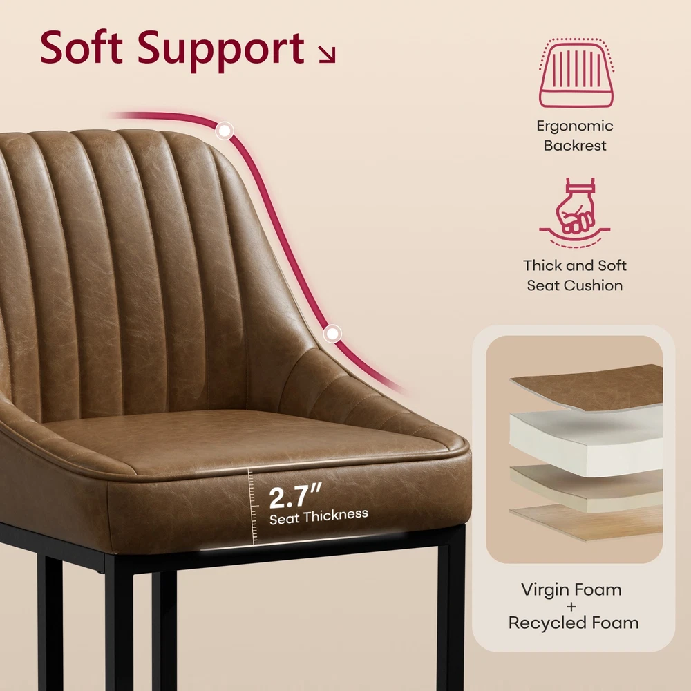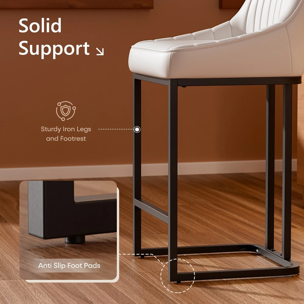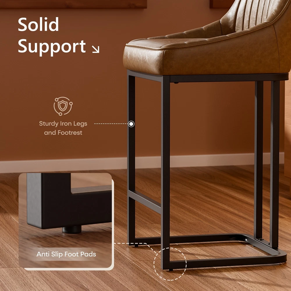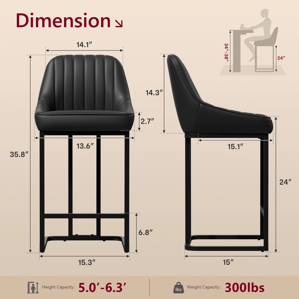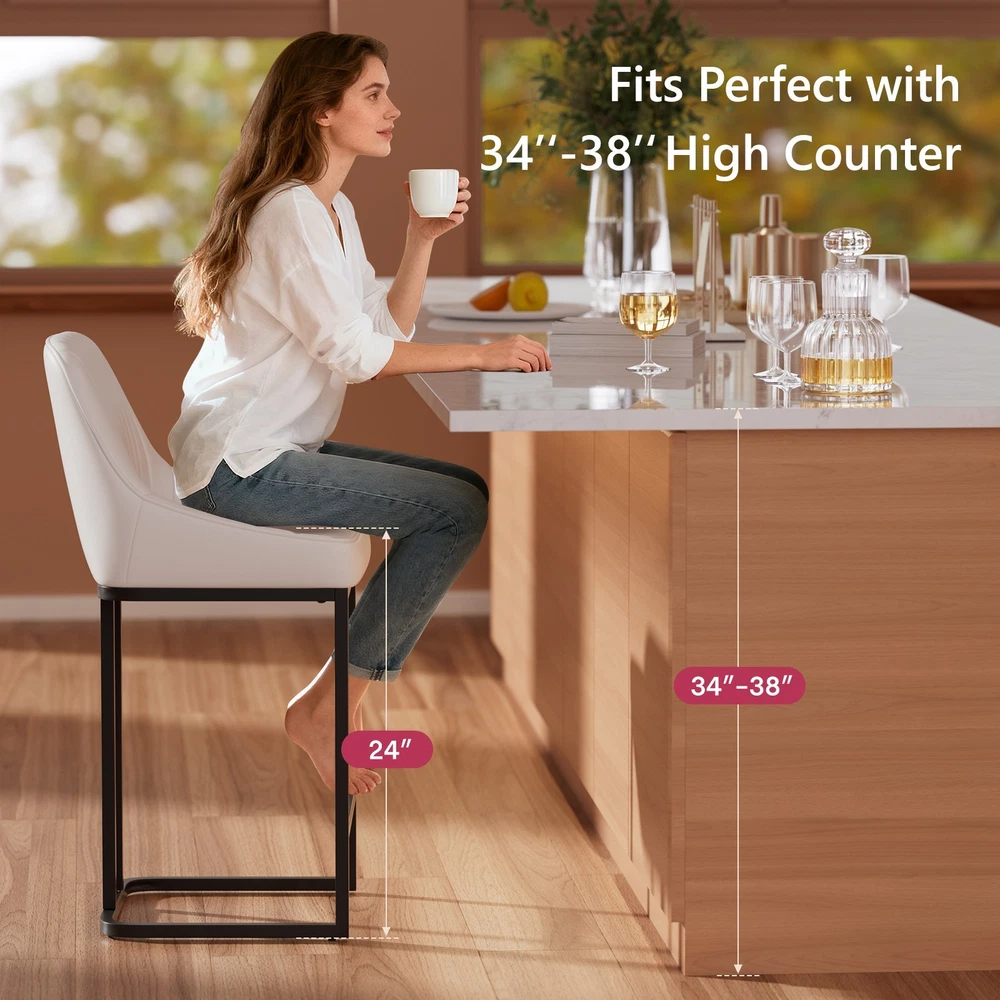 Product Details: Colors Available : White / Brown / Black Material : PU Leather + High Density Foam + Iron Frame Seat Height : 24" (Counter Height, fits 34"–38" counters) Overall Height : 35.8" Seat Width : 14.1" Seat Depth : 15.1" Backrest Height : 14.3" Cushion Thickness : 2.7" Base Width : 15.3" Weight Capacity : 300 lbs Recommended User Height : 5’0"–6’3" Frame Material : Black Powder-Coated Metal Features : Ergonomic Backrest, Padded Seat, Footrest Bar, Non-slip Pads, Easy Assembly Package Includes : 2 × Bar Stools, Tools, Instruction Manual Assembly Time : 10 minutes Key Features: Perfect Counter Height Fit – These 24-inch bar stools are designed for 34"–38" kitchen islands and counters, offering a comfortable seat height for daily dining or entertaining. Ergonomic Curved Backrest – The backrest design provides strong lumbar support, making these counter chairs ideal for long chats, breakfasts, or cocktails. Comfortable PU Leather Upholstery – Soft padded cushions wrapped in waterproof, easy-to-clean PU leather offer a smooth touch and elegant appearance. Durable Metal Frame Structure – Heavy-duty iron legs with crossbar support hold up to 300 lbs and ensure stability and longevity for home or restaurant use. Easy Assembly in Minutes – Comes with tools and clear instructions. Anti-slip foot pads protect floors while keeping chairs balanced on any surface. On Oct 16, 2025 at 02:58:28 PDT, seller added the following information: