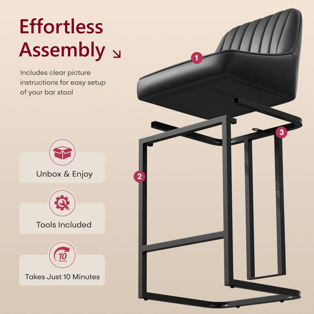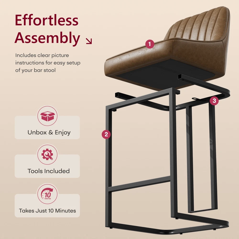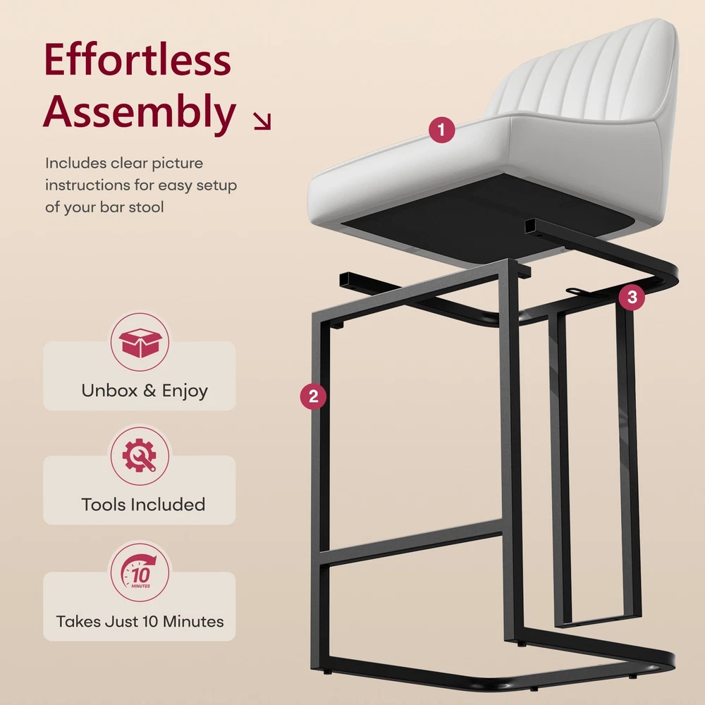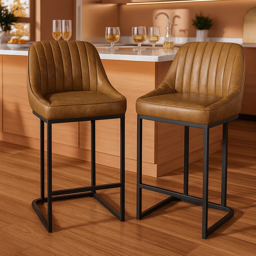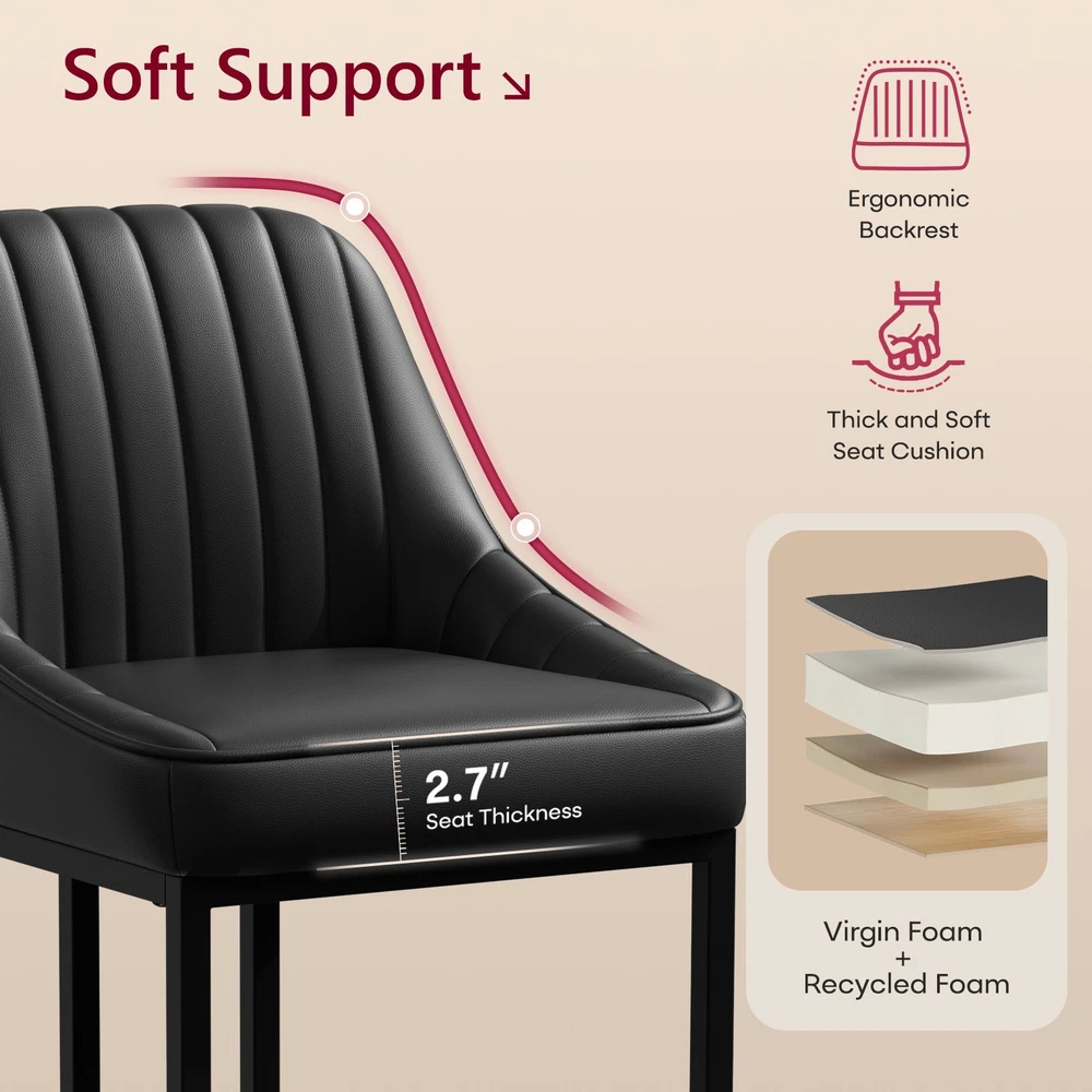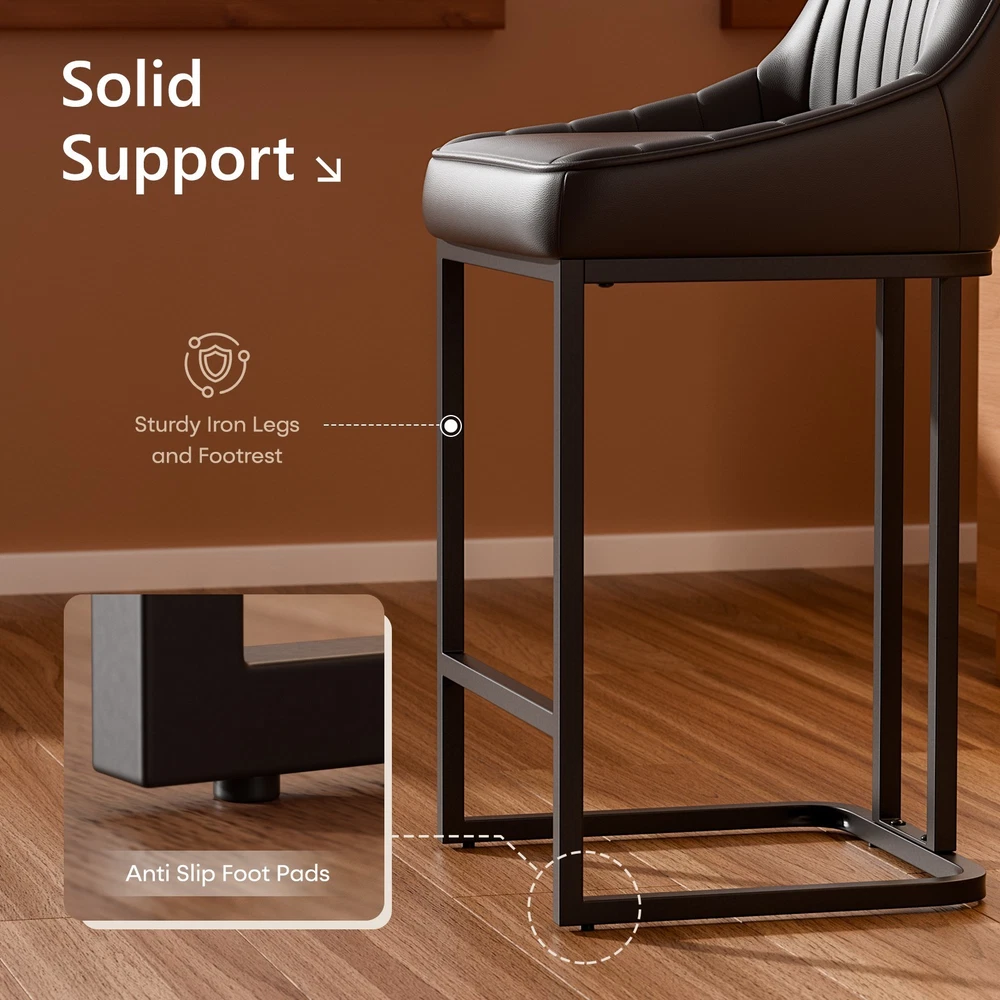 Product Details: Colors Available : White / Brown / Black Material : PU Leather + High Density Foam + Iron Frame Seat Height : 24" (Counter Height, fits 34"–38" counters) Overall Height : 35.8" Seat Width : 14.1" Seat Depth : 15.1" Backrest Height : 14.3" Cushion Thickness : 2.7" Base Width : 15.3" Weight Capacity : 300 lbs Recommended User Height : 5’0"–6’3" Frame Material : Black Powder-Coated Metal Features : Ergonomic Backrest, Padded Seat, Footrest Bar, Non-slip Pads, Easy Assembly Package Includes : 2 × Bar Stools, Tools, Instruction Manual Assembly Time : 10 minutes Key Features: Perfect Counter Height Fit – These 24-inch bar stools are designed for 34"–38" kitchen islands and counters, offering a comfortable seat height for daily dining or entertaining. Ergonomic Curved Backrest – The backrest design provides strong lumbar support, making these counter chairs ideal for long chats, breakfasts, or cocktails. Comfortable PU Leather Upholstery – Soft padded cushions wrapped in waterproof, easy-to-clean PU leather offer a smooth touch and elegant appearance. Durable Metal Frame Structure – Heavy-duty iron legs with crossbar support hold up to 300 lbs and ensure stability and longevity for home or restaurant use. Easy Assembly in Minutes – Comes with tools and clear instructions. Anti-slip foot pads protect floors while keeping chairs balanced on any surface. On Oct 16, 2025 at 02:58:28 PDT, seller added the following information: