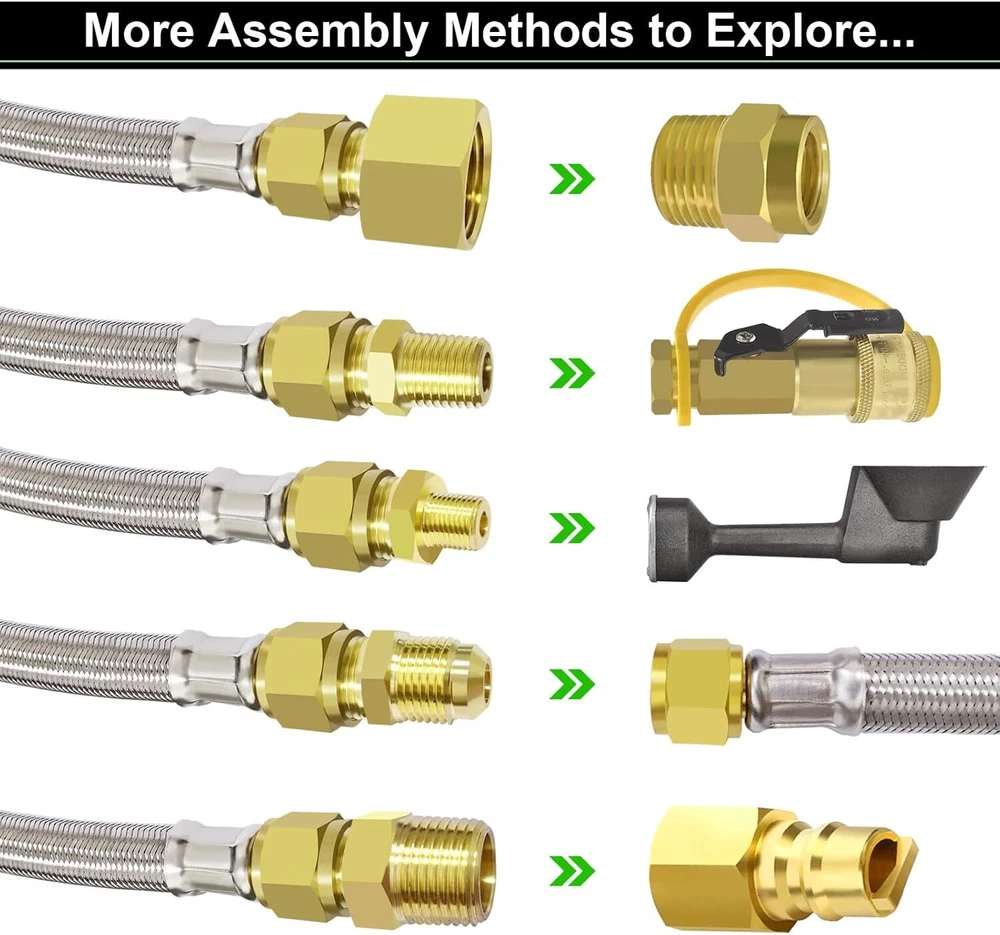 24 FT Extension-High Pressure Braided Gas Line Hose Propane Conversion Kit fo... 【MEFUN Upgraded 24 FT 350 PSI high-pressure Propane extension Hose】24ft stainless steel propane high pressure extension hose upgrade to come with powerful 6 different couplings adapter fitting: 3/8" NPT Male x 3/8" NPT Male, 1/2" Female NPT x 3/8" Flare Male, 3/8" NPT Male x 3/8" Flare Male, 3/8" Flare Male x 3/8" Flare Male, 1/4" NPT Male x 3/8" Flare Male, 1/8" NPT Male x 3/8" Flare Male, 【Premium Material】24ft 3/8" female flare fittings on both ends and 6 different types of adapters fittings kit of this 3/8" propane hose are made of 100% Solid Brass to ensure secure and durable for long-lasting to use. The 24ft 3/8” Female Flare propane hose is made of durable stainless steel braided with anti corrosion, anti-aging, air tightness, heat-resistance, flexibility features. This propane extension hose with CSA Certification, ensures air tightness and stability. 【Wide Compatibility】This 24FT 350 PSI high pressure propane extension hose has female 3/8" ends on both sides, connect an appliance equipped with a 3/8" male flare fitting. For extending the propane tank line on your LP appliance and fire pit table. Compatible with RV, gas grill, stove, propane heater, portable fire pit,griddle, propane generator, portable generator, propane smoker, burner and more. 【Standard Fittings】This 24FT 350 PSI high pressure propane extension hose with 6 different types of adapter adapters. Excellent 3/8" Propane Hose Conversion Adapter Kit for easy storage and portability, flexible use and space saving. This 12ft Braided Stainless Steel High Pressure Propane Extension Hose comes with a standard connector kit to take all your worries away. For RVs Best choice, travel trailer. 【Packaging】The kit includes: 1* 24FT 350 PSI High Pressure Propane extension Hose + 6* Brass Adapters+1* Wrench +1* Roll Sealing Tape + 1* Buckle Velcro. If you are not satisfied with the product after purchase, please contact us and we will provide a refund or replacement. Our Customer Service will solve your problems within 24 Hours. Shipping We offer FREE shipping on all orders! We ship within Three business days of payment, usually sooner. Local pickups and combined shipping options are not provided at this time. Return You can return a product for up to 30 days from the date you purchased it. Any product you return must be in the same condition you received it and in the original packaging. Please keep the receipt. Payment We accept payment by any of the following methods: PayPal Please pay as soon as possible after winning an auction, as that will allow us to post your item to you sooner! Feedback Customer satisfaction is very important to us. If you have any problem with your order, please contact us and we will do our best to make you satisfied. Contact Us If you have any queries, please contact us via ebay. We usually respond within 24 hours on weekdays. Please visit our eBay store to check out other items for sale! Thank you for shopping at our store.