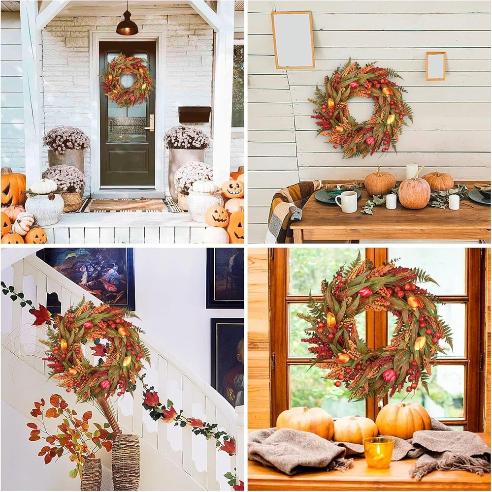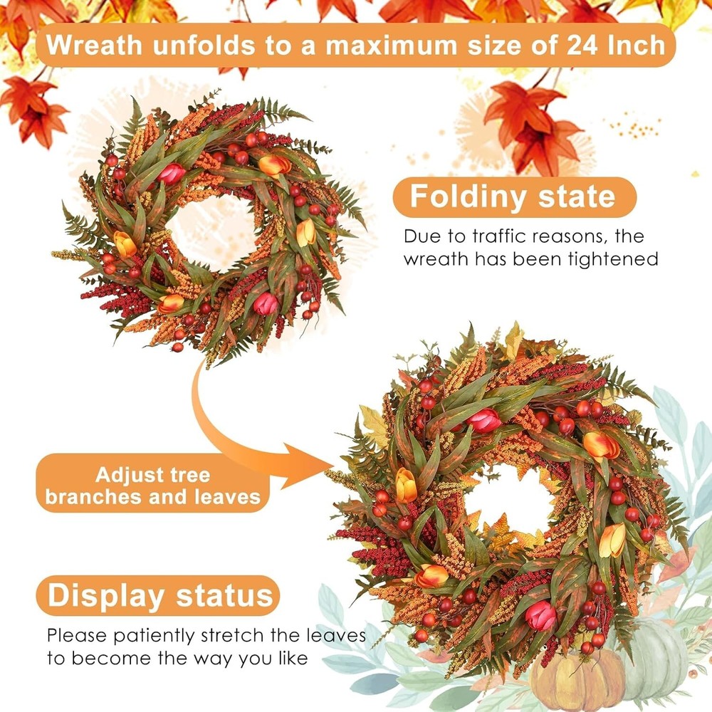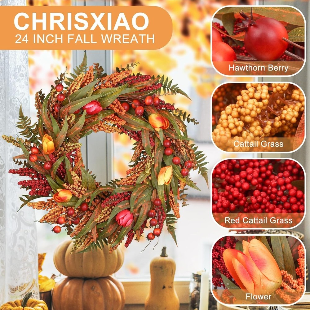 24’’ Fall Wreath - Fall Wreaths for Front Door with Foliage, Berry Cattails and Flowers for Outdoors, Indoor Walls, Windows, Holidays, Thanksgiving,Harvest Wreaths Fall Decorations Large Size fall decor:This 24 Inch fall wreath offers a commanding presence, perfect for making a seasonal statement. Its large diameter allows for a fuller design, featuring lush foliage and rich details. Natural Elements: Adorned with realistic leaves, berries,and maple leaves, oak leaves, fountain grass,, this Artificial Autumn Wreath captures the essence of the harvest season. Each element is carefully chosen to create a rich and textured design that evokes the beauty of nature. Handcrafted Durability:Handcrafted with meticulous weaving techniques, fall wreaths ensures durability and prevents elements from falling off. The expert craftsmanship secures each component firmly, providing a robust structure that holds its shape. Designed for long-lasting beauty, it maintains its elegant appearance season after season. Versatile Decor Piece: Ideal for both indoor and outdoor use, this Fall Wreaths for Front Door is perfect for your front door, mantle, or wall. Whether used as a centerpiece or hung as a welcoming display, it enhances any space with seasonal charm. Easy to Hang: Equipped with a sturdy hanging loop, this wreath is easy to display in any location. Its lightweight design ensures that it can be easily hung on doors, walls, or windows any hass Welcome to Crafts premium handmade wreaths with expert care, designed to leave a lasting impression of warmth and seasonal charm in your hom