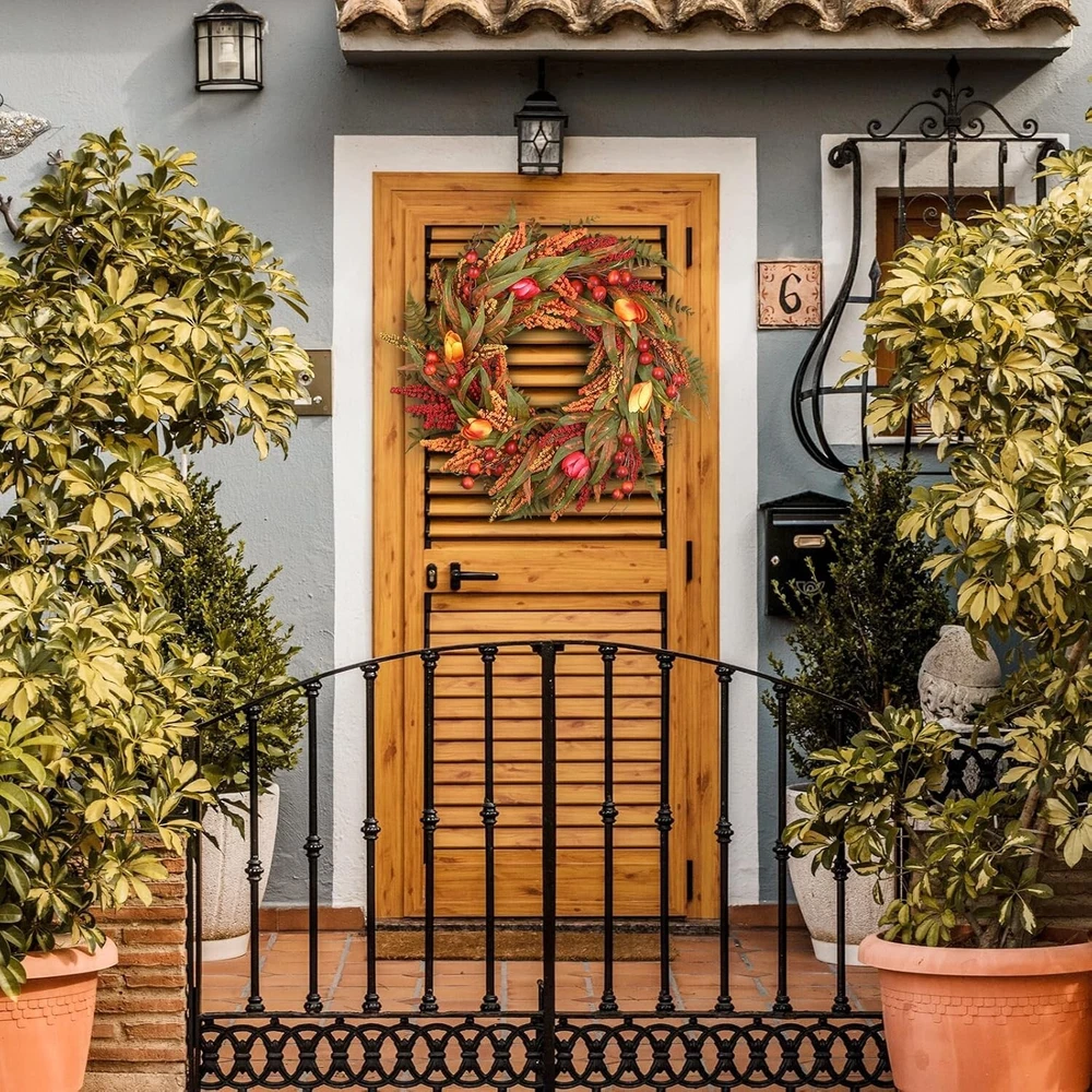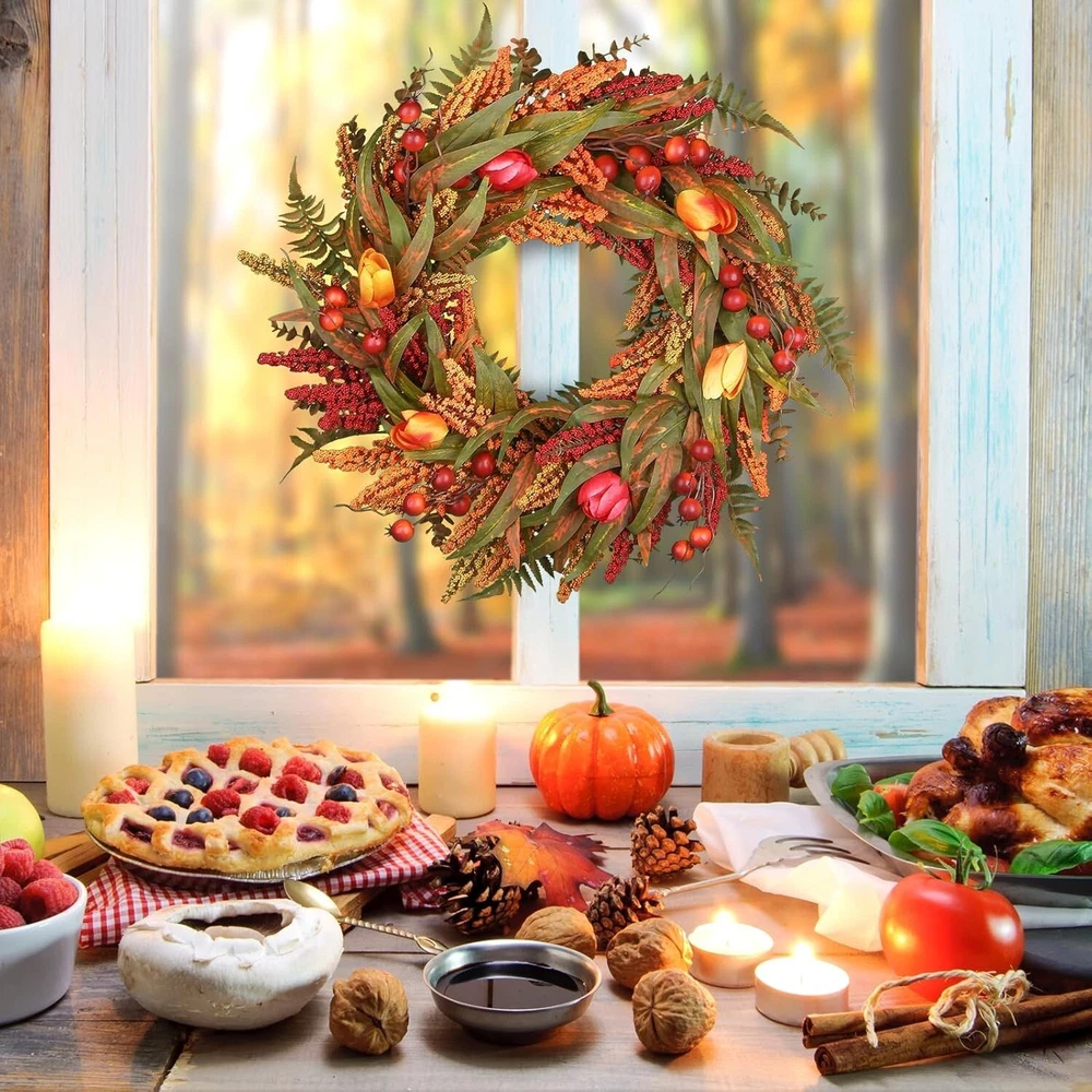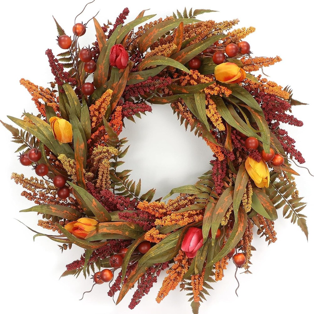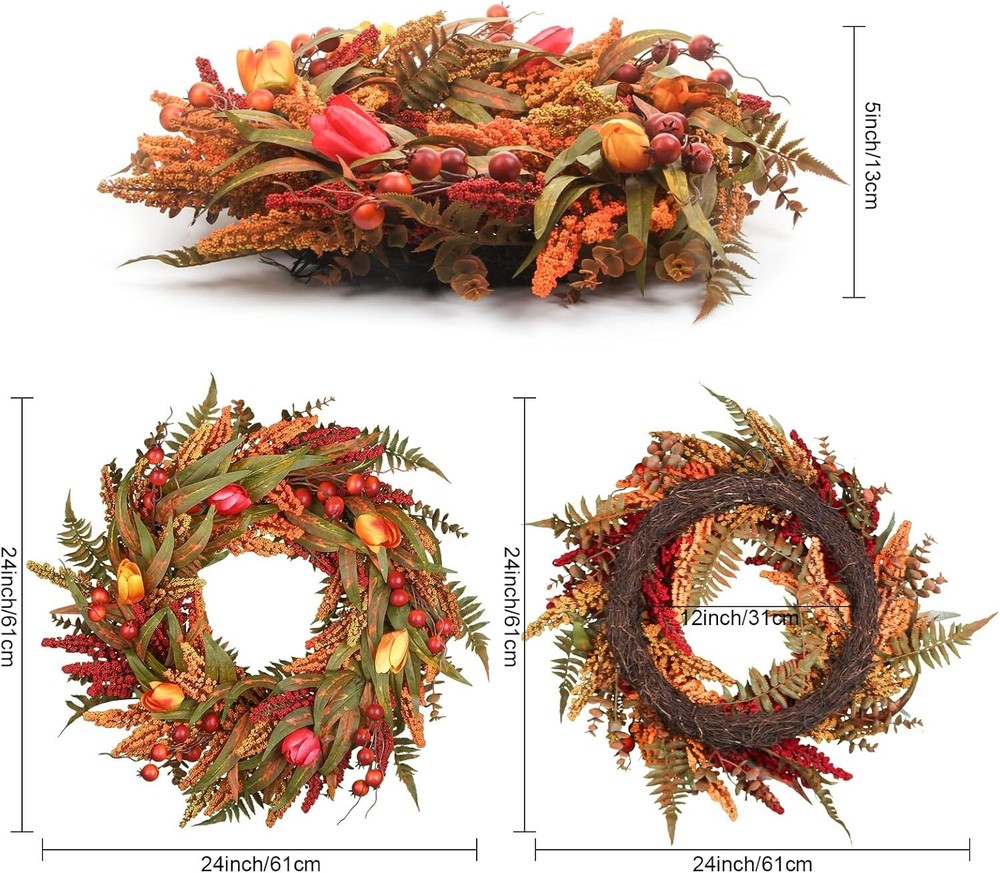 24’’ Fall Wreath - Fall Wreaths for Front Door with Foliage, Berry Cattails and Flowers for Outdoors, Indoor Walls, Windows, Holidays, Thanksgiving,Harvest Wreaths Fall Decorations Large Size fall decor:This 24 Inch fall wreath offers a commanding presence, perfect for making a seasonal statement. Its large diameter allows for a fuller design, featuring lush foliage and rich details. Natural Elements: Adorned with realistic leaves, berries,and maple leaves, oak leaves, fountain grass,, this Artificial Autumn Wreath captures the essence of the harvest season. Each element is carefully chosen to create a rich and textured design that evokes the beauty of nature. Handcrafted Durability:Handcrafted with meticulous weaving techniques, fall wreaths ensures durability and prevents elements from falling off. The expert craftsmanship secures each component firmly, providing a robust structure that holds its shape. Designed for long-lasting beauty, it maintains its elegant appearance season after season. Versatile Decor Piece: Ideal for both indoor and outdoor use, this Fall Wreaths for Front Door is perfect for your front door, mantle, or wall. Whether used as a centerpiece or hung as a welcoming display, it enhances any space with seasonal charm. Easy to Hang: Equipped with a sturdy hanging loop, this wreath is easy to display in any location. Its lightweight design ensures that it can be easily hung on doors, walls, or windows any hass Welcome to Crafts premium handmade wreaths with expert care, designed to leave a lasting impression of warmth and seasonal charm in your hom