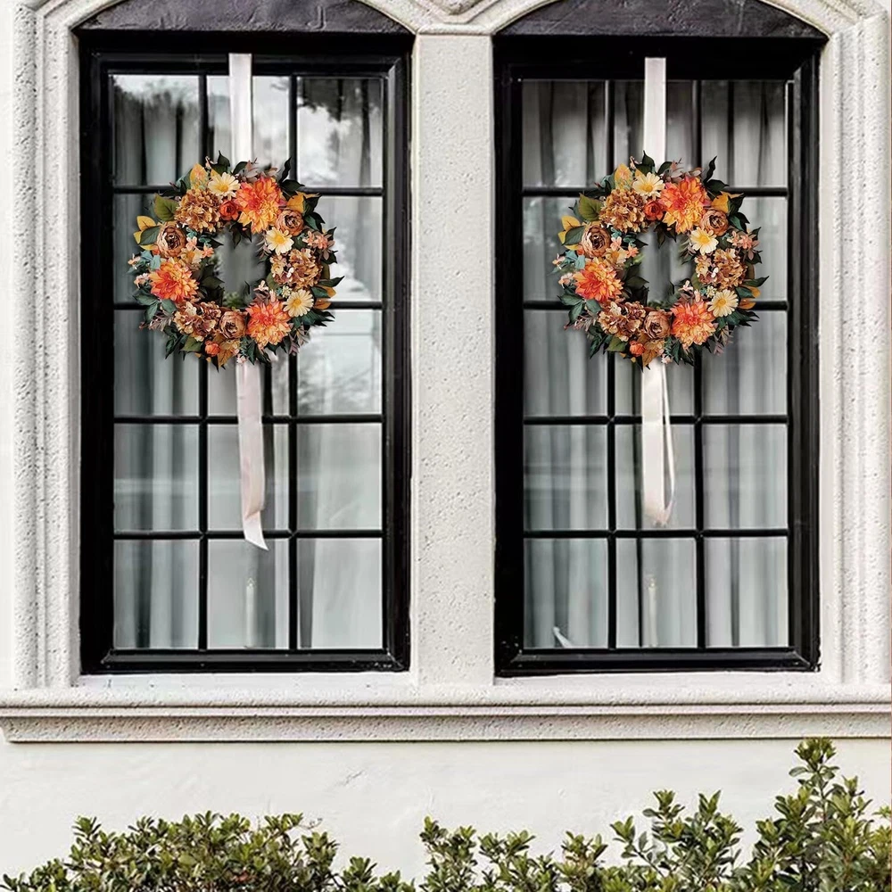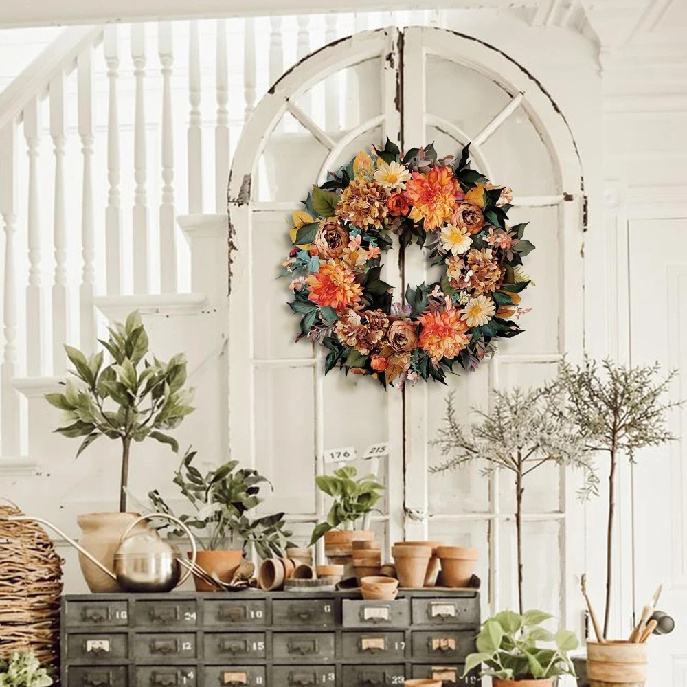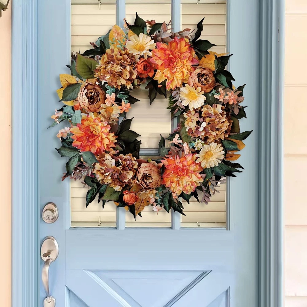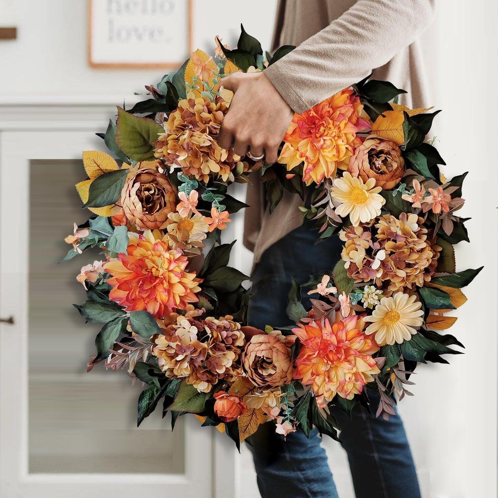 24 Inch Fall Wreath for Front Door with Vintage Hydrangea&Orange Peony and Dahlia Flowers-Fall Decoration for Home-Large Fall Decor Door Wreath for Autumn,Harvest or Thanksgiving ①【Size】24 Inch/61cm,please pay attetion how we measure the size ②【Material】Silk fall Hydrangea&Peony with vintage orange colors and yellow Dahlia Flowers,green to yellow leaves for fall decoration ③【Twig Base】The fall wreath is made of natural twig base for fall decoration ④【Decorative Wreath】Suitable to use for front door, window, fireplace, wall, porch,indoor or outdoor,fall decorations for home ⑤【Giftable】Delivered with a premium brown box,this fall wreath is ready for a sweet gifts for your family or friends 24 Inch Hydrangea Fall Wreath 24 Inch Fall Wreath for Front Door with Vintage Hydrangea&Orange Peony and Dahlia Flowers-Fall Decoration for Home