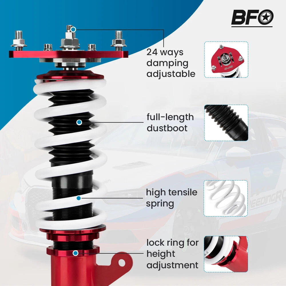carpartsharehouse Home | Contact us | Promotion Fast hipping International Shipping 30 Days Return Policy Secure Shopping 24 Level Damper Adjustable Coilovers Shocks Kit For Mitsubishi Eclipse 2000-2005 Most Competitive Price Manufacturer We know our products Easy Return Quick, Simple Guaranteed Fitment Always the correct part DESCRIPTION Features Ride Height Adjustable - Drops From 1 to 3 Inch From Factory Ride Height Twin-Tube System for Comfortable Ride on Streets High Rigidity 55CrSi Steel Cold-bent Coil Springs Anodized Shock Body With Anti-Corrosion Coating Adjustment spanner wrenches and pictured hardware are included Full 1 Year Limited Warranty From Date of Purchase Application For Mitsubishi Eclipse (3rd-Gen) D53A/D52A 2000-2005 Specification Front top mounts: Pillow ball Rear top mounts: Rubber Damping: No adjustable damper force Front Spring Rate: 10 kg/mm (556 lbs/in) Rear Spring Rate: 7 kg/mm (392 lbs/in) Spring length Front: 200mm Spring length Rear: 200mm Coilover overall length Front: 430mm-570mm Coilover overall length Rear: 480mm-540mm Adjustable Height: Yes lowering 1" to 3" Shock Type: Twin tube Spring Preload: 7-10 mm Color: Red body with white spring Gross weight: 25kg Package size: 63*51*21cm Package included Complete coilovers 2 front and 2 rear A pair wrench for height adjustment. ★ 30-day Money Back & 12-Month Replacement Guarantee. Please feel free to contact us if there is any question. Height Adjustable Lowering Kit; Independent Ride Height And Spring Tension Settings; High Rigidity 55CrSi Steel Cold-bent Springs; Anodized Shock Body With Anti-Corrosion Coating; Full 1 Year Limited Warranty From Date Of Purchase. SHIPPING US Domestic Shipping Notice - All items will be dispatched within 24hrs(Mon-Fri) Our carrier collects all the parcels at 4:30am PDT, any payment paid after 5:00am PDT will be shipped the next day at 4:30am PDT. If you paid Item Shipped On Est.Delivery Time Before Apr. 1st at 4:30am Apr. 1st at 5:00am Apr. 5th - Apr. 7th After Apr. 1st at 4:30am Apr. 2nd at 5:00am Apr. 6th - Apr. 8th If our estimated delivery time and eBay’s are contradictory,please refer to the standard delivery time of ours. Estimated Delivery Time From To Service Est.Delivery Time US US UPS or Fedex Ground 3-5 Business days Outside of US DHL FedEx 4-7 Business days Please provide the following shipping information for your order Otherwise your shipment will be deferred. We are not responsible for any shipping lost caused by wrong shipping information International Shipment For international shipment, we do not cover any import taxes or duties. Import tax is charged by the government, not us. Our item price and shipping cost do not include any import tax which will be charged by the shipping company when you got the parcel. Please be noted that is not the extra shipping fee. WARRANTY We aim to provide you the good buying experience, 30 days return policy is offered in our store. Please follow our return policy before you return any item(s): If you are unhappy with your purchase for any reason, you can return it to us in an un-used condition in the original packaging within 30 days of purchase and we'll give you a refund or exchange. The refund/Exchange will not include postage/eBay costs. Please note you MUST contact us to obtain a Return Authorization Number before returning any part. Any parcel without the Return Authorization Number will be rejected. If your item is faulty or was incorrect, you must contact our sales representative before returning the parcel and we will endeavour to solve the problem effectively. Video or picture is required to show the item condition before we issue the Return Authorization Number. All VehicalPartsLearder products have 2 year warranty (unless otherwise stated) Important notice: 1. Any returned item(s) without Return authorization number will be rejected. 2. Please return your item(s) in original packaging and ensure that all packages are securely wrapped 3. We will not accept responsibility for loss or damage of goods during transit, please ensure that the insurance cover option is taken where possible 4. Upon receipt, all products will be inspected at our discretion in 3-5 business days. Then, the updated result will be informed. If you have made a mistake on purchase and wish to cancel the order before it is dispatched please contact us by ebay message as quickly as possible. Note: All parcel will be collected by carrier at 8:00am on Monday to Friday. F A Q Will this fit my car? We have used the eBay compatibility list as a guide for buyers to use, but the eBay data system is not accurate and incomplete sometimes. Please make sure you have read through the whole listing and paid attention to “note” and “notice”. If there is any uncertain, please use the eBay message to check with our sales first. How much does delivery cost and how long will it take? You can check the delivery cost in the listing “Shipping and payments” section by selecting your country and entering your zip code. If it is not specified, please provide us your shipping address and zip code via eBay message. For UK domestic shipping, the delivery time is around 2-3 business days. The international shipment delivery time is around 4-7 business days. What payment methods do you accept? We currently only accept payment via PayPal. You can also use PayPal as a guest and pay using a debit or credit card. When will my order be dispatched? We will arrange the shipment in 1 business day after the payment is cleared. The tracking number will be updated on eBay in 24 hours after the shipment. Please notice that there is no shipment during weekend and holidays. Can I amend my order? Sorry no. Once the payment is cleared, we cannot amend any item(s), quantities, or add or remove items. We are also unable to change the delivery address. Therefore, please double check all the order information before making payment. What do I do if I have not received my order? Ple