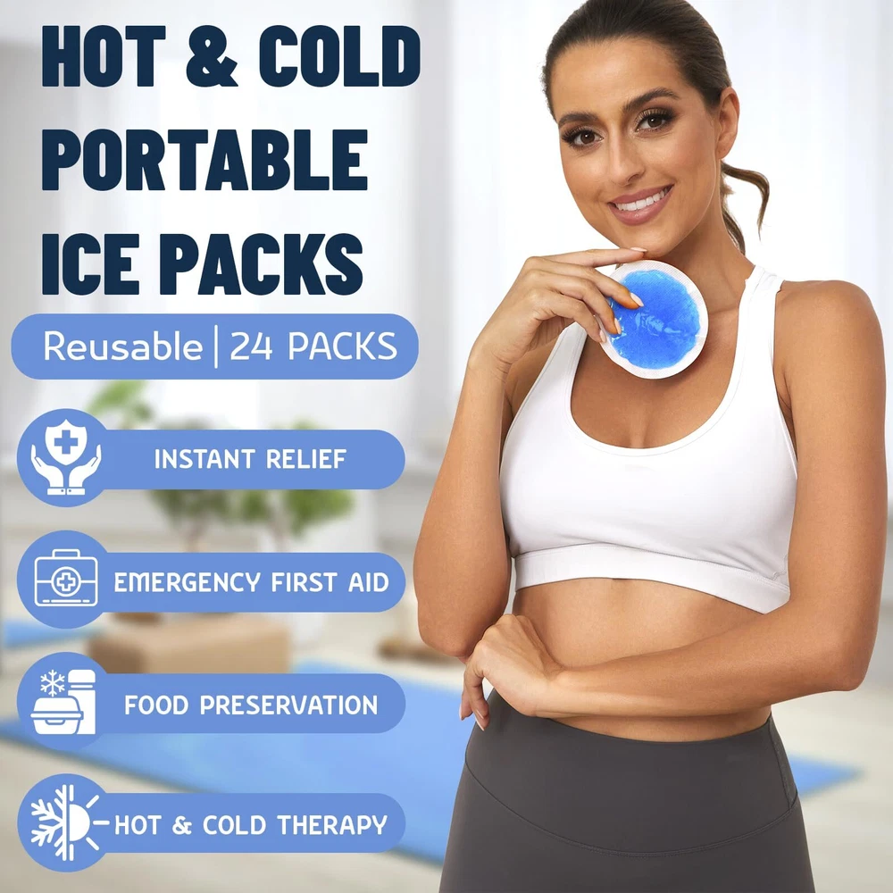 24 Packs Soft Small Ice Packs [WARM TIPS] The best cold compress effect is achieved by freezing in the refrigerator for more than 2 hours. If a hot compress is needed, please note that it should be heated in the microwave for less than 5 seconds and not continuously. [STILL SOFT AFTER FROZEN] High-quality soft gel can keep our small ice packs soft and close to the skin after freezing in the refrigerator for several hours, so that the gel small ice bags can be fully close to the areas that need cold compress, providing better family first emergency care. [WHAT WILL YOU GET] 24 Pack portable gel ice pack can be easily replaced at any time, meeting the daily needs of a large family. You can freeze them in the refrigerator for easy access at any time, it can be used in the office, school, home, or outdoor activities. [SAFETY & HIGH QUALITY] The two sides are made of different materials, providing you with dual temperature requirements. One side is made of PVC material, which is colder, while the other side is made of non-woven fabric, which is more suitable for sensitive areas such as the forehead and face. This kids ice pack the non-woven fabric material on the back will not tear and has good sealing performance to prevent internal gel leakage. The interior is filled with high-quality non-toxic gel. These gel ice bags remain soft and flexible after being frozen in the refrigerator for several weeks. The small ice pack will be very cold, but it will not freeze like water. [COMPACT & PORTABLE] The size of this small ice pack is designed for families, and the 4-inch reusable circular portable cold pack is more suitable for families. Whether it is for relieving eye fatigue, breastfeeding, wisdom tooth surgery, injections, cosmetic surgery, bumps, bruises, small wounds, fever, headache, hot and cold compress for various joint areas, or bento cooling. [AFTER-SALES SERVICE] If you have any questions about the product or encounter any problems with your order, please feel free to contact us. Our service team will provide you with professional solutions.