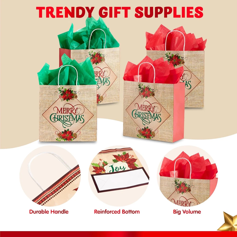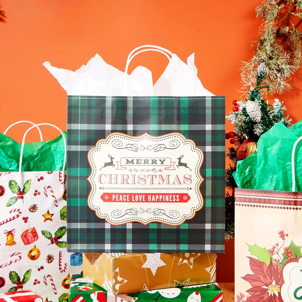 SUPER VALUE PACK. Our present bag set includes 24 pcs Christmas themed scene paper gift bags which comes with 12 Christmas themed designs. Each gift bag measures 12 x 12 x 5 inches. UNIQUE AND FESTIVE. Our Christmas Favor Bags fun added and excitement to Christmas parties with these festive designs of holiday party favor bags. Your guests will be delighted just to fill these goody bags with Christmas goods, candies or small toys during Christmas parties, events, baby showers, weddings, kids parties, and more! ENDLESS FUN. These present Bags are a beautiful and practical solution for carrying all your Christmas candy, ornaments and holiday party favors this season. Perfect gift wrapper for events like Christmas parties, family gatherings, gift stuffing, and gift wrapping for Christmas parties during winter holidays and more! PREMIUM QUALITY. Crafted from high-quality materials makes wrapping perfectly quick and easy. Child Safe: Non-Toxic. Meet the US toy standard. Safety test approved. EXCEPTIONAL CARE: We're big on the little things. That's why customer safety and satisfaction are at the heart of everything we do. Contact us if products don't meet your expectations. We look forward to ensuring every moment brings you joy. Product Description