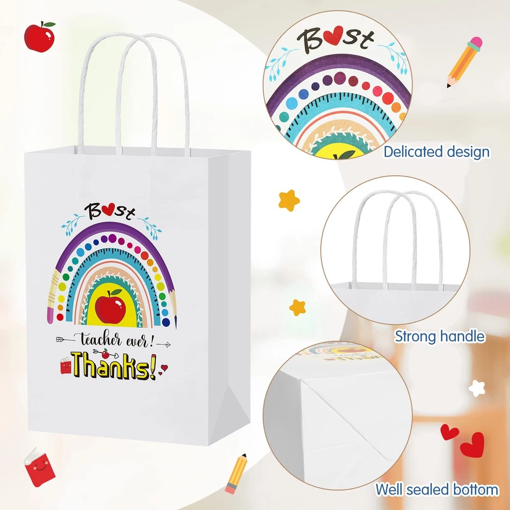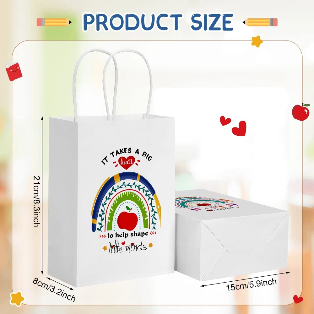 Features: Joyful atmosphere: These cute and funny designed paper party favor bags can put you in a better mood, you can use them to wrap gifts and make the person who receives them happier and feel the sincere thought Easy matching: bags design is simple and easy to match with various gifts, the colors are coordinated and will not stand out, not only as teachers appreciation day gift for teachers, but also for birthday gift packaging, candy bags, shopping bags, etc. Specifications: Material: kraft paper Color: as shown in the picture Size: approx. 15 x 8 x 21 cm/ 5.9 x 3.15 x 8.3 inch Package includes: 24 x Paper bags Notes: Manual measurement, please allow slight errors on size. The color may exist a slight difference due to different screen displays. The words printed on the product are not as trademark or brands, just for decoration. What You Will Receive: you will receive 4 styles, 6 of each style, a total of 24 teacher gift bags; Enough quantity and a variety of styles to meet most of your usage needs; The interesting design on the paper bag can make your mood happy and add fun to your life Size and Material Information: the size of each gifts bags is approx. 15 x 8 x 21 cm/ 5.9 x 3.15 x 8.3 inch; And we apply high impact kraft paper material to make our beautiful bags, the surface is very smooth, better aesthetics, very suitable as a teacher's appreciation day gifts to show sincere thanks and gratitude Reusable and Reliable: our teacher graduation gifts bags are made of high impact kraft paper, which is safe to use; Our products are also suitable for many occasions and can meet most of the daily storage and packaging of small items Gift Bags for Teachers: end of the year gifts for teachers bag printed with the words “T takes a big heart to help shape little minds, Teach Love Inspire, Teaching is a work of heart, Best teacher ever! Thanks!”, which are suitable for teachers of all subjects; You can give them to your male teachers, female teachers, Chinese teachers, English teachers, math teachers, etc Practical and Wide Application: teacher appreciation gift bag with thin paper are accessible for wrapping teacher appreciation day gifts such as flowers, chocolates, scarves, books, clothing, jewelry, home accessories or a range of small items; You can apply this teacher gift bag to wrap or package your gift to make your gift interesting
