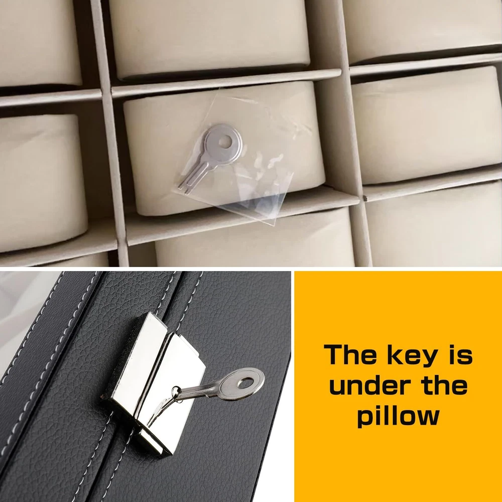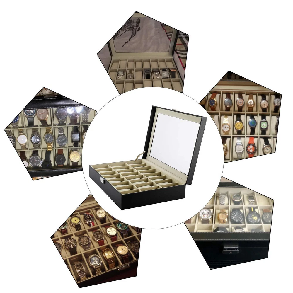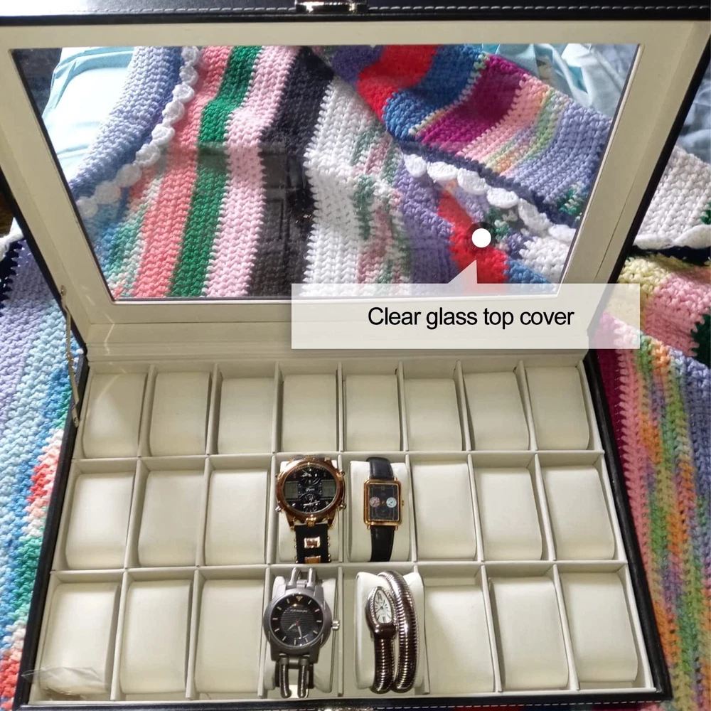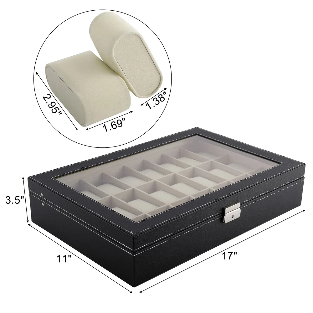 【Huge Watch Cases for Men】 Watch box Size: 17 x 11x 3.5inch (L x W x H); Glass Window Size: 14.4 x 8.8inch (L x W); Removable Pillow Size: 2.95 x 1.69 x 1.38inch (L x W x H) 【Big Capacity】Watch cases for men 24 slot is with the new sleek modern looking watch box with an amazing 24 slots,perfect box to store all watches.Watch box organizer for men fits bigger/bulkier watches as well.Perfect for multiple watch storage. 【PU Leather&Clean Crisp Lines 】Watch and jewelry organizer for men is very nice case,It's PU leather material and it is stylish,good design.The stitching is fabulous.Craftsmanship is durable and well done. 【Clear Glass Top】Your watches will be protected well from dust and scratching for the transparent glass cover. Watch holder organizer for men make it easy access to select which watch you want to wear. 【Lockable】Tips: The key is under the pillow.watch cases for men stores 24 of your watches safely in a sturdy box! Watch storage case for men has a lock and a key to keep out the curious children,you can put all your watches in a safe place.It is a case which also holds your larger dial watches securely. 【Removable Pillows】The pillows are removable for making enough room for your kinds of accessories,cuff links,earrings,bracelets,bangle bracelets,necklaces,zippos,brooches are all ok. 【Easier to be Organized】watch box is excellent for your watches.The rolls allow the watch to stay in shape, otherwise the strap gets twisted and often cracked. But using this it stays in nice comfy shape. And it’s keep all the watches in place, it is a gorgeous watch case that organizes your collection. 【Nice Presentation】Watch box for men is nice for a simple display for multiple watches.If you have the watches,then this is the display case you need. The display is useful for multiple watches.It beautifully displays whatever is placed inside. 【Great Father's Day Gift】 It would make a very nice gift for a man.This is a great watch box for any watch collector.Good box for a watch lover.Item works well as a gift for A friend who collects watches. 【Package Included】1 x Watch Display Case; 24 x Removable Pillow; 1 x Key.