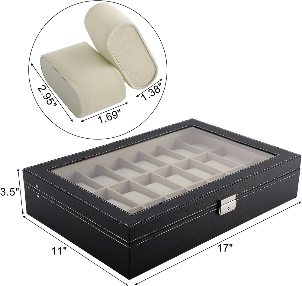 Menu Other Items Feedbacks About Us Contact Us Add To Favorites 24 Slot Watch Box for Men,Watch Cases for Men,Watch Display Case,Glass Top,Pu Leather Display Storage Collection Organizer Jewelry Case Watch Organizer with Removable Pillows 【Huge Watch Cases for Men】 Watch box Size: 17 x 11x 3.5inch (L x W x H); Glass Window Size: 14.4 x 8.8inch (L x W); Removable Pillow Size: 2.95 x 1.69 x 1.38inch (L x W x H) 【Big Capacity】Watch cases for men 24 slot is with the new sleek modern looking watch box with an amazing 24 slots,perfect box to store all watches.Watch box organizer for men fits bigger/bulkier watches as well.Perfect for multiple watch storage. 【PU Leather&Clean Crisp Lines 】Watch and jewelry organizer for men is very nice case,It's PU leather material and it is stylish,good design.The stitching is fabulous.Craftsmanship is durable and well done. 【Clear Glass Top】Your watches will be protected well from dust and scratching for the transparent glass cover. Watch holder organizer for men make it easy access to select which watch you want to wear. 【Lockable】Tips: The key is under the pillow.Artilife watch cases for men stores 24 of your watches safely in a sturdy box! Watch storage case for men has a lock and a key to keep out the curious children,you can put all your watches in a safe place.It is a case which also holds your larger dial watches securely. 【Removable Pillows】The pillows are removable for making enough room for your kinds of accessories,cuff links,earrings,bracelets,bangle bracelets,necklaces,zippos,brooches are all ok. 【Easier to be Organized】Artilife watch box is excellent for your watches.The rolls allow the watch to stay in shape, otherwise the strap gets twisted and often cracked. But using this it stays in nice comfy shape. And it’s keep all the watches in place, it is a gorgeous watch case that organizes your collection. 【Nice Presentation】Watch box for men is nice for a simple display for multiple watches.If you have the watches,then this is the display case you need. The display is useful for multiple watches.It beautifully displays whatever is placed inside. 【Great Father's Day Gift】 It would make a very nice gift for a man.This is a great watch box for any watch collector.Good box for a watch lover.Item works well as a gift for A friend who collects watches. 【Package Included】1 x Watch Display Case; 24 x Removable Pillow; 1 x Key. Product Description Your Watches Have Home Now.Good Capacity of 24 Slots,Nice Storage Case! Perfect for Multiple Watch Storage Artilife watch box to keep all your watches in one place and boxed up. This watch box has 24 slots so it easily stores all of your watches. The build and the glass quality is good,also holds your larger dial watches securely. Artilife watch holder capacity is good. It stores 24 of your watches safely in a sturdy box! It is perfect for just holding. Awesome watch storage It accommodates various size watches Especially fit your BIG watches perfectly. Perfect box to store all watches It's nice roomy very spacious for bigger watches. Great and Attractive Watch Case,Beautiful Watch Box! The Stitching is Fabulous. Clean crisp lines It's stylish Good design Outstanding PU leather Craftsmanship is durable and well done. Nice Presentation,Great Display for All of Your Watches! It is Very Nice for a Simple Display for Multiple Watches. If you have a lot of watches,then this is the display case you need.Transparent display window put your collection on display.Clear glass window are great,it protects and shows them off beautifully. The case is sturdy and nicely made and the glass shows the watches nicely.You will love the way every size of your watches fits nicely on the pillows, displaying them so you can easily grade one with no issues. Clear glass top is very amazing. The light comes through the glass top to keep the solar watches charged. Great showcase- protects and displays nicely Very nice watch display case A box for keeping and displaying watches in Great display for all of your watches Easy Acess to select which watch you want to wear Well made.Provides a lovely display. The display is useful for multiple watches. It has a lock and key. Easier to be Organized. Very flexible storage space with divided into 24 compartments for well classify your watches and keep them in order.The rolls allow the watch to stay in shape, otherwise you always felt the strap gets twisted and often cracked. But using this it stays in nice comfy shape. And it’s keep all the watches in place. Great solution for clutter. Easily see each watch to choose which one to wear. Good box for a watch lover. If you have a huge watch collection,then this is what you need. A gorgeous watch case that organizes your collection. Lockable? YES! It Has a Lock to Keep Out the Curious Children.TIP:The key is under the pillow You can put all your watches in a safe place. This is an absolutely gorgeous watch case. If you were constantly misplacing your watches or the kids would play with them since they would be around the house. No more of that now that this organizes your collection. Artilife box is not just nice looking but adds a little security, has a lockable storage organizer with a clear top.It easily holds your larger watches as well easily and looks wonderful. Watch Box Size: 17 x 11x 3.5inch (L x W x H) Glass Window Size: 14.4 x 8.8inch (L x W) Removable Pillow Size: 2.95 x 1.69 x 1.38inch (L x W x H) Each Compartment Size: 3.54 x 1.97x 1.69inch (L x W x H) All the slots have a removable pillow for your watch with a lining keeping your watches safe and snug. Tips: The key is under the pillow. The Pillows are Removable. It Beautifully Displays Whatever is Placed Inside. The pillows are removable for making enough room for your kinds of accessories,it is ok for any of the following items. Cuff links Earrings Bracelets Bangle bracelets Necklaces Zippos Brooches Artilife Watch Box Works Well as a Father's