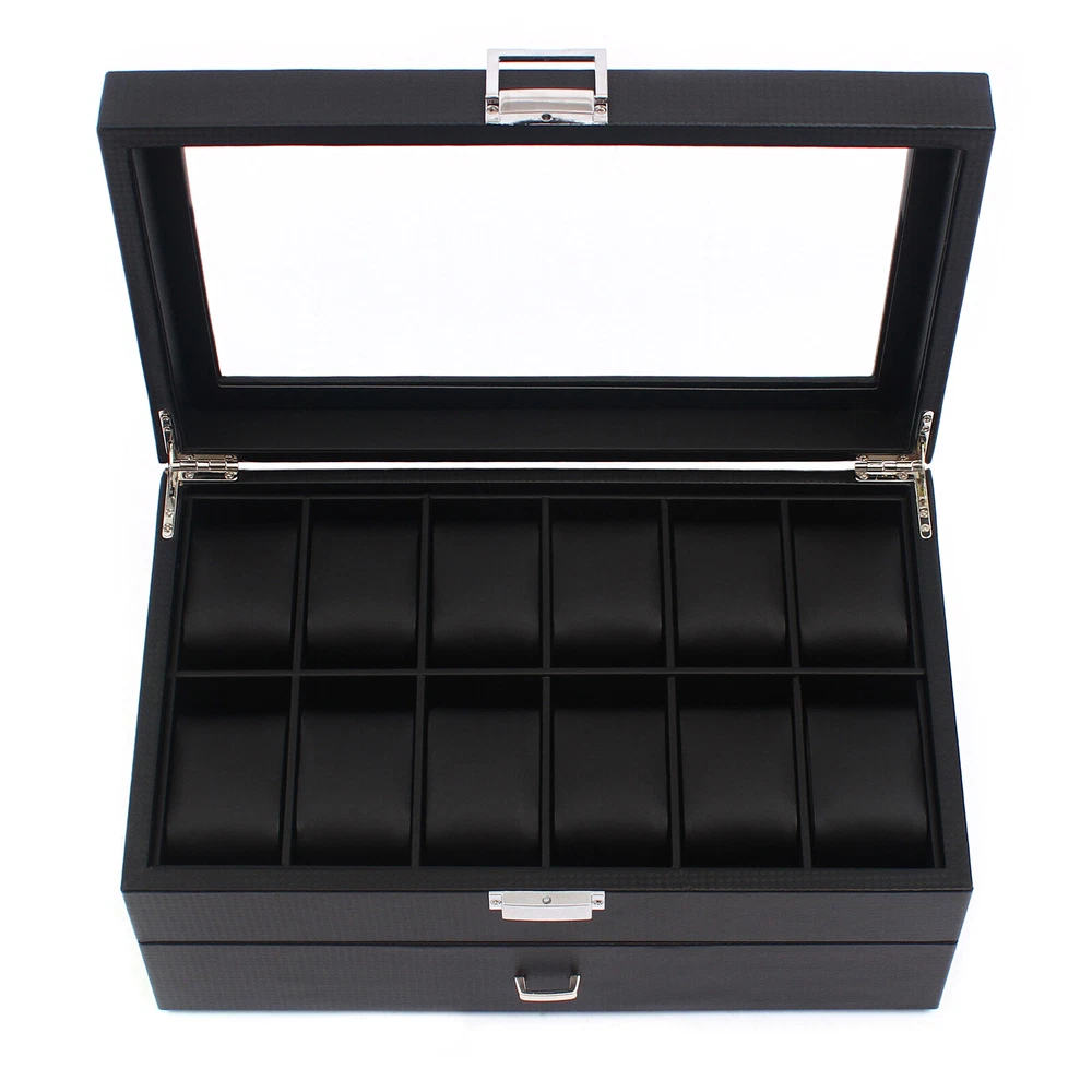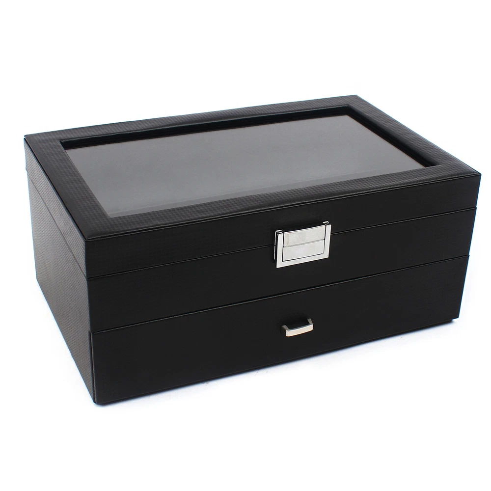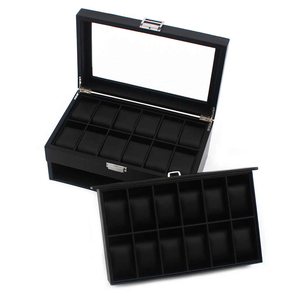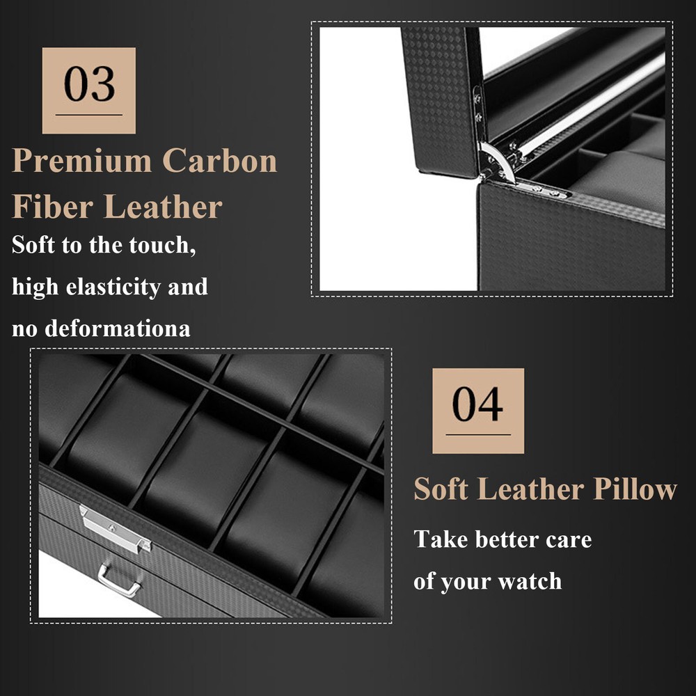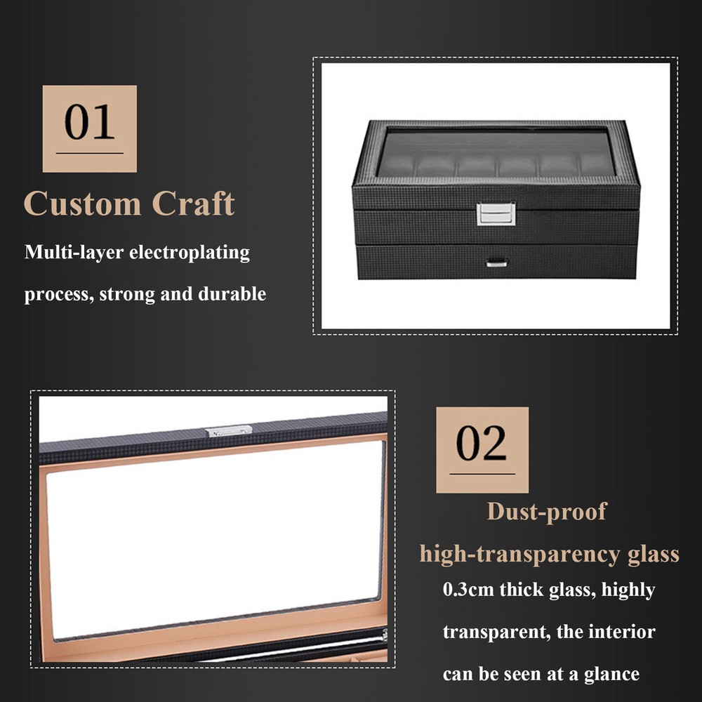 24 Slots Mens Watch Box Case Organizer Watches Jewelry Storage With Valet Drawer Watch Box 24 Mens Case Glass Top Black and Display Organizer Lockable Description The watch box is made of high-quality wood, carbon fiber, glass, plastic, and zinc alloy, which is strong, durable, and not easy to deform. It has two layers with a total of 24 compartments and a lot of storage space, which can meet your daily storage needs. Specification Color: Black Material: Wood, Carbon Fiber, Glass, Zinc Alloy Pillow Inner Material: Plastic Number of Compartments: 24 Shape: Rectangular Mounting Type: Freestanding Closure Type: Electroplated Latch Number of Drawers: 1 Net Weight: 3.4kg/7.5lbs Package Weight: 3.7kg/8.1lbs Product Size: 34*21*14.8cm/13.4*8.3*5.8inch Package Size: 34.5*23.5*17.5cm/13.5*9.2*6.8inch Package Included 1* Watch Box Details Exquisite Workmanship: This is a carefully crafted watch box. The premium carbon fiber grain and fine workmanship give it a luxurious texture. Dust-proof Design: The top lid and drawer can prevent dust from entering, which can keep the interior clean to save you a lot of cleaning time. High Light-transmitting Glass: The high light-transmitting glass at the top of the watch box provides a clear view of the watch's storage position and also allows for a better display of your watches. So you can easily find the watch you want. Good Materials: The watch box is made of high-quality wood, carbon fiber, glass, plastic, and zinc alloy, which is strong, durable, and not easy to deform. Good materials can extend its service life. Delicate Designed Pillow: The surface of the pillow is made of soft carbon fiber, which is anti-slipe and comfortable to touch so that the watch is better cared for. Compartment Design: This watch box has 2 layers of compartments for classified storage. This can make the space neater. You can easily find the watch, bracelet, necklace, earring, ring, and brooch you want. Large Storage Space: This product has two layers with a total of 24 compartments and a lot of storage space, which can meet your daily storage needs. Versatile: This product can be used to store not only watches in the first layer but also other items inside the second one. It is versatile and can meet your daily needs. Beautiful Appearance: The luxurious black casing with silver locking clasp gives the box a stylish, classic look. The black lining shows off the luster of your watch even better. A Good Gift: This watch box is an ideal gift for your mom, wife, husband, daughter, or girlfriend. It will be a practical and memorable gift. Key Features A Handle: There is a handle on the outside of the drawer for easier opening and closing. Electroplated Latch: The electroplated latch can prevent corrosion and rust, so it's durable. You can use it for a longer time. Guaranteed Customer Service: We aim to provide quality products and services. If you have problems, please feel free to contact us. We will reply and solve the problem for you as soon as possible. Application: It can be used to store watches, bracelets, necklaces, earrings, rings, brooches, and other accessories . It is also a great gift for your mom, wife, husband, daughter, or girlfriend. Notes Please allow the slight color difference caused by the shooting light and 1-3cm error due to manual measurement, and make sure you do not mind before ordering. Payment Delivery details Terms of sales About us Contact us Payment We accept ebay payment 。 Fees such as import duties, taxes are not included in the item price or shipping costs. These charges are the buyer's responsibility. Delivery details Shipping: 2-9 working days to: USA Terms of sales We maintain high standards of excellence and strive for hundred percent customer satisfaction. Feedback is very important to us. We hope that you contact us immediately before you give neutral or negative feedback, so that we can address your concerns. It is impossible to address issues if we do not know about them! About us Your satis faction is our ultimate goal. We work hard to earn your trust and future business. Our certified technicians have tested each item before shipping. The unit comes with 1 year limited warranty on all manufacturing defects. a) If you receive a defective item, you may return it or ask for a discount. Please contact us within 14 days after you receive the package. b) What you returned must be intact and in its original packaging as re? u. Customer is responsible for shipping costs of the returned item. c) We will cover the cost of shipping back t with the shipping rate indicated in the registration page. We will send you a new unit or refund the full payment you paid. Thank you. Contact us Business Hour Business Hour: Monday To Friday: 8:30 AM to 5:00 PM (Beijing China time) Due to time zones, our reply to your questions may not be immediately. But within above working time, we will reply your email within 24 hours. If it's non-workdays, please kindly be patient and wait till Monday. Please contact us with ebay message. Please feel free to contact us if you have any questions. Monday To Friday: 8:30 AM to 5:00 PM (Beijing China time) Due to time zones, our reply to your questions may not be immediately. But within above working time, we will reply your email within 24 hours. If it's non-workdays, please kindly be patient and wait till Monday. Please contact us with ebay message. Please feel free to contact us if you have any questions.