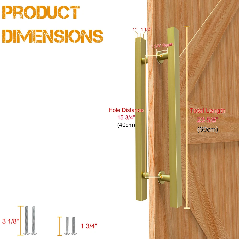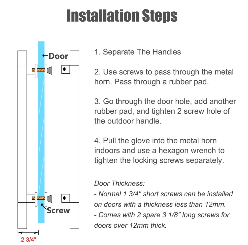 【24 inch Modern Door Handle】Hole distance of handle is 15 3/4 inches. Hole diameter: 1/2 inch. Please pay attention to the size of the door and the dimensions of the handle before purchasing. 【 Durable 304 Stainless Steel 】door pull handle is made of quality 304 stainless steel alloy material (0.7mm wall thickness). 【 Lockless Handle 】This door handle does NOT lock, typically together with dead bolt lock, code lock or keyed lock. 【 Easy Installation 】 Coming with an allen wrench, cross screwdriver and spare long screws. Longer screws make the handle fit most doors. 【 For Any Scene And Various Doors 】Contemporary door handles are perfect for being used at front entry gate, shower glass door, sliding barn door, interior and exterior door.
